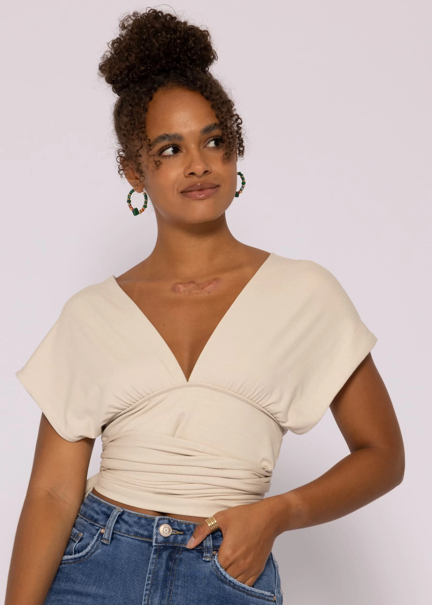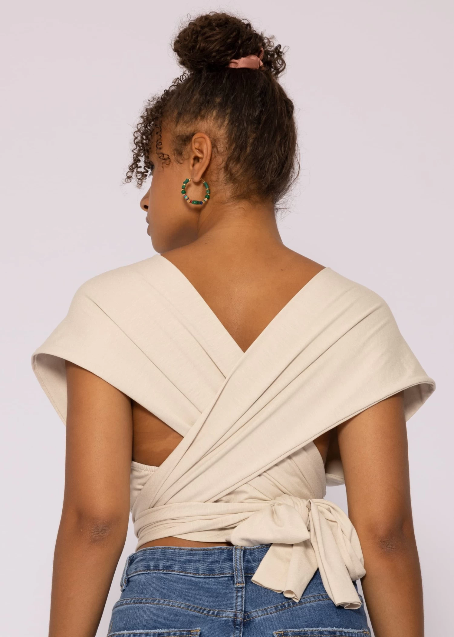 Ein Jersey-Top, bei dem der obere Teil auf verschiedene Arten getragen werden kann. Die 2 breiten Bänder kannst du nach Herzenslust an deinem Körper drapieren und hast immer wieder einen anderen Look. Empfohlen bis Größe 38