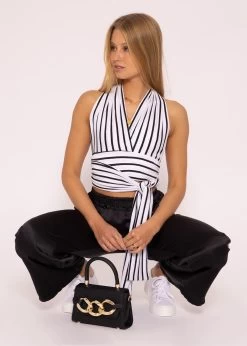 Multiway-Top in Schwarz/Weiß gestreift. Bei diesem weichen, angenehmen Jersey-Top kann der obere Teil auf verschiedene Arten getragen werden. Die 2 breiten Bänder kannst du nach Herzenslust an deinem Körper drapieren und hast immer wieder einen anderen Look. Ob als schulterfreies-, rückenfreies-, schulterbedecktes-, Wickel-, Neckholder- oder One-Shoulder-Top, du kannst mit verschiedenen Bindetechniken herumspielen, um deinen eigenen individuellen Look zu kreieren. An sommerlichen Tagen kannst du es ganz einfach im Alltag mit Shorts oder Musselin Pants tragen. Auch für festliche Anlässe eignet es sich optimal, indem du es elegant bindest und mit einem langen Rock kombinierst. Empfohlen bis Größe 38