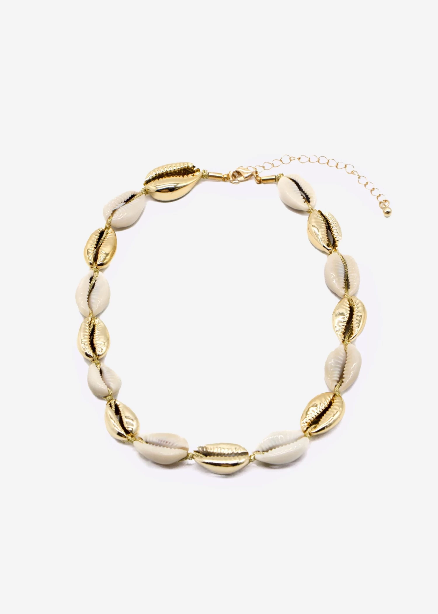 Halskette aus Muschelperlen und Baumwollgarn. Es ist mit einem Karabinerhaken zu schließen und ist individuell verstellbar.