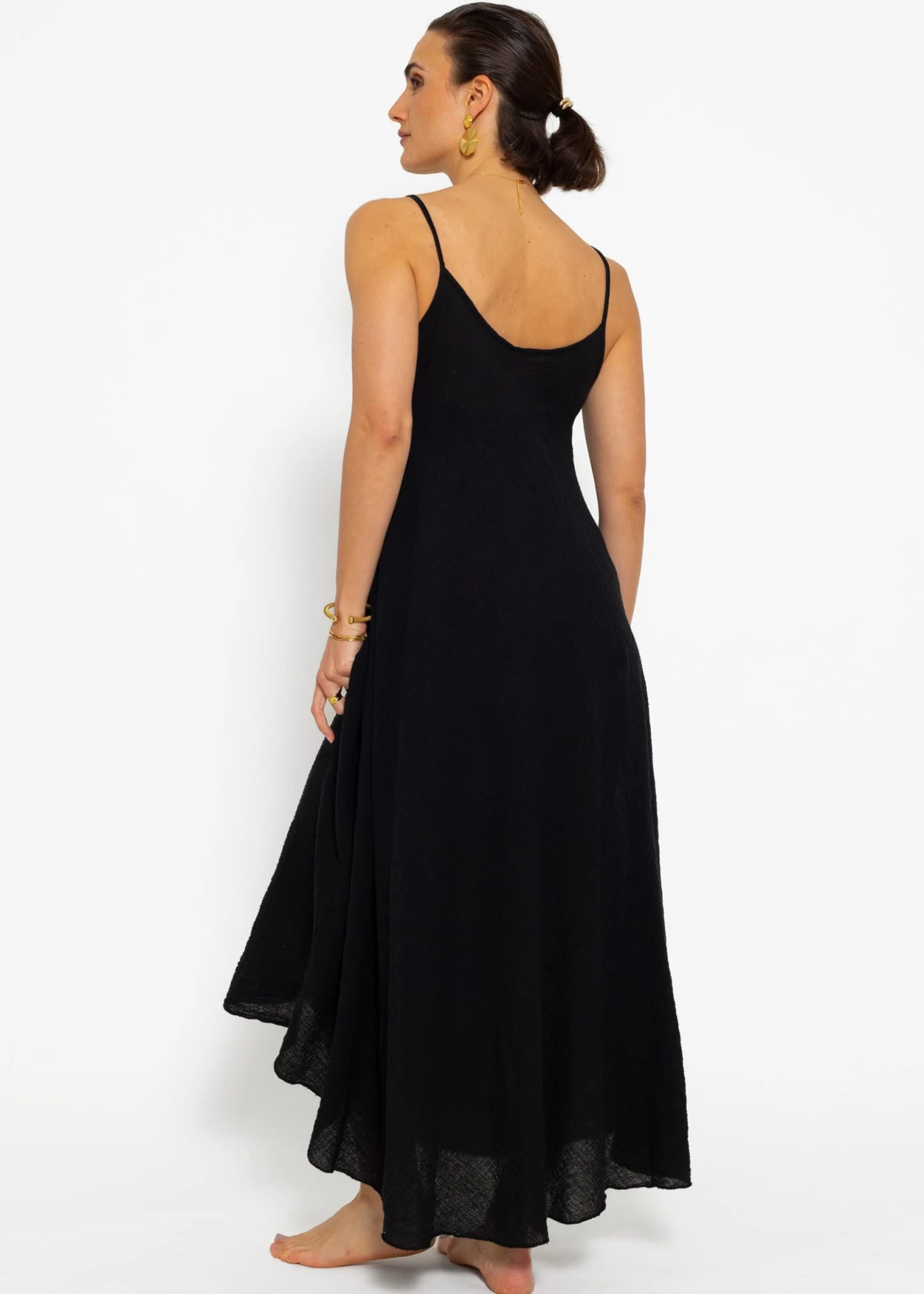Dieses Musselin Maxikleid vereint natürliche Eleganz mit fließender Anmut und bietet einen Look, der gleichzeitig ausdrucksstark als auch mühelos ist. Das Design zeichnet sich durch seine leichte Transparenz aus, die eine sinnliche Note verleiht, ohne dabei zu viel zu enthüllen. Das Modell besitzt zarte Spaghettiträger, einen weiten Rundhalsausschnitt sowie eine lockere, leichte Passform. Die sanft fließende Silhouette wird von dem feinen Stoff umspielt, der bei jeder Bewegung eine bezaubernde Dynamik erzeugt. Dieses Kleid ist ein vielseitiges Stück, dass zu verschiedenen Anlässen getragen werden kann – von einem Strandspaziergang bis hin zu einem sommerlichen Abendessen.