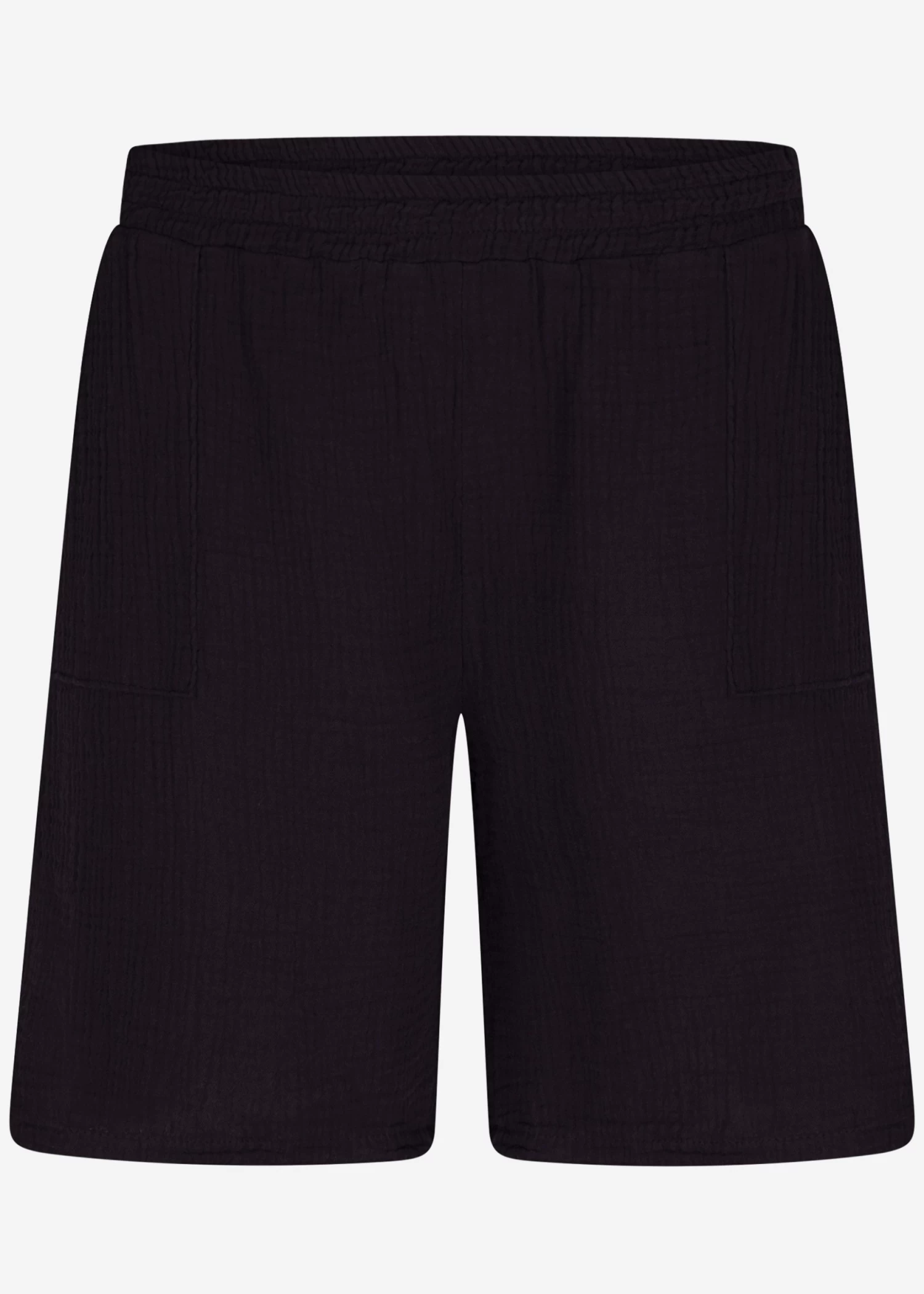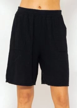Das schwarze Modell wurde aus dem beliebten Musselin gefertigt und hat einen Gummibund. Akzentuierte Taschen geben den Bermuda-Shorts einen lässigen Look.