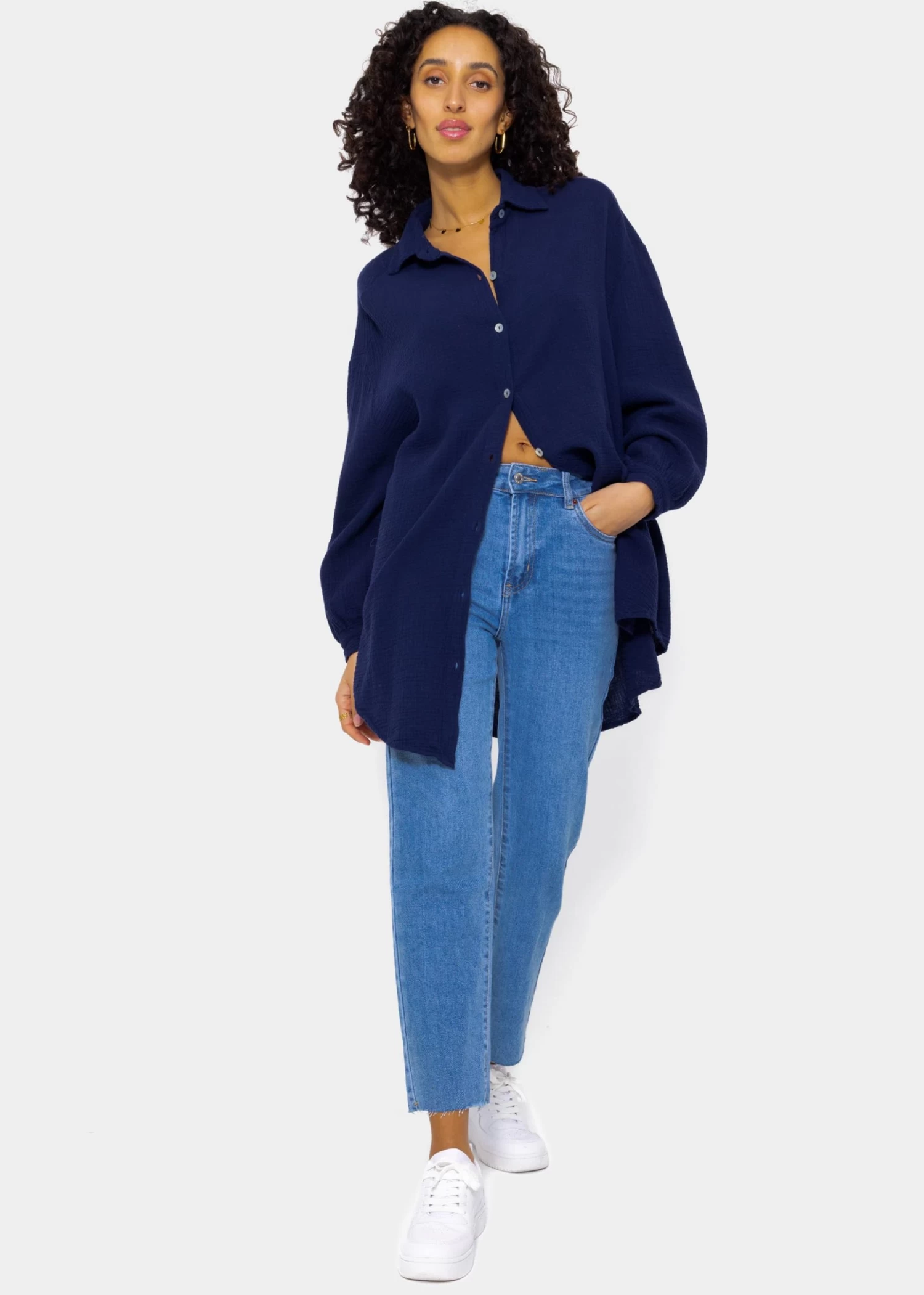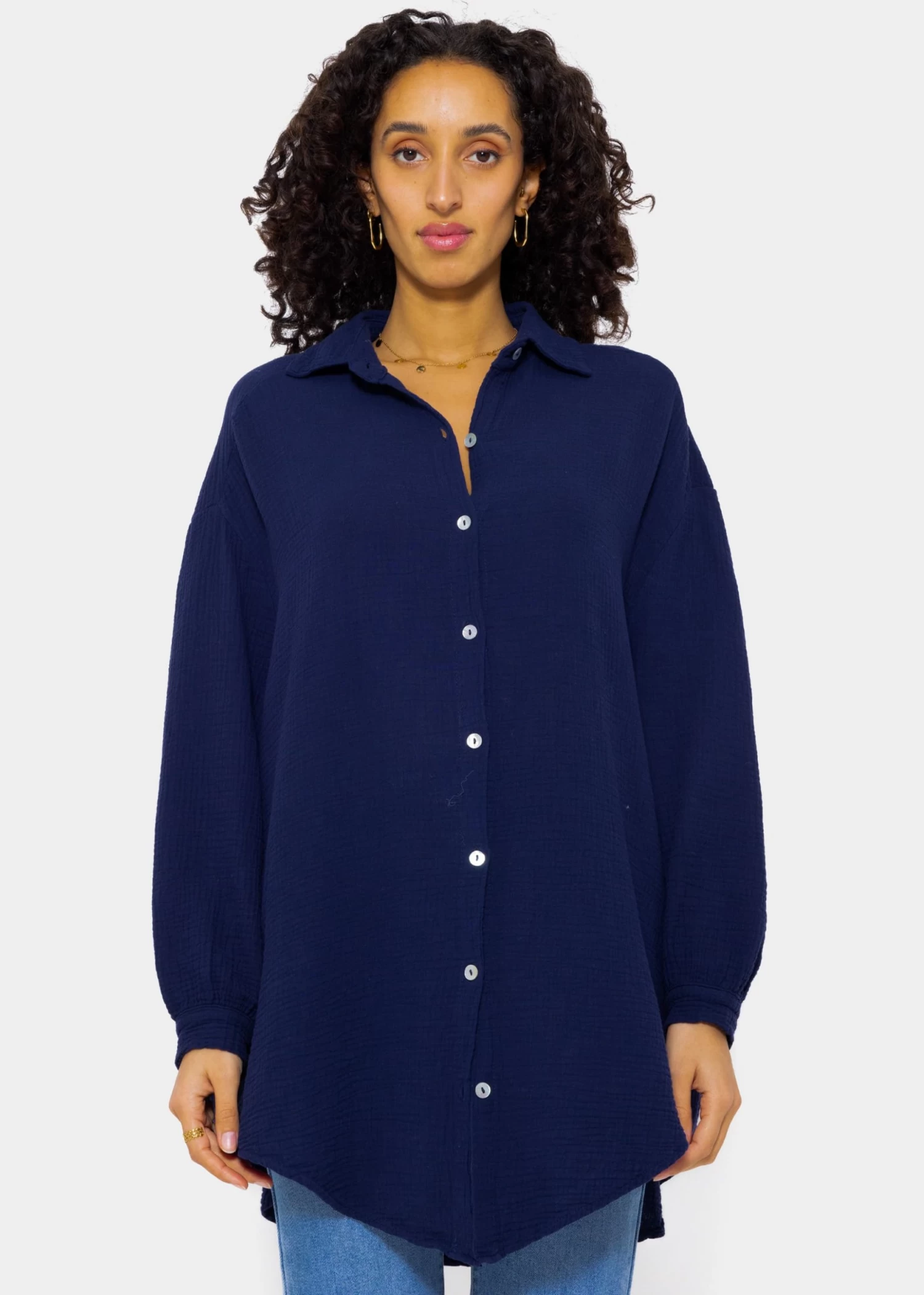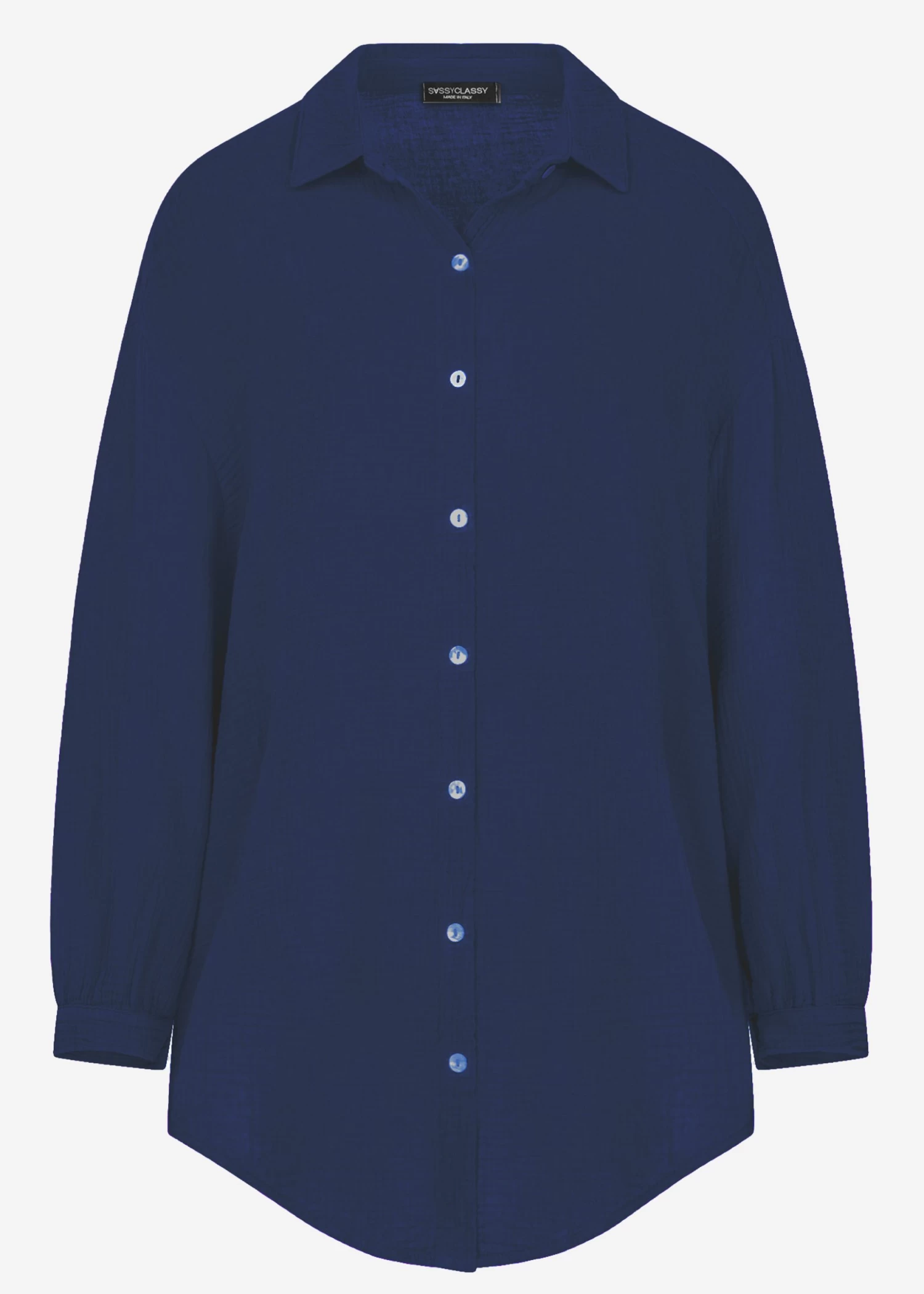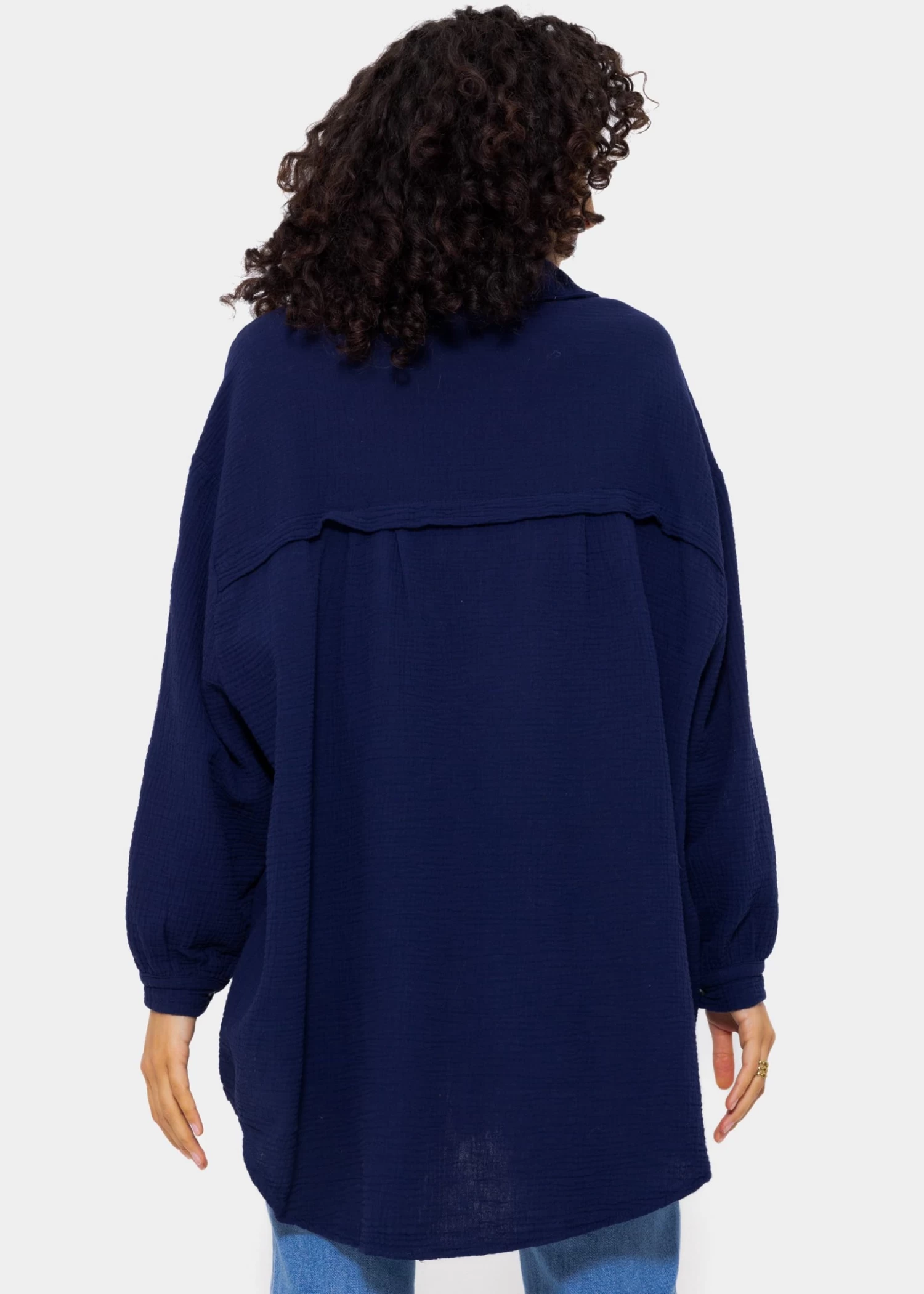 Locker fallendes Blusenhemd in Dunkelblau aus leichtem, hochwertigem Baumwoll-Musselin mit Perlmuttknöpfen. Bei diesem Modell handelt es sich um die lange Variante unserer Musselinbluse. Die stylische Longbluse besteht aus dem super soften, angenehmen und atmungsaktiven Trendstoff Musselin und ist daher ein absolutes Must-Have. Sie ist schön oversize geschnitten, fällt hinten etwas länger als vorne und besitzt überschnittene Schultern, wodurch sie ihren lässigen Look erhält. Der Kragen, der Knopfverschluss, Manschetten an den langen Ärmeln sowie die querlaufende Falte am Rücken verleihen der Musselinbluse besondere, liebevolle Details und geben ihr einen eleganten Touch. Sie ist ein treuer Begleiter für jede Jahreszeit und du kannst sie vielseitig kombinieren. Trage sie klassisch als Bluse, offen als Jacke oder Cardigan-Ersatz über einem Top, als Kleid, unter einem Pullover für einen zeitlosen Layering-Look oder einfach trendig geknotet mit tiefem Ausschnitt über einen schönen Spitzen-BH. Dieser raffinierte Allrounder kommt in Einheitsgröße und wird bis Größe 48 empfohlen