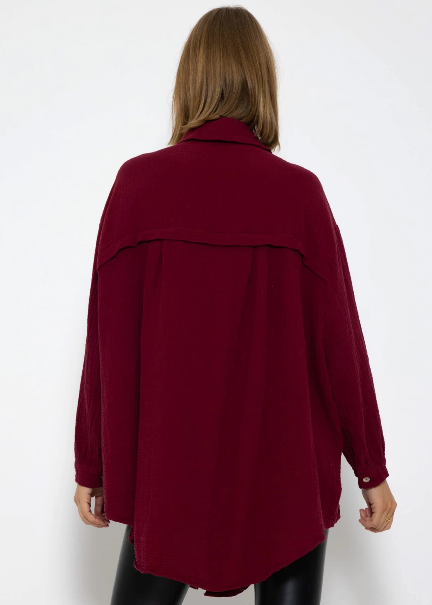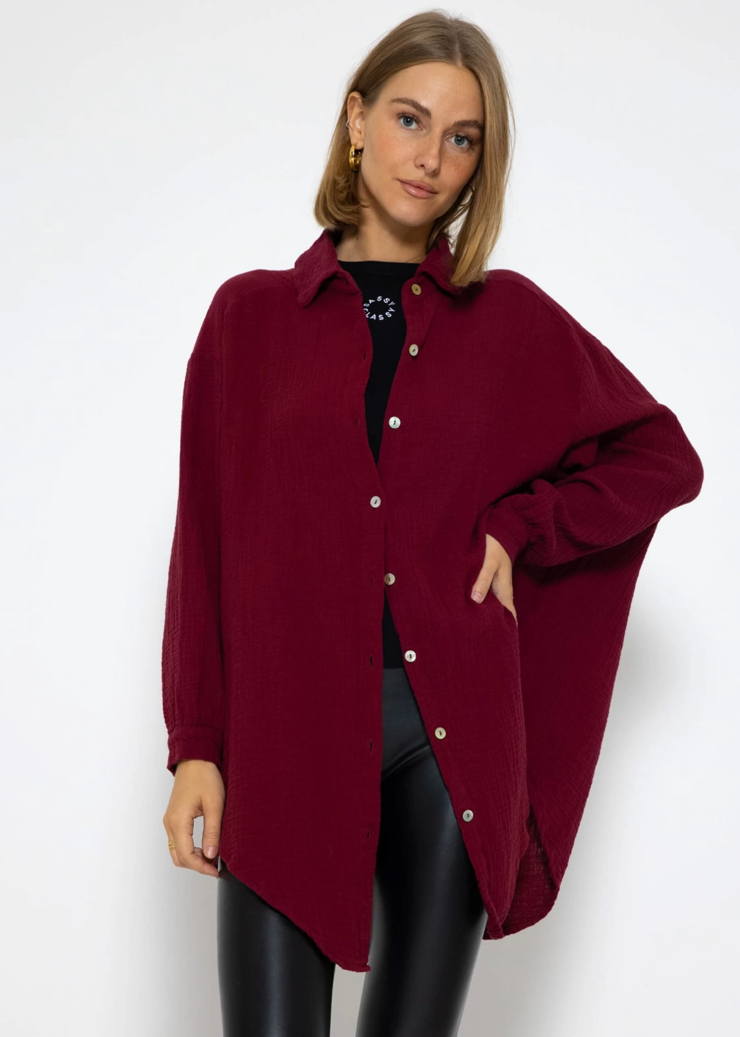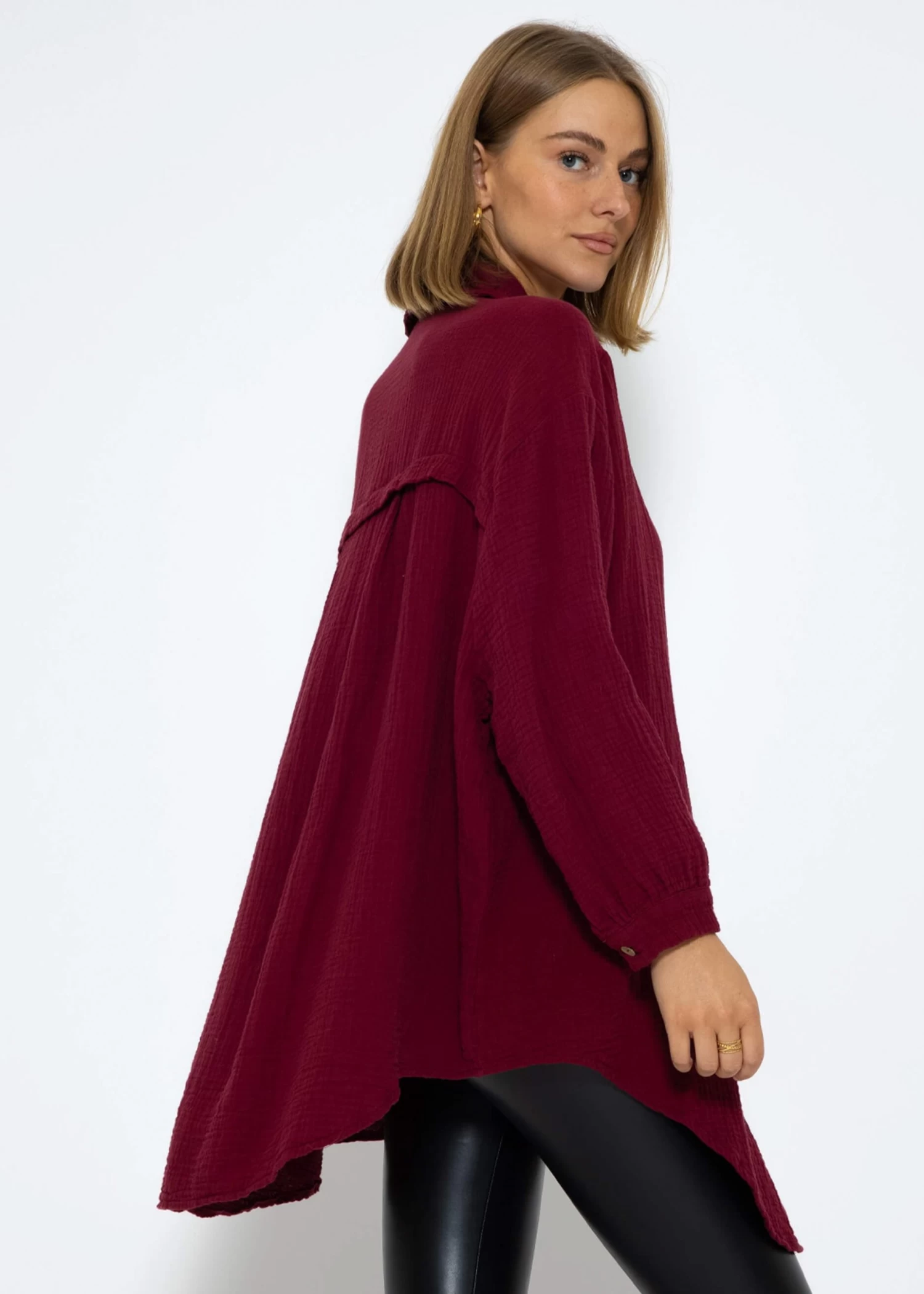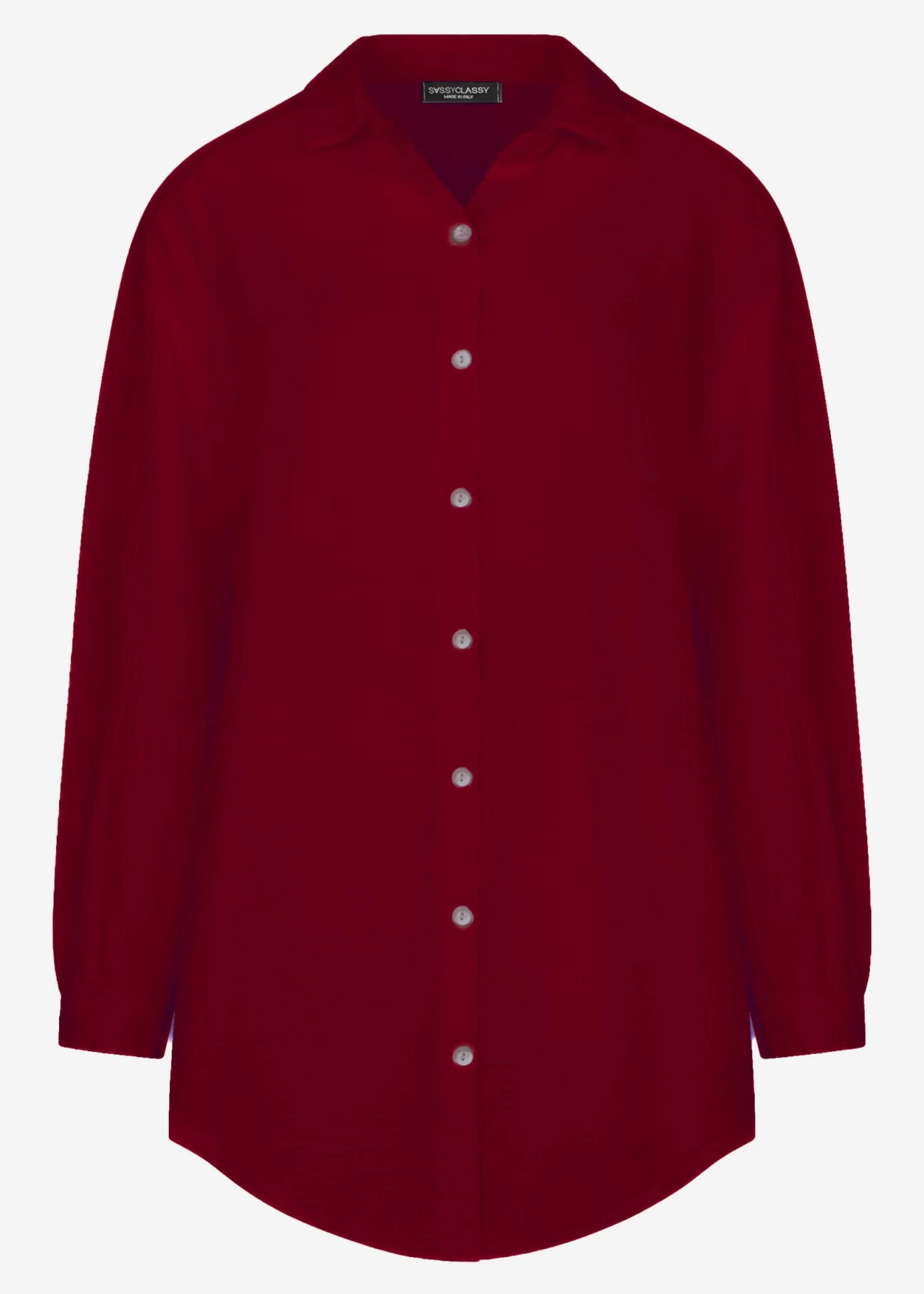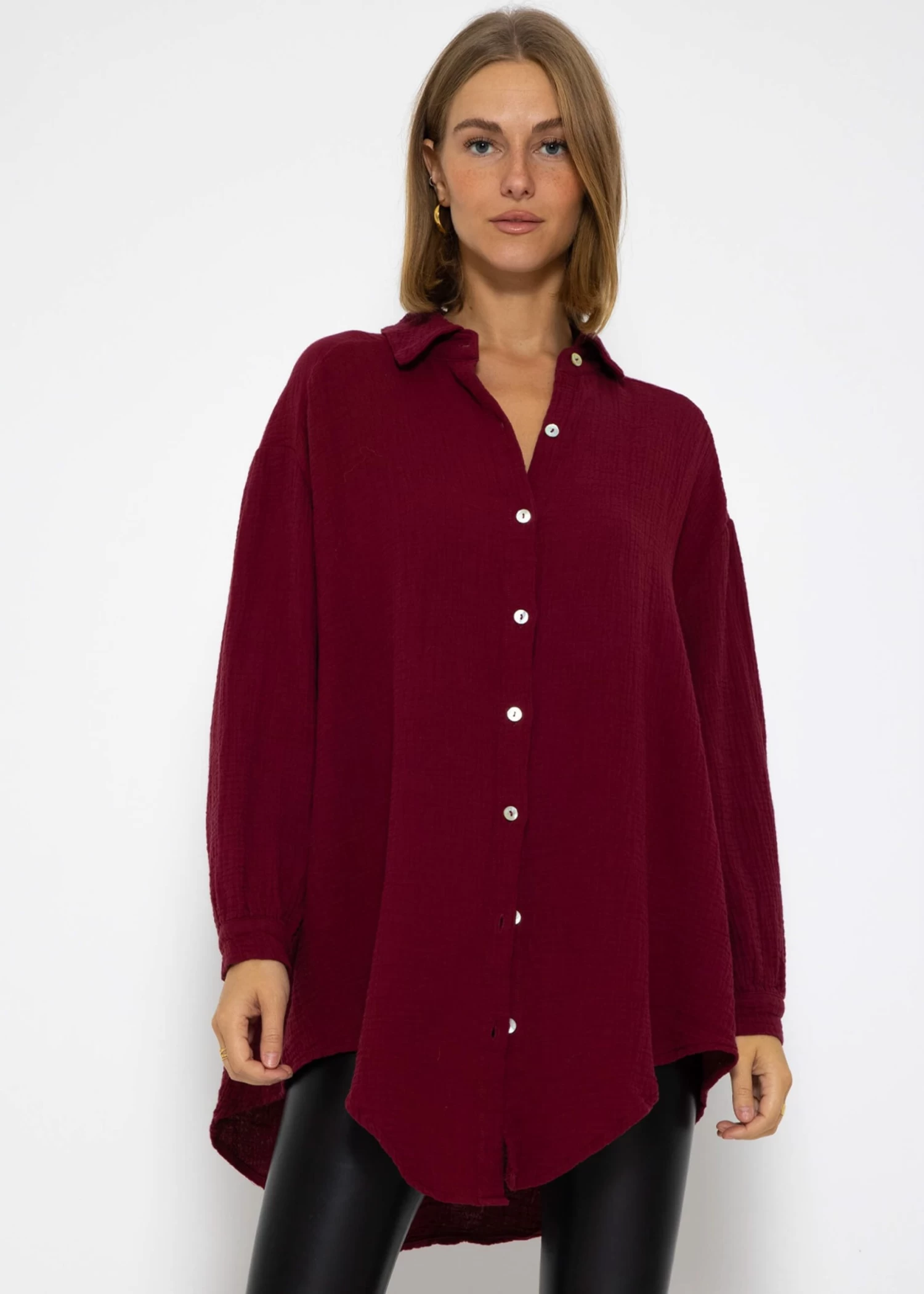 Locker fallendes Blusenhemd in Dunkelrot aus leichtem, hochwertigem Baumwoll-Musselin mit Perlmuttknöpfen. Bei diesem Modell handelt es sich um die lange Variante unserer Musselinbluse. Die stylische Longbluse besteht aus dem super soften, angenehmen und atmungsaktiven Trendstoff Musselin und ist daher ein absolutes Must-Have. Sie ist schön oversize geschnitten, fällt hinten etwas länger als vorne und besitzt überschnittene Schultern, wodurch sie ihren lässigen Look erhält. Der Kragen, der Knopfverschluss, Manschetten an den langen Ärmeln sowie die querlaufende Falte am Rücken verleihen der Musselinbluse besondere, liebevolle Details und geben ihr einen eleganten Touch. Sie ist ein treuer Begleiter für jede Jahreszeit und du kannst sie vielseitig kombinieren. Trage sie klassisch als Bluse, offen als Jacke oder Cardigan-Ersatz über einem Top, als Kleid, unter einem Pullover für einen zeitlosen Layering-Look oder einfach trendig geknotet mit tiefem Ausschnitt über einen schönen Spitzen-BH. Dieser raffinierte Allrounder kommt in Einheitsgröße und wird bis Größe 48 empfohlen