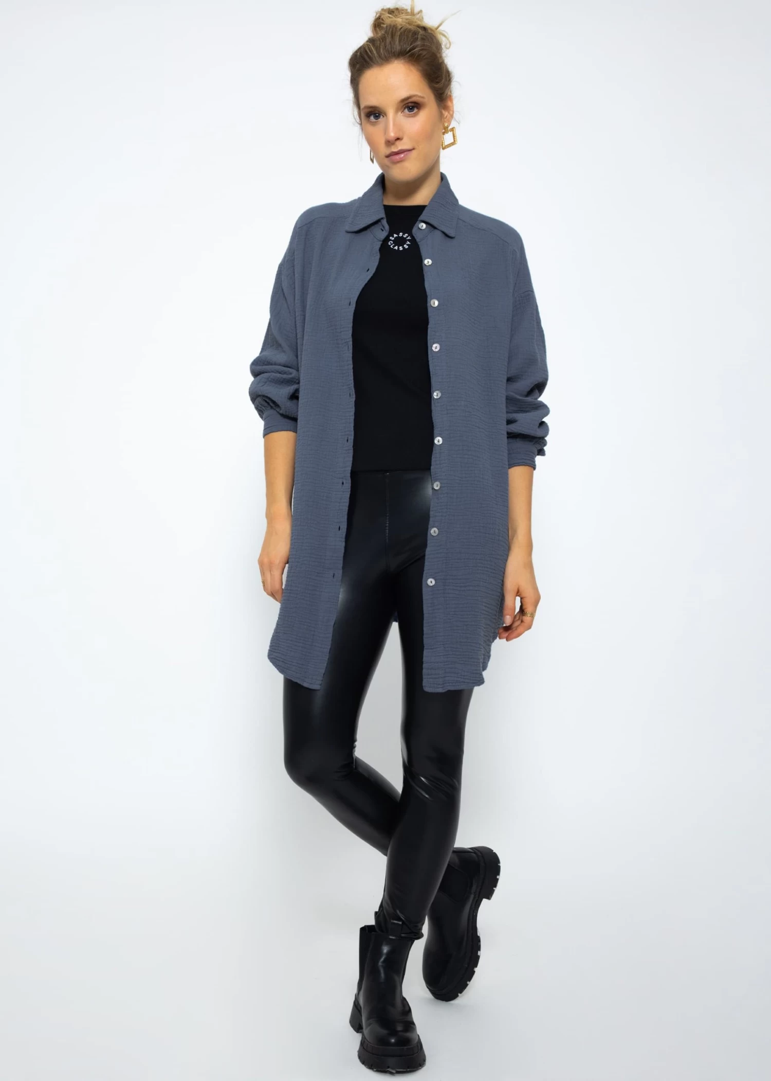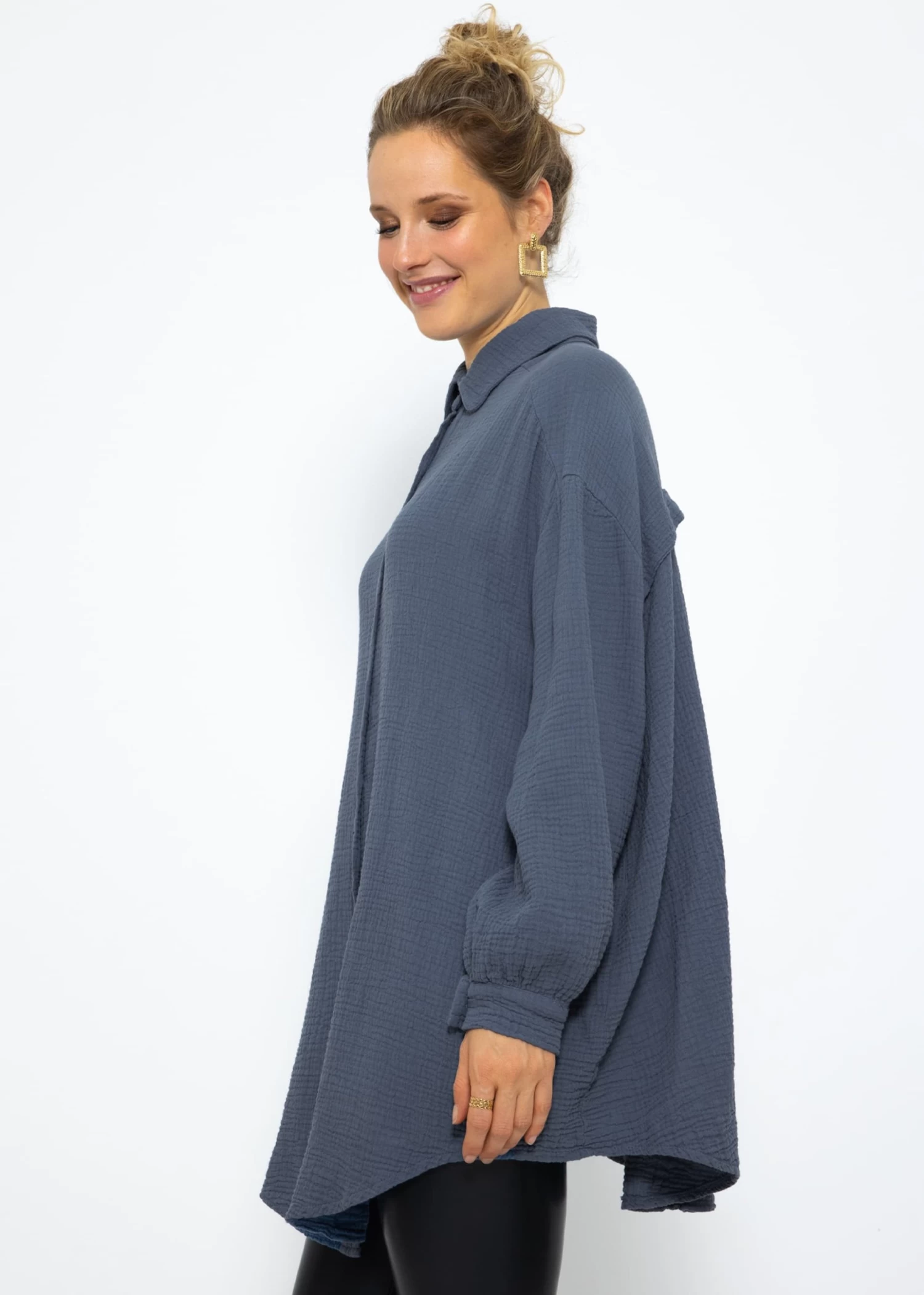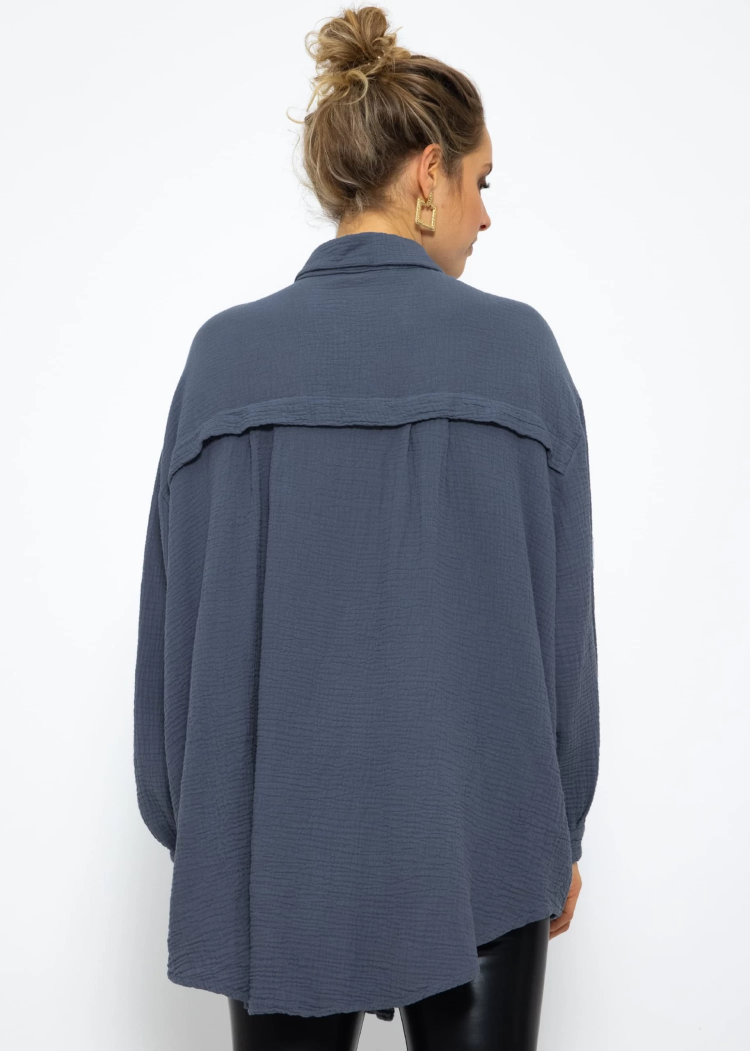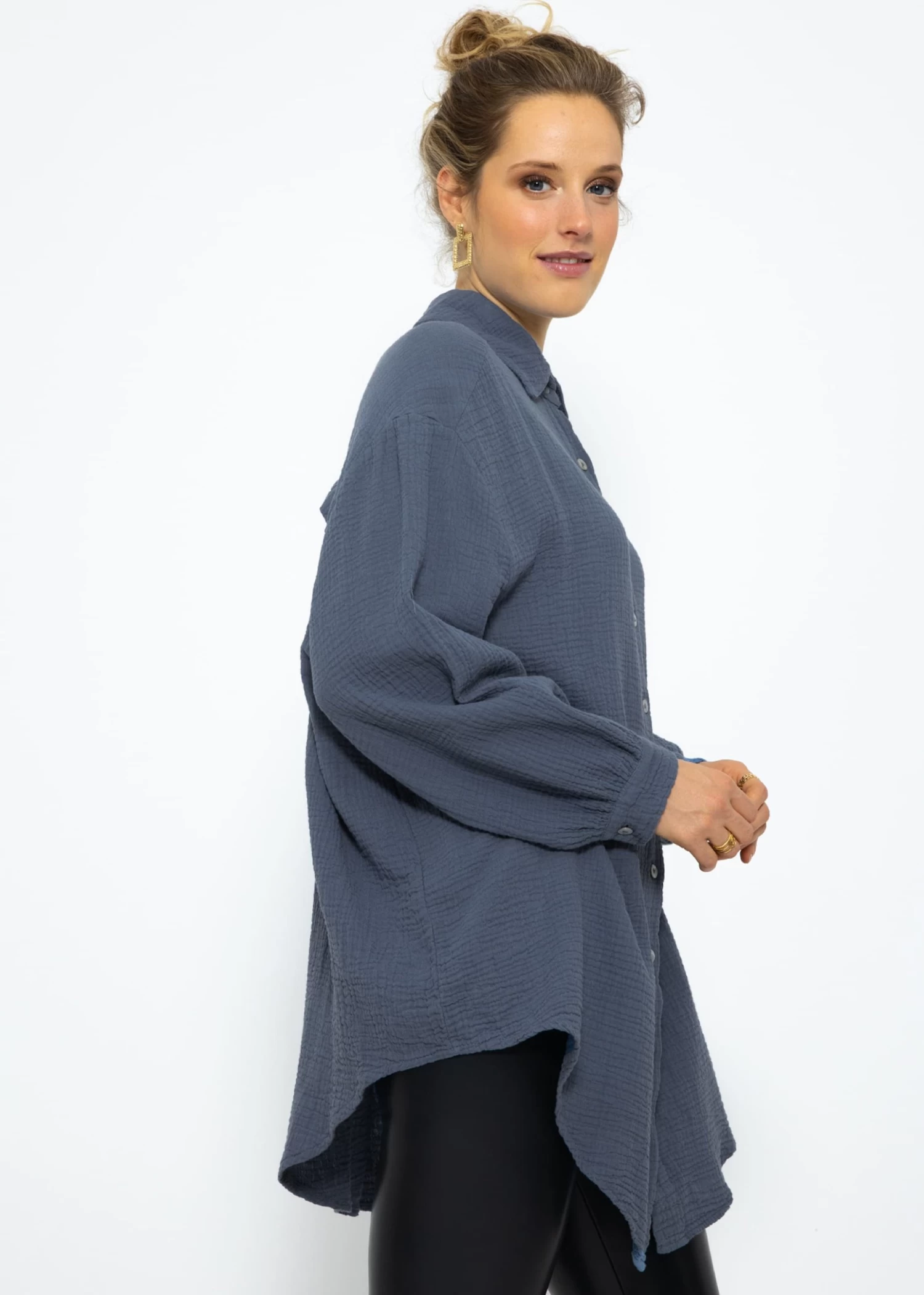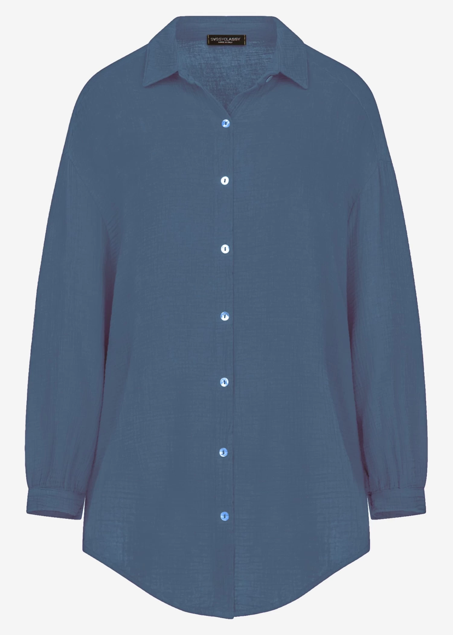 Locker fallendes Blusenhemd in Jeansblau aus leichtem, hochwertigem Baumwoll-Musselin mit Perlmuttknöpfen. Bei diesem Modell handelt es sich um die lange Variante unserer Musselinbluse. Die stylische Longbluse besteht aus dem super soften, angenehmen und atmungsaktiven Trendstoff Musselin und ist daher ein absolutes Must-Have. Sie ist schön oversize geschnitten, fällt hinten etwas länger als vorne und besitzt überschnittene Schultern, wodurch sie ihren lässigen Look erhält. Der Kragen, der Knopfverschluss, Manschetten an den langen Ärmeln sowie die querlaufende Falte am Rücken verleihen der Musselinbluse besondere, liebevolle Details und geben ihr einen eleganten Touch. Sie ist ein treuer Begleiter für jede Jahreszeit und du kannst sie vielseitig kombinieren. Trage sie klassisch als Bluse, offen als Jacke oder Cardigan-Ersatz über einem Top, als Kleid, unter einem Pullover für einen zeitlosen Layering-Look oder einfach trendig geknotet mit tiefem Ausschnitt über einen schönen Spitzen-BH. Dieser raffinierte Allrounder kommt in Einheitsgröße und wird bis Größe 48 empfohlen