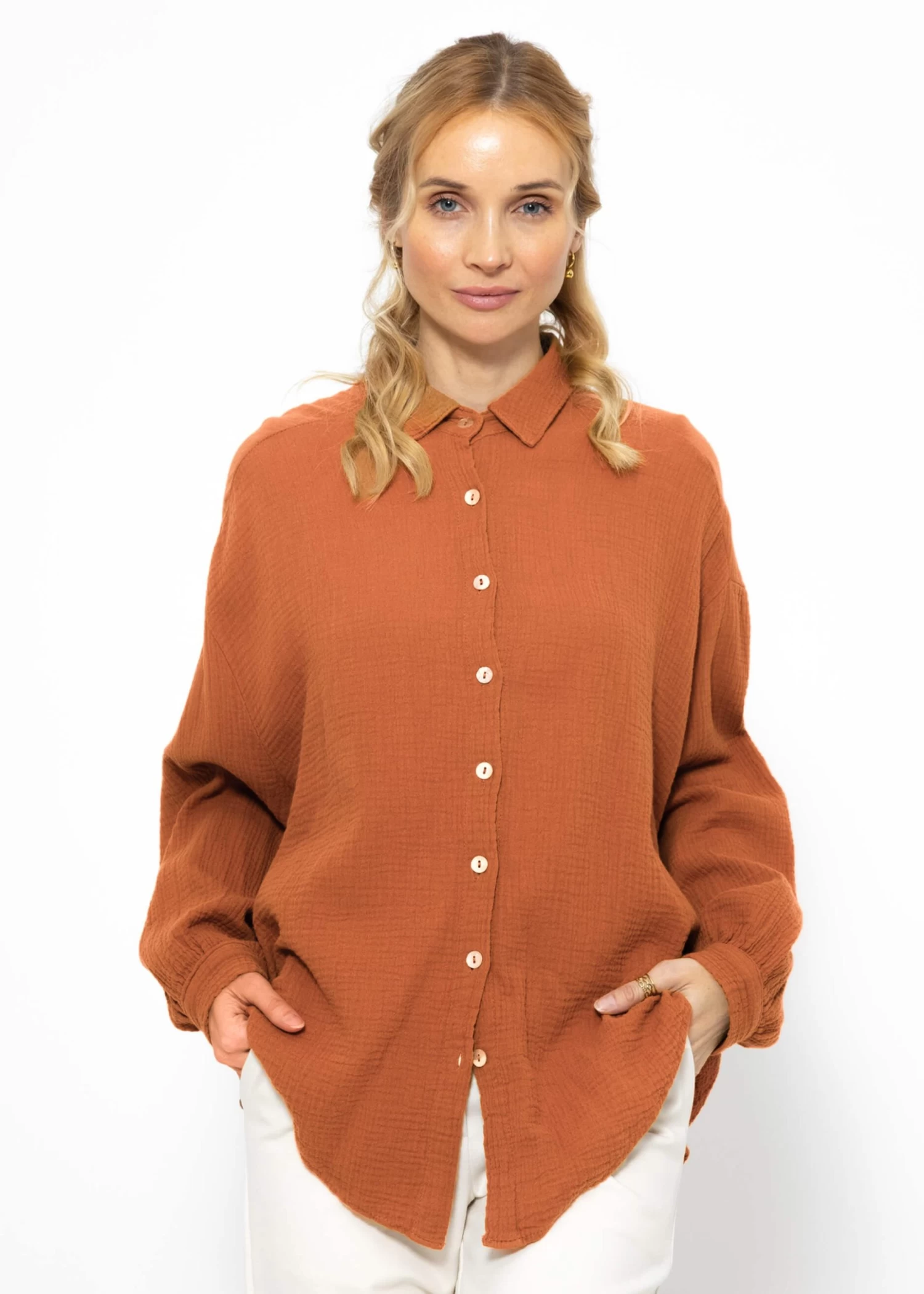 Lässig fallendes Blusenhemd aus softem Baumwoll-Gewebe mit Perlmuttknöpfen. Der ultra oversize Schnitt und die querlaufende Falte hinten machen seinen lässigen Look aus. Kragen, Knopfverschluss und Manschetten an den langen Ärmeln verleihen einen eleganten Touch. Du findest diese Bluse nun hier neu auch in einer kürzeren Variante. Empfohlen bis Größe 48