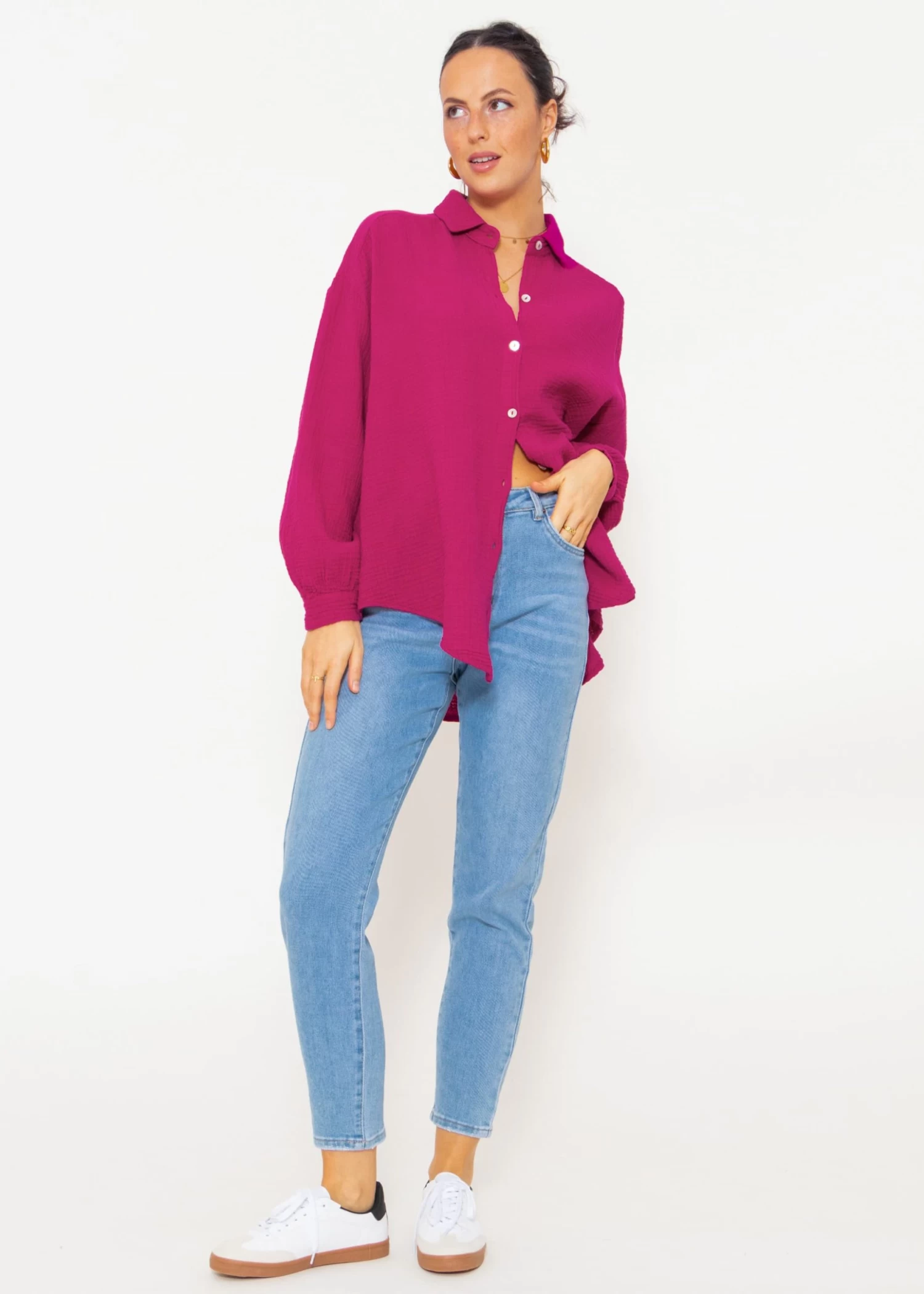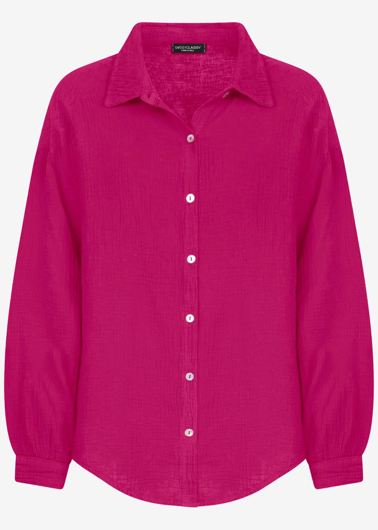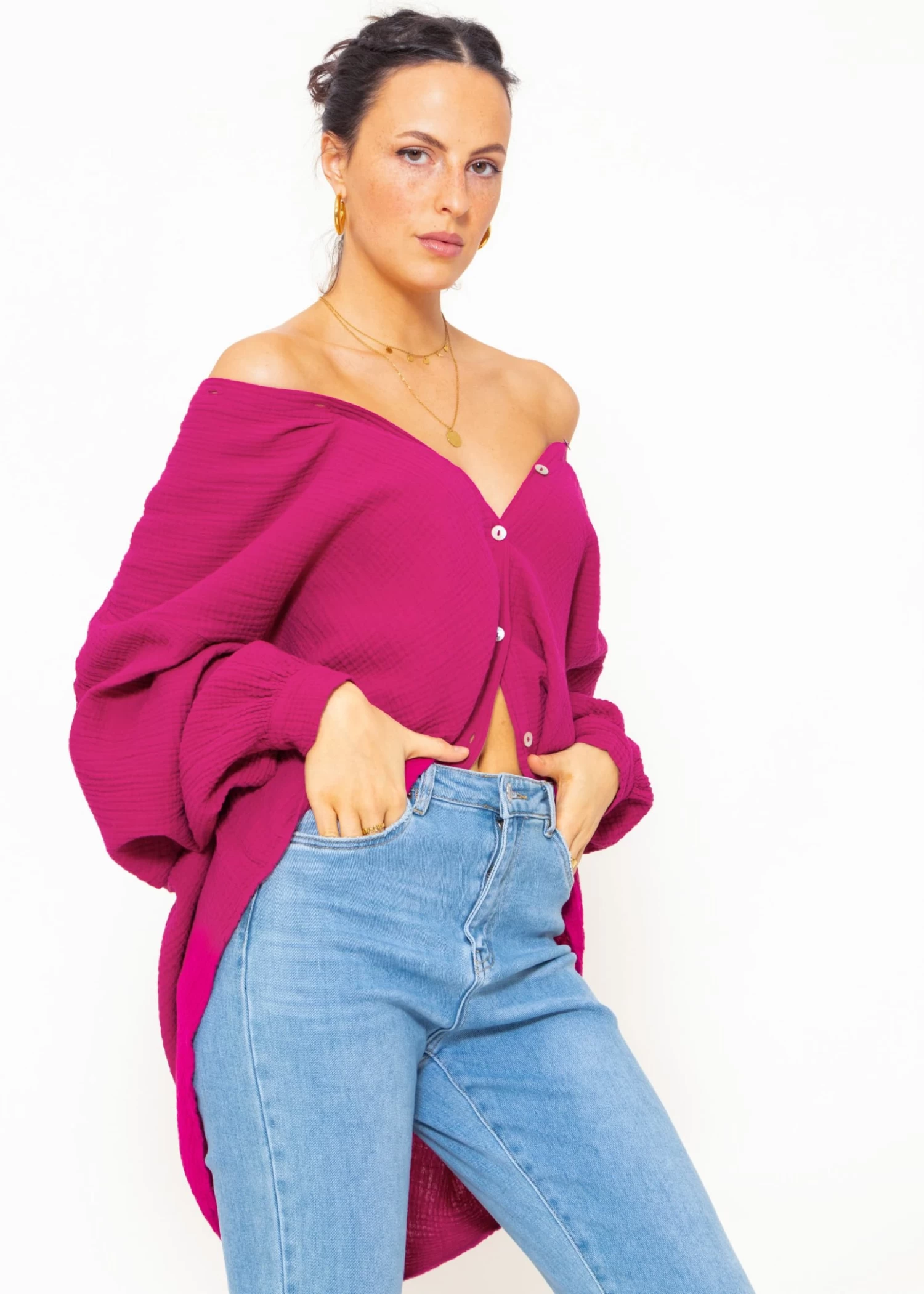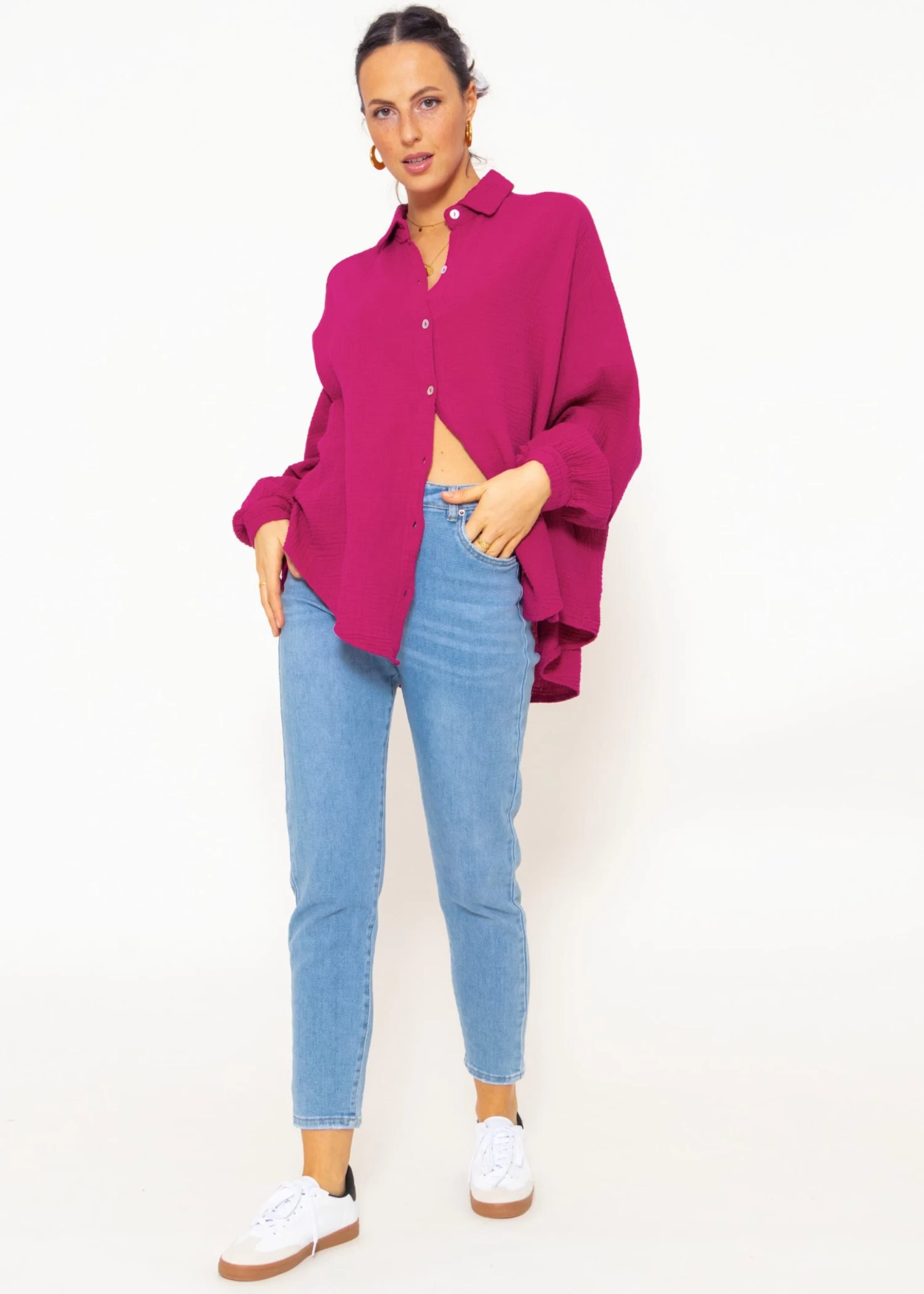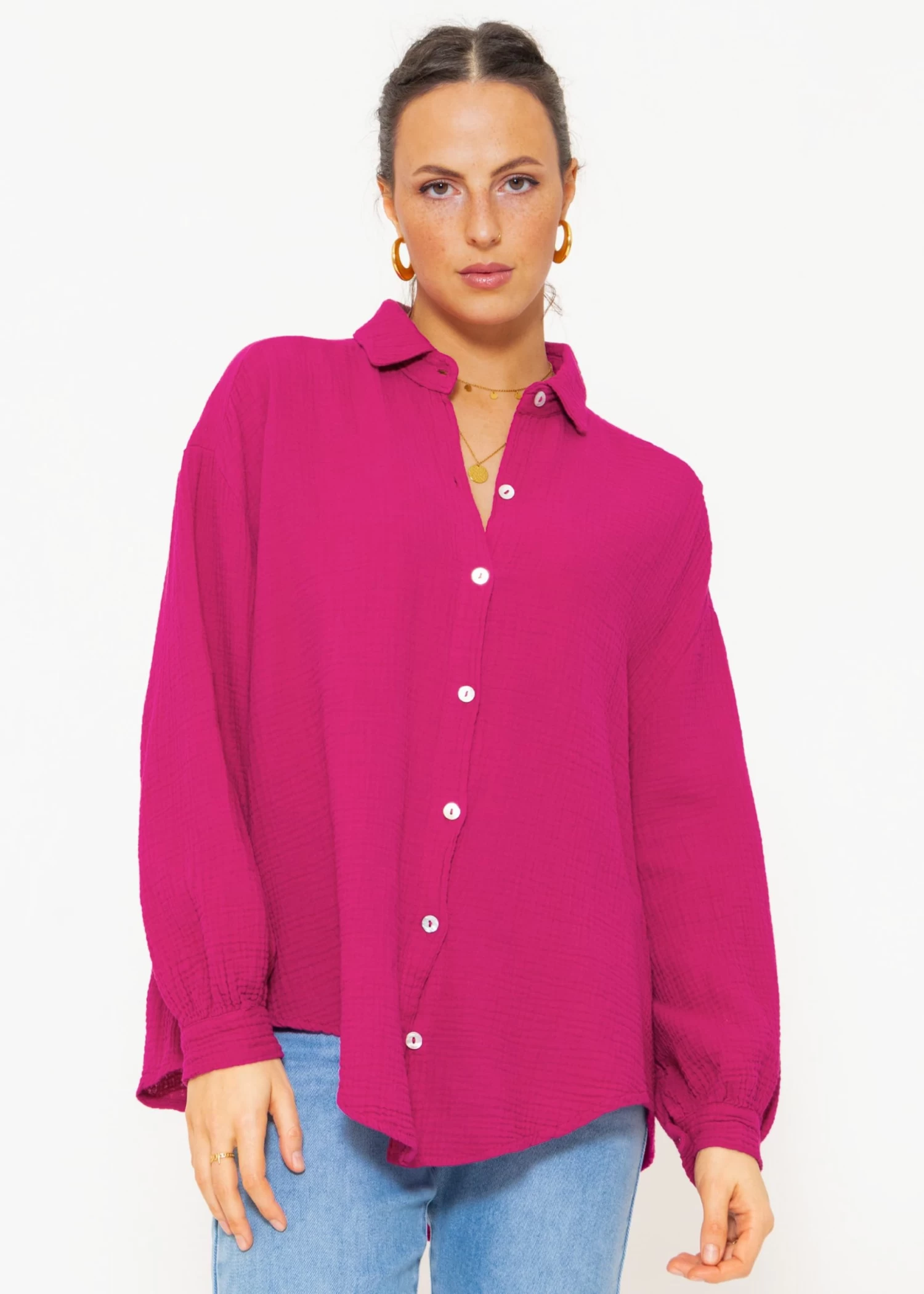 Lässig fallendes Blusenhemd aus softem Baumwoll-Gewebe mit Perlmuttknöpfen. Der ultra oversize Schnitt und die querlaufende Falte hinten machen seinen lässigen Look aus. Kragen, Knopfverschluss und Manschetten an den langen Ärmeln verleihen einen eleganten Touch. Du findest diese Bluse nun hier neu auch in einer kürzeren Variante. Empfohlen bis Größe48