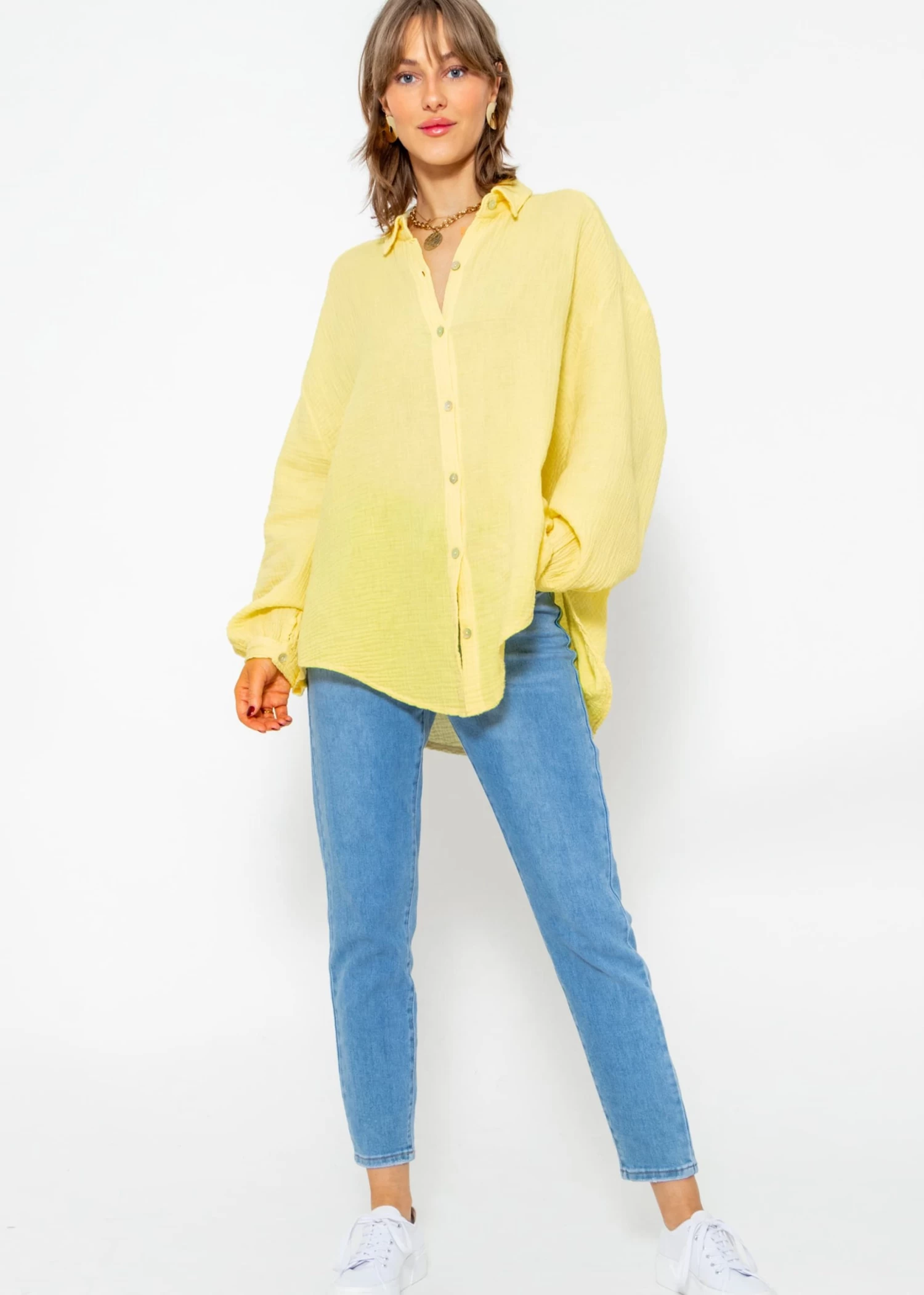 Lässig fallendes Blusenhemd aus softem Baumwoll-Gewebe mit Perlmuttknöpfen. Der ultra oversize Schnitt und die querlaufende Falte hinten machen seinen lässigen Look aus. Kragen, Knopfverschluss und Manschetten an den langen Ärmeln verleihen einen eleganten Touch. Du findest diese Bluse nun hier neu auch in einer kürzeren Variante. Empfohlen bis Größe 48