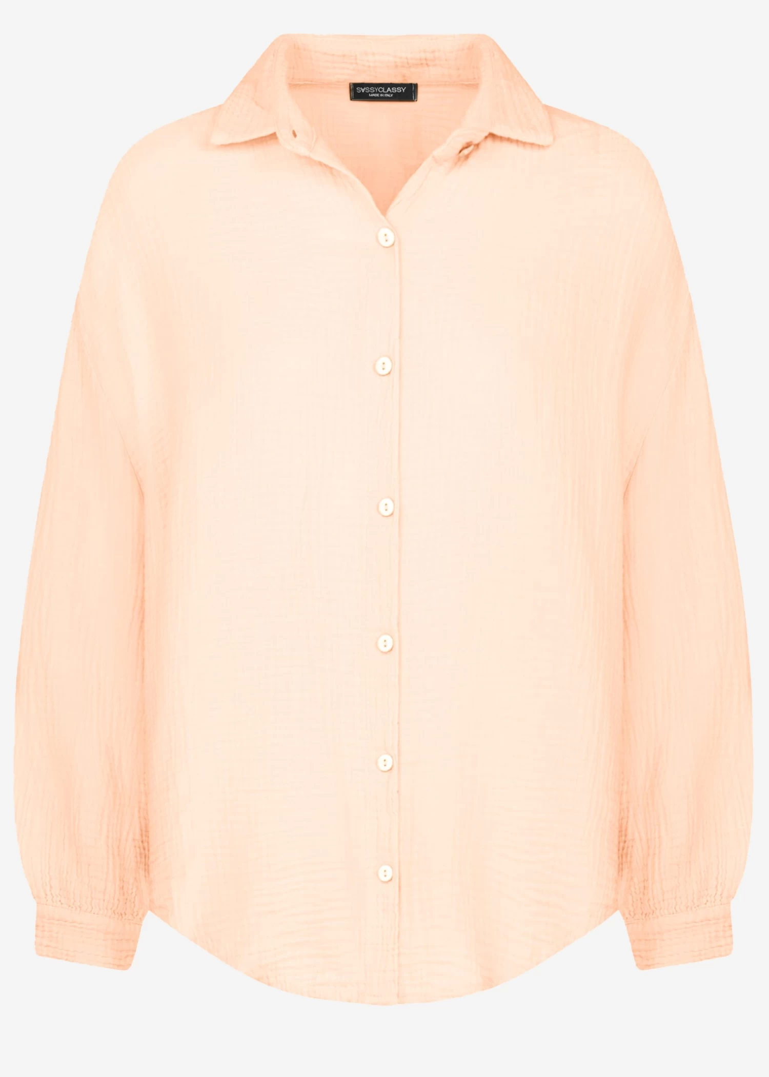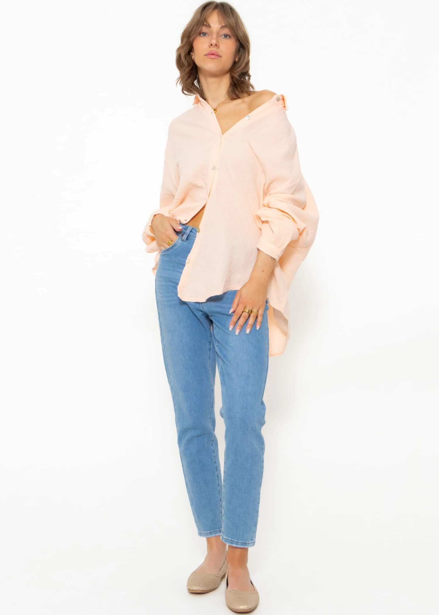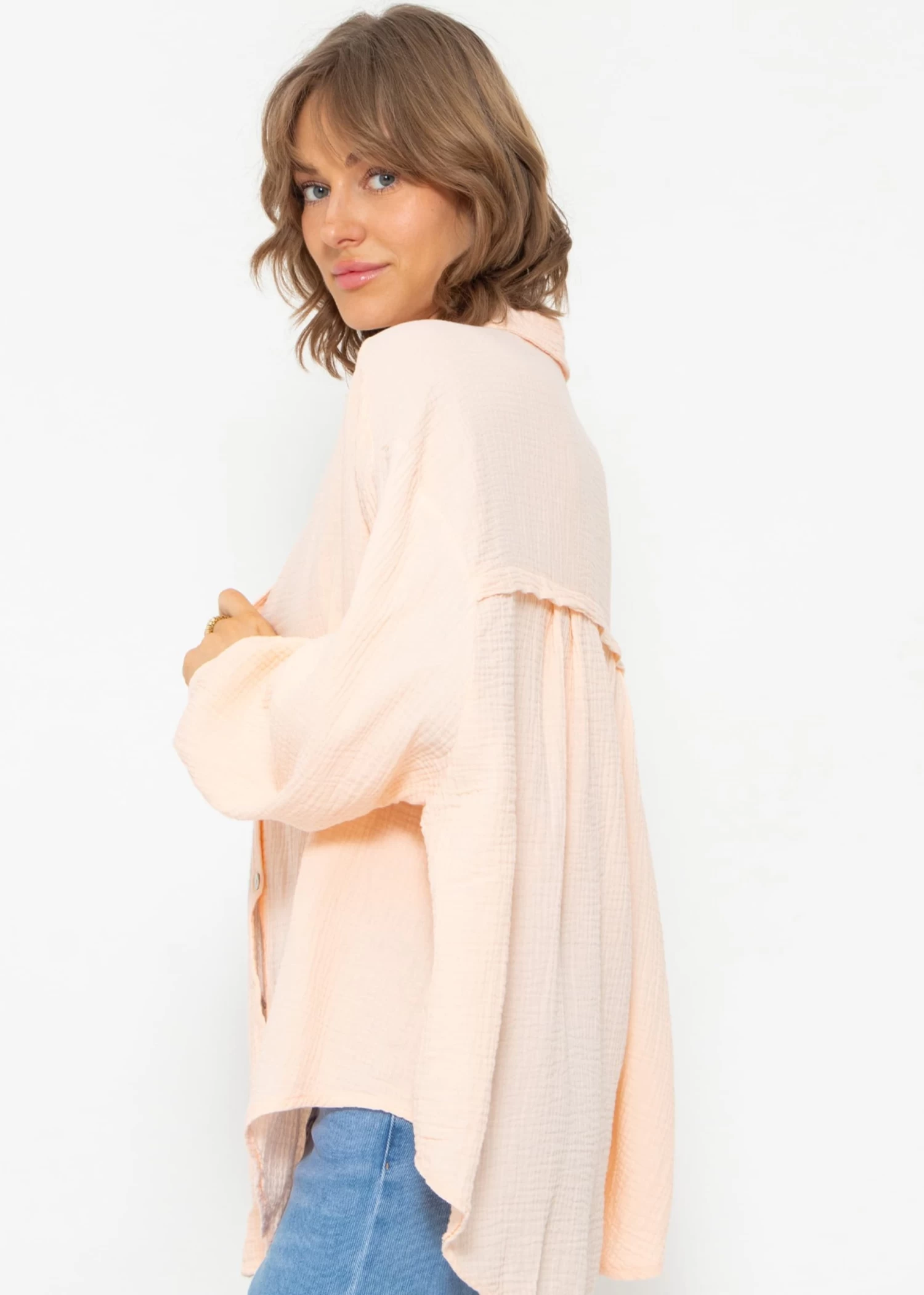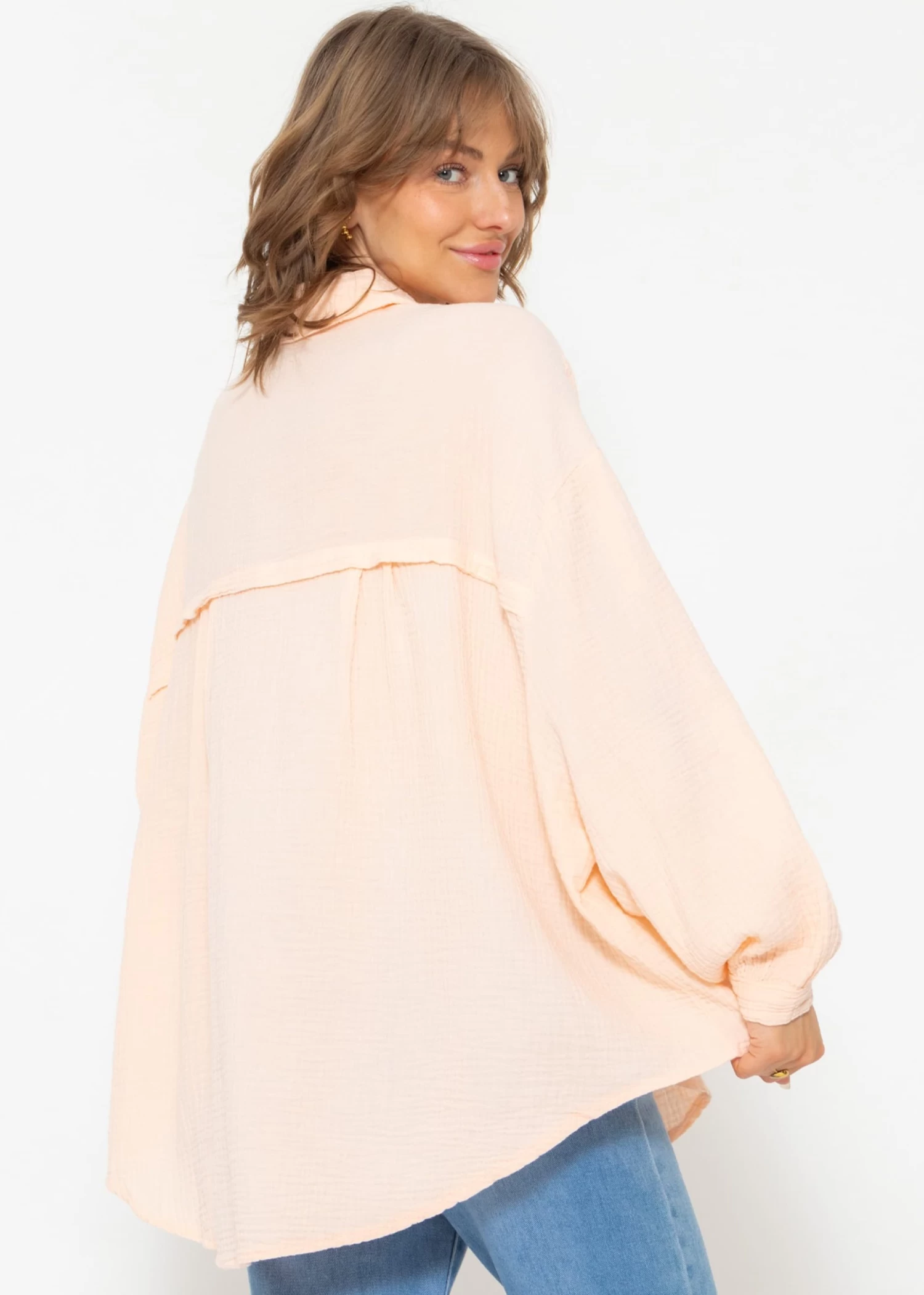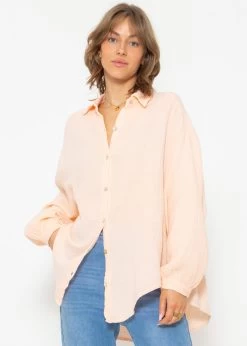 Lässig fallendes Blusenhemd aus softem Baumwoll-Gewebe mit Perlmuttknöpfen. Der ultra oversize Schnitt und die querlaufende Falte hinten machen seinen lässigen Look aus. Kragen, Knopfverschluss und Manschetten an den langen Ärmeln verleihen einen eleganten Touch. Du findest diese Bluse nun hier neu auch in einer kürzeren Variante. Empfohlen bis Größe 48