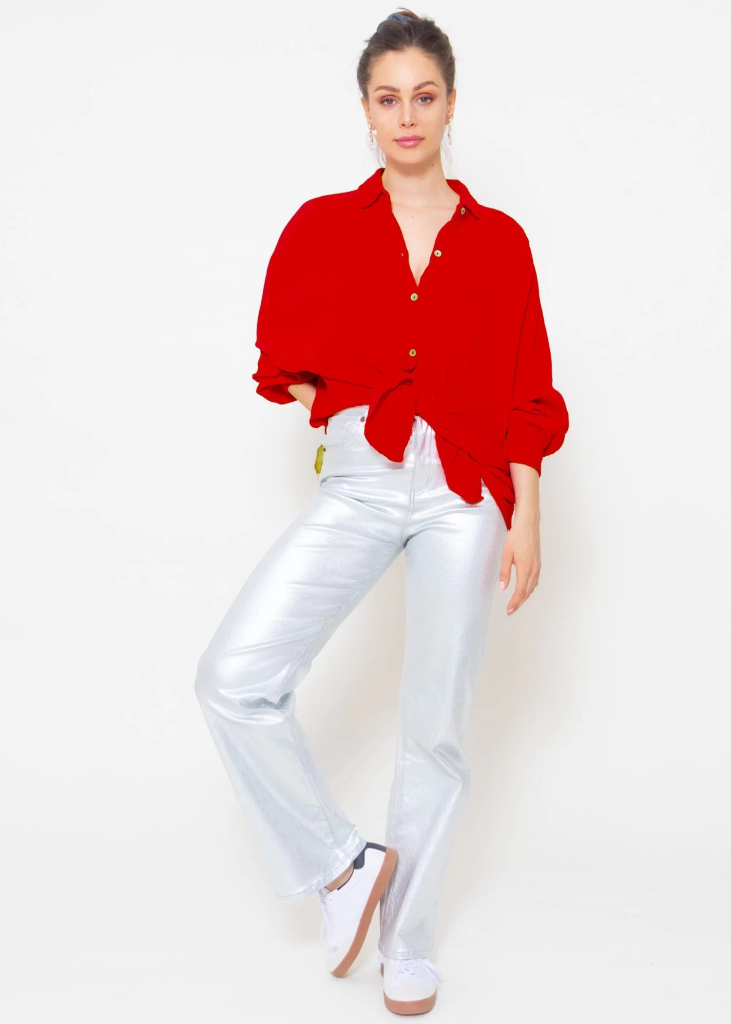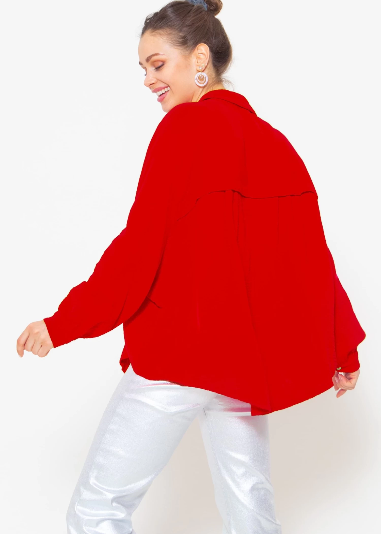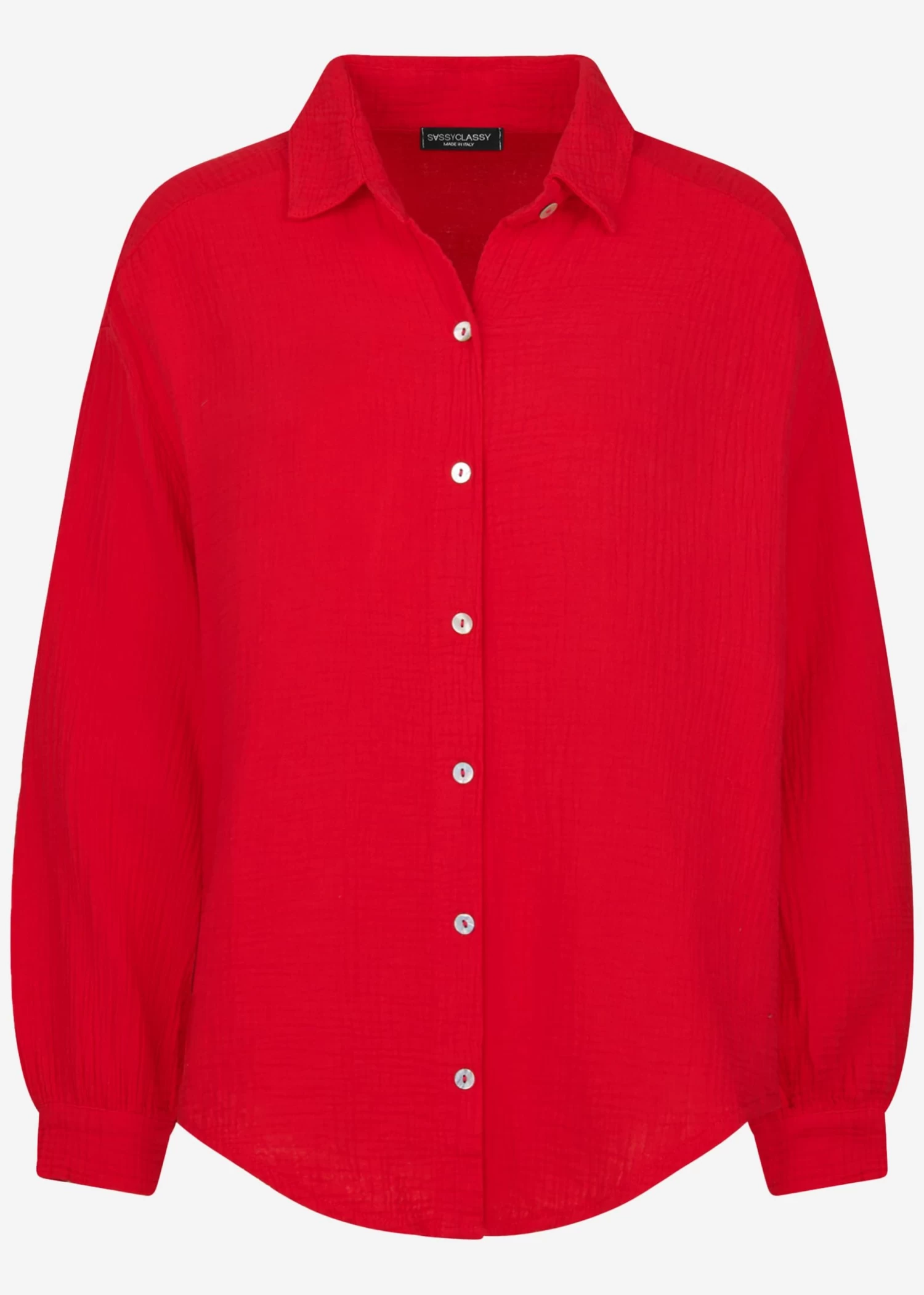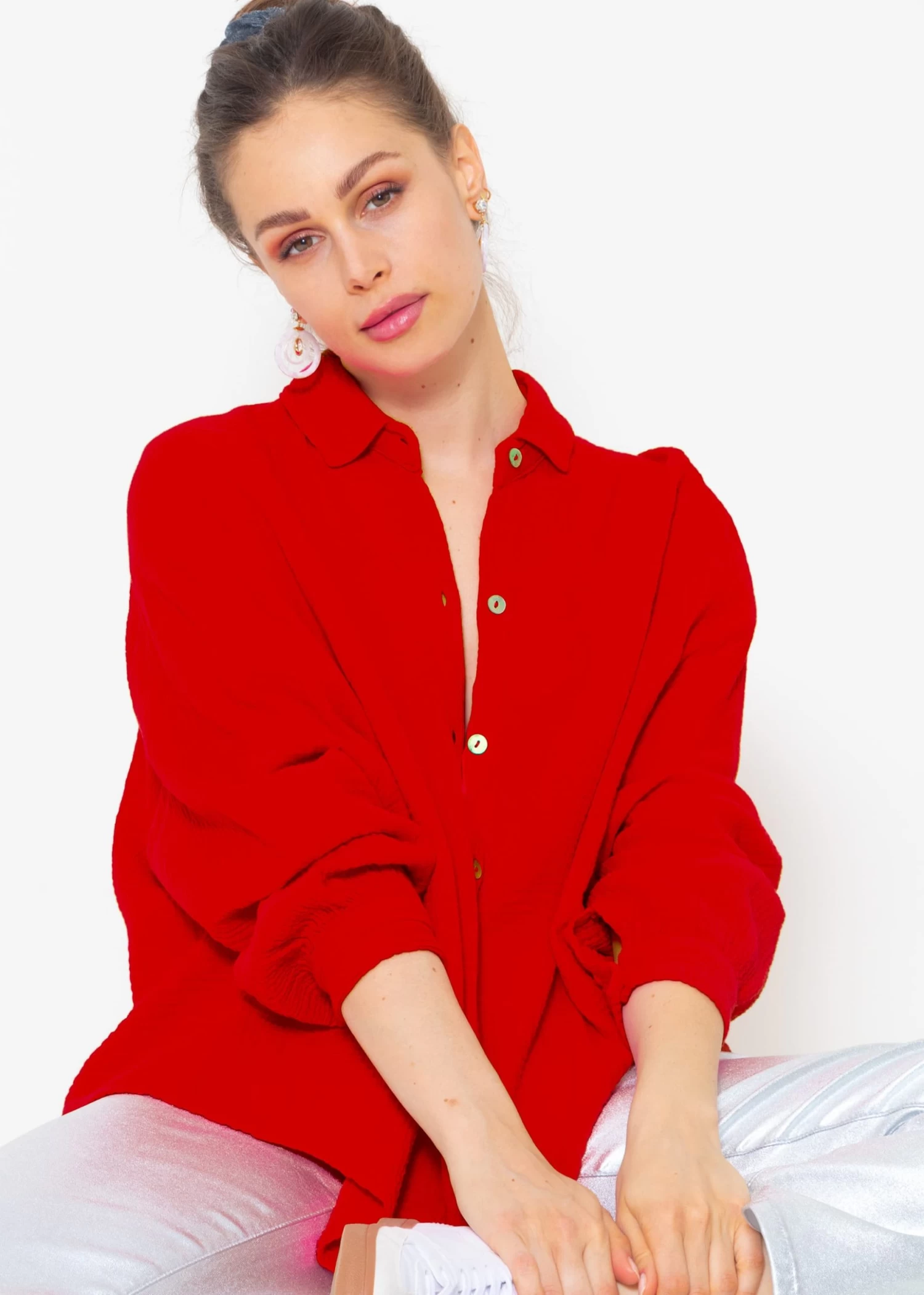 Lässig fallendes Blusenhemd aus softem Baumwoll-Gewebe mit Perlmuttknöpfen. Der ultra oversize Schnitt und die querlaufende Falte hinten machen seinen lässigen Look aus. Kragen, Knopfverschluss und Manschetten an den langen Ärmeln verleihen einen eleganten Touch. Du findest diese Bluse nun hier neu auch in einer kürzeren Variante. Empfohlen bis Größe 48