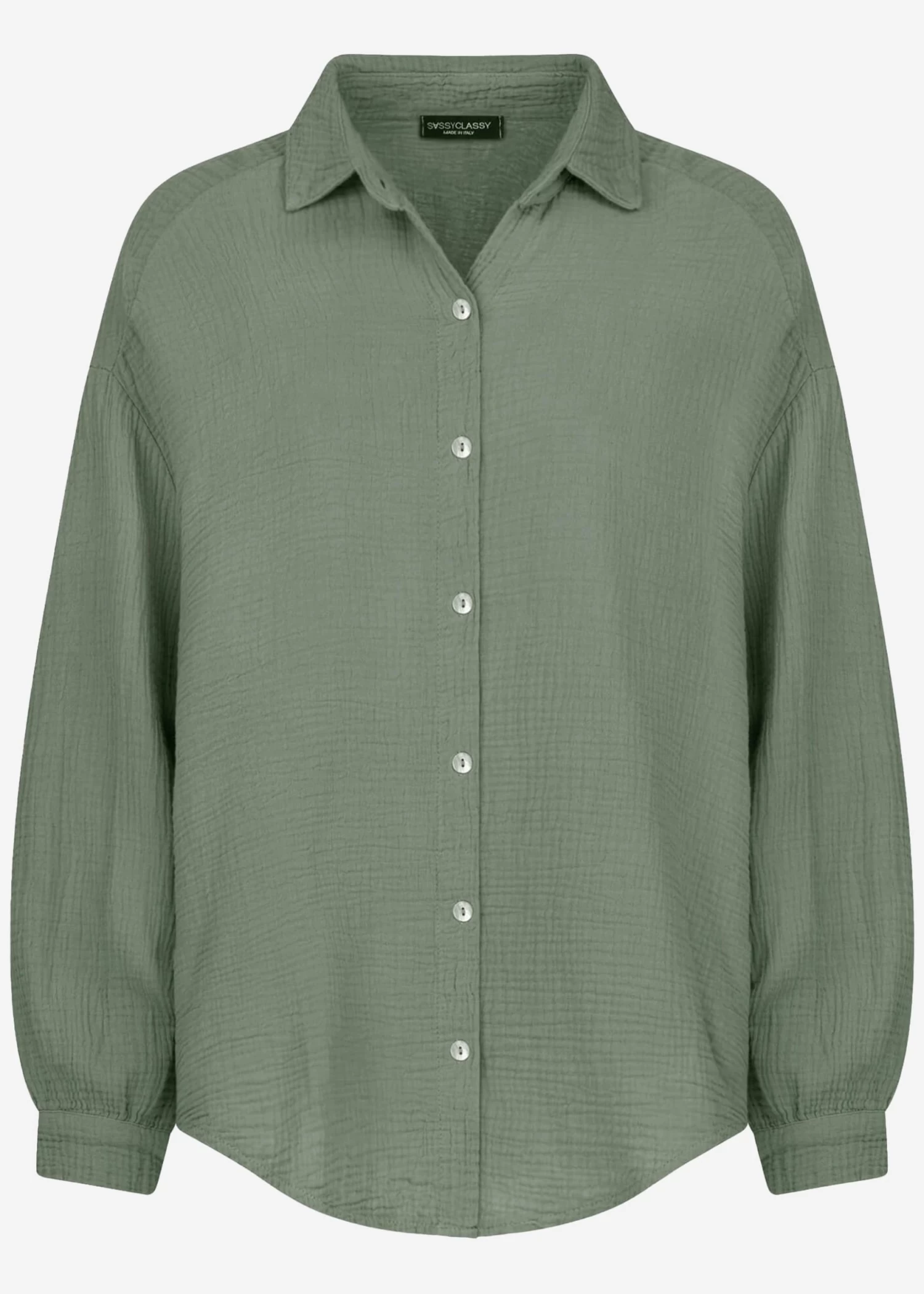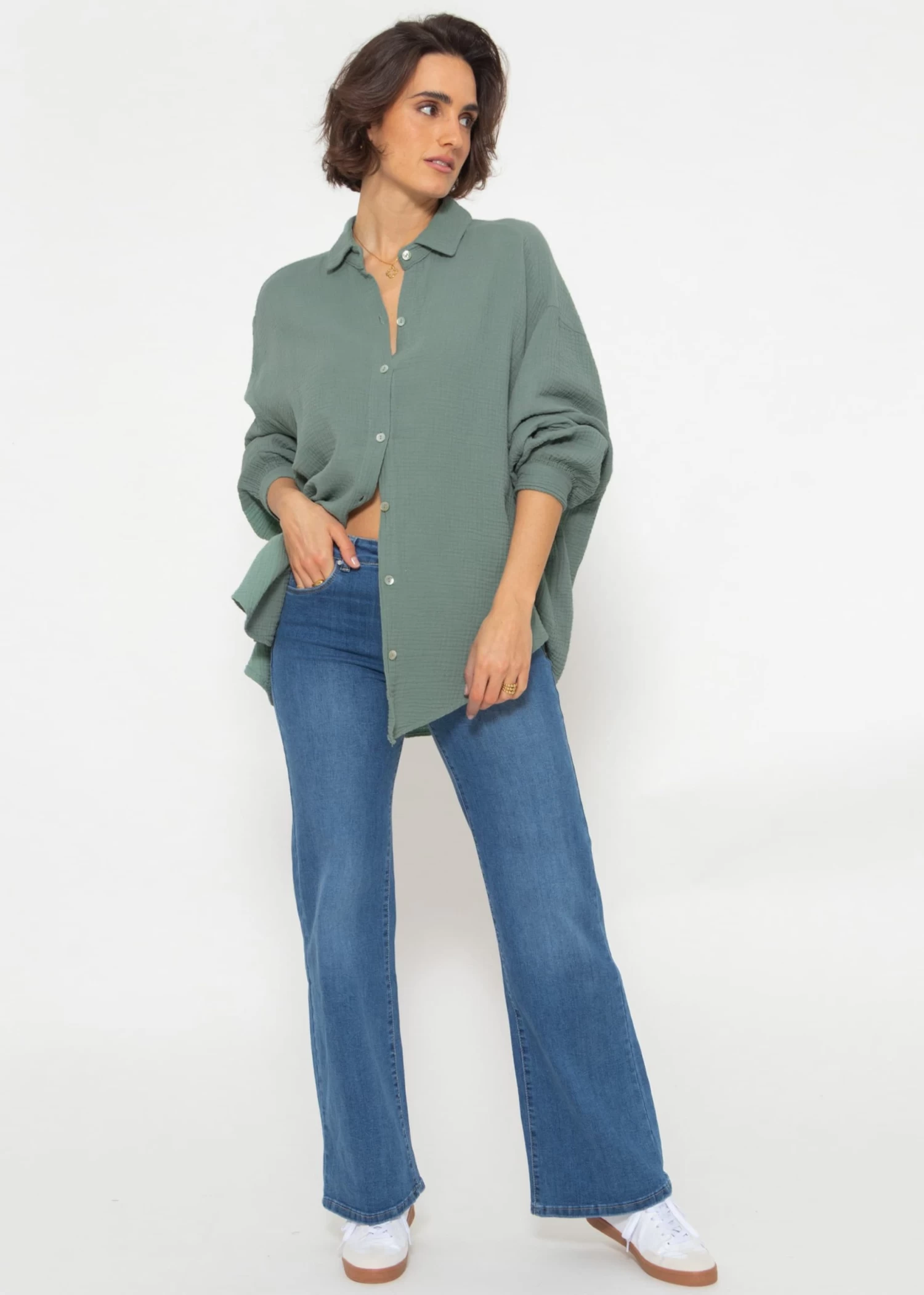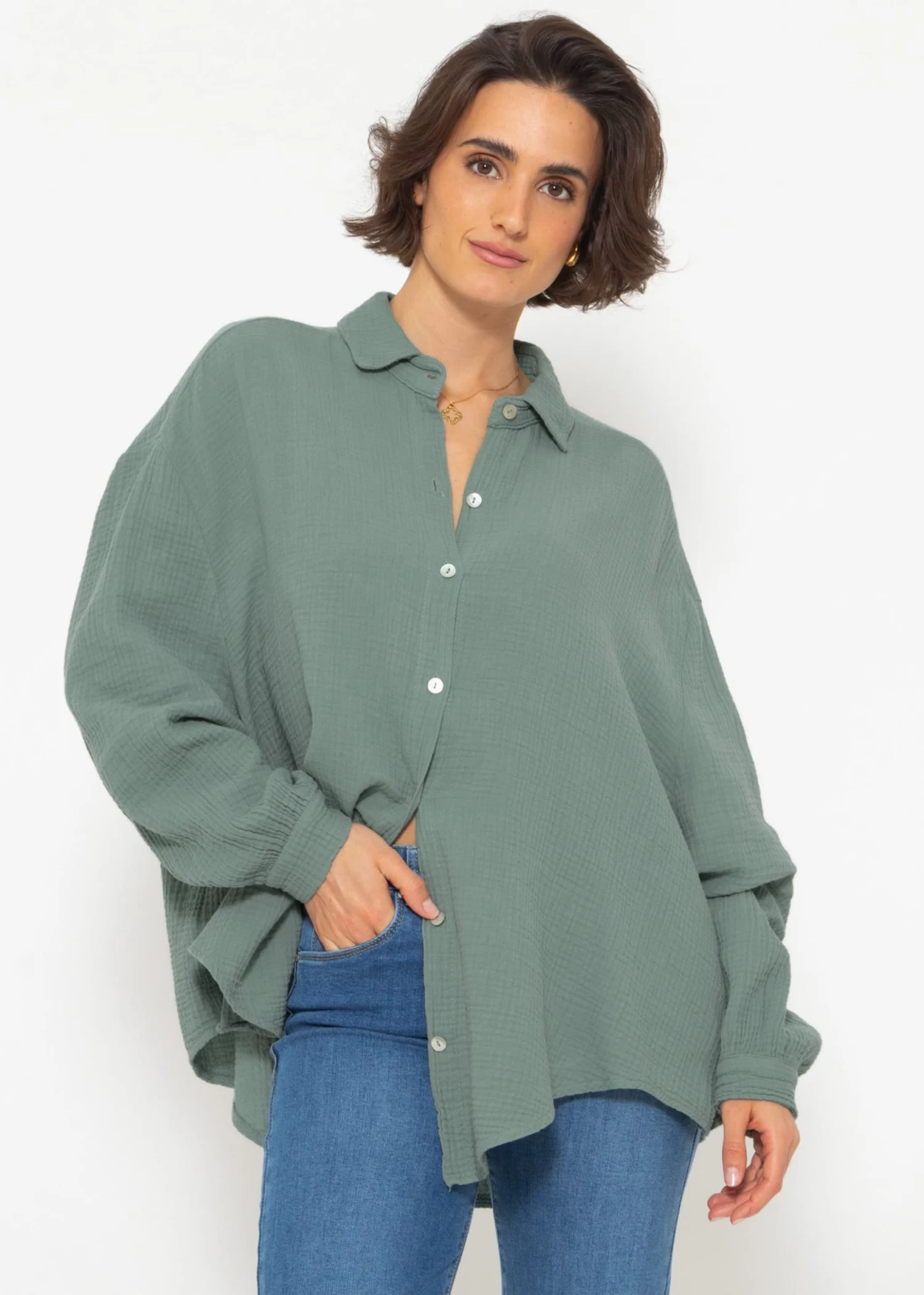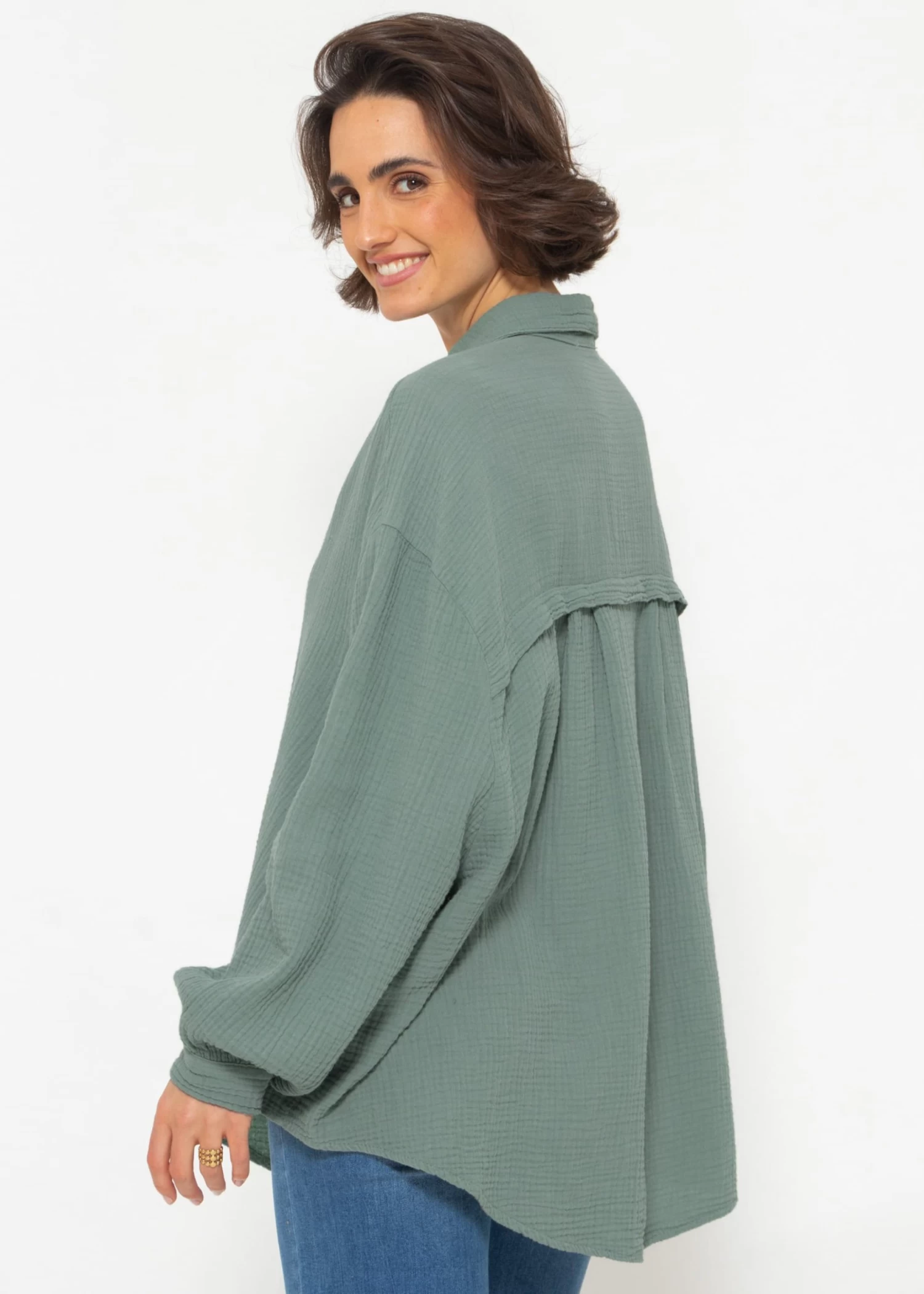 Lässig fallendes Blusenhemd aus softem Baumwoll-Gewebe mit Perlmuttknöpfen. Der ultra oversize Schnitt und die querlaufende Falte hinten machen seinen lässigen Look aus. Kragen, Knopfverschluss und Manschetten an den langen Ärmeln verleihen einen eleganten Touch. Du findest diese Bluse nun hier neu auch in einer kürzeren Variante. Empfohlen bis Größe 48