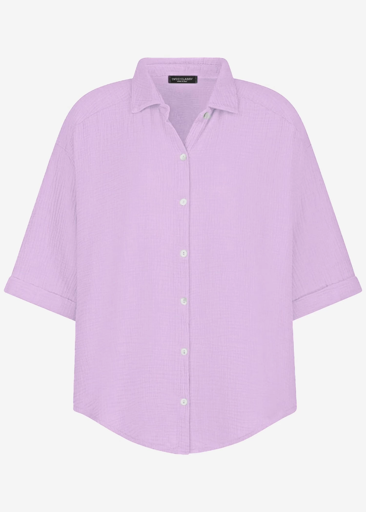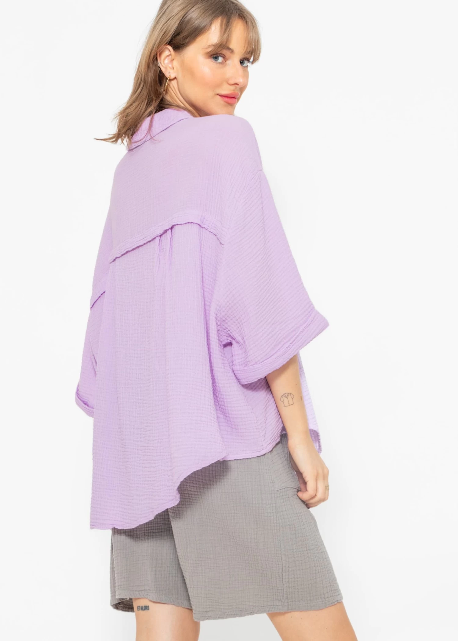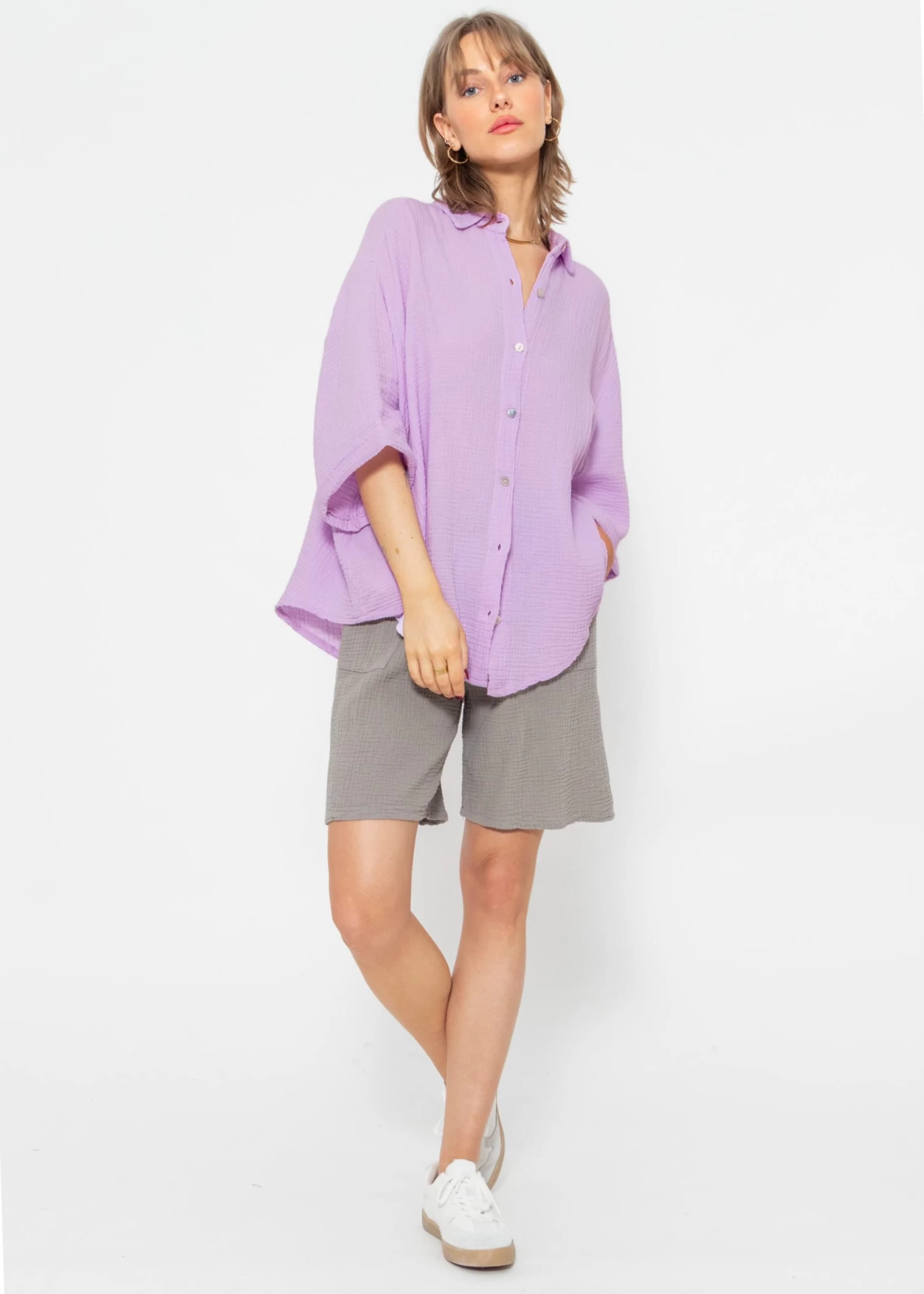 Locker fallende Musselin-Bluse in Flieder aus leichtem, hochwertigem Baumwoll-Musselin mit Perlmuttknöpfen. Dieses Modell besitzt halblange Ärmel und bekommt dadurch einen lässigen, sportiven Look. Sie ist schön oversize geschnitten, fällt hinten etwas länger und hat überschnittene Schultern. Der Kragen, der Knopfverschluss sowie die querlaufende Falte am Rücken verleihen der Bluse besondere, liebevolle Details. Die stylische Bluse besteht aus dem super soften, angenehmen und atmungsaktiven Trendstoff Musselin und ist daher ein absolutes Must-Have. Sie bietet zahlreiche Kombinationsmöglichkeiten und ist ein echter Allrounder. Trage dieses Blusenhemd klassisch als Bluse, offen als Cardigan-Ersatz über einem Top oder auch vorne geknotet. Sie ist der perfekte Begleiter für warme Tage und bietet gleichzeitig Schutz vor zu viel Sonne. Die Halbarm-Bluse kommt in Einheitsgröße und wird bis Gr48 empfohlen.
