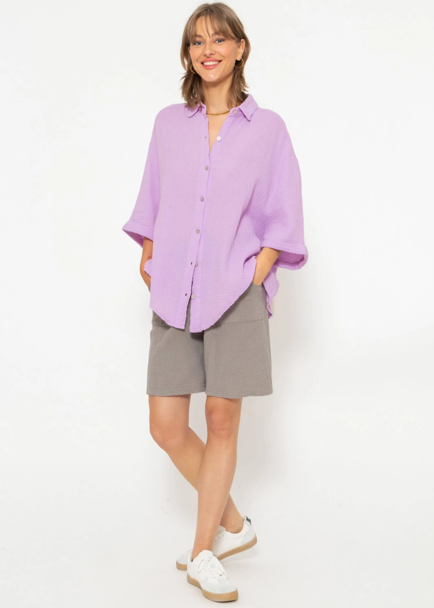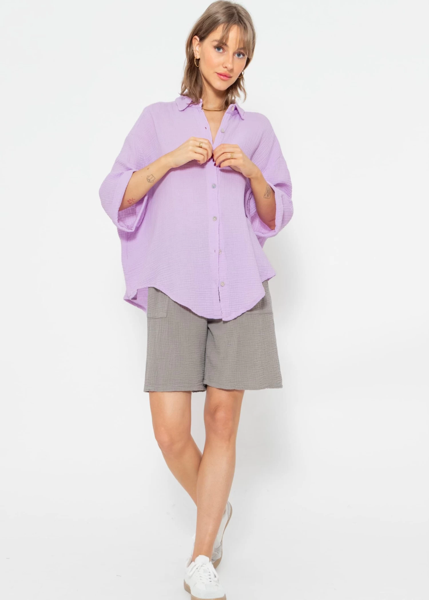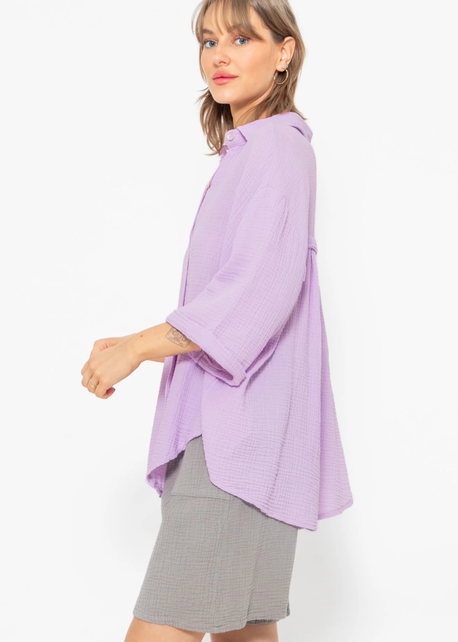 Locker fallende Musselin-Bluse in Flieder aus leichtem, hochwertigem Baumwoll-Musselin mit Perlmuttknöpfen. Dieses Modell besitzt halblange Ärmel und bekommt dadurch einen lässigen, sportiven Look. Sie ist schön oversize geschnitten, fällt hinten etwas länger und hat überschnittene Schultern. Der Kragen, der Knopfverschluss sowie die querlaufende Falte am Rücken verleihen der Bluse besondere, liebevolle Details. Die stylische Bluse besteht aus dem super soften, angenehmen und atmungsaktiven Trendstoff Musselin und ist daher ein absolutes Must-Have. Sie bietet zahlreiche Kombinationsmöglichkeiten und ist ein echter Allrounder. Trage dieses Blusenhemd klassisch als Bluse, offen als Cardigan-Ersatz über einem Top oder auch vorne geknotet. Sie ist der perfekte Begleiter für warme Tage und bietet gleichzeitig Schutz vor zu viel Sonne. Die Halbarm-Bluse kommt in Einheitsgröße und wird bis Gr48 empfohlen.