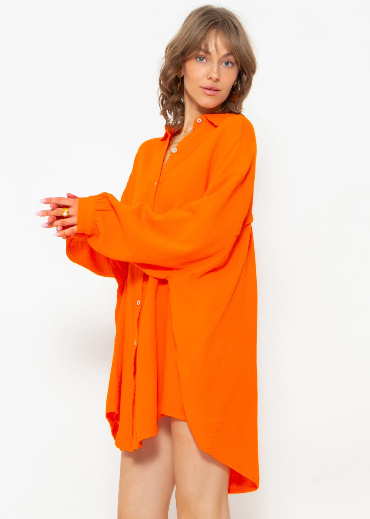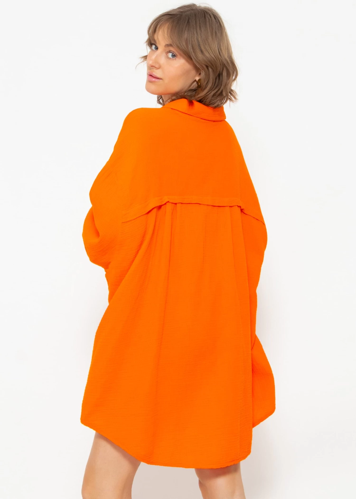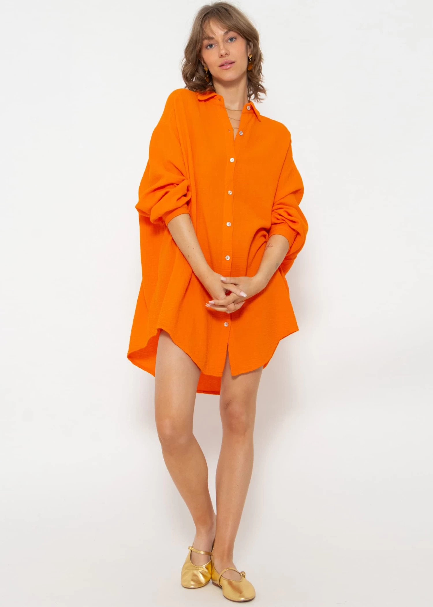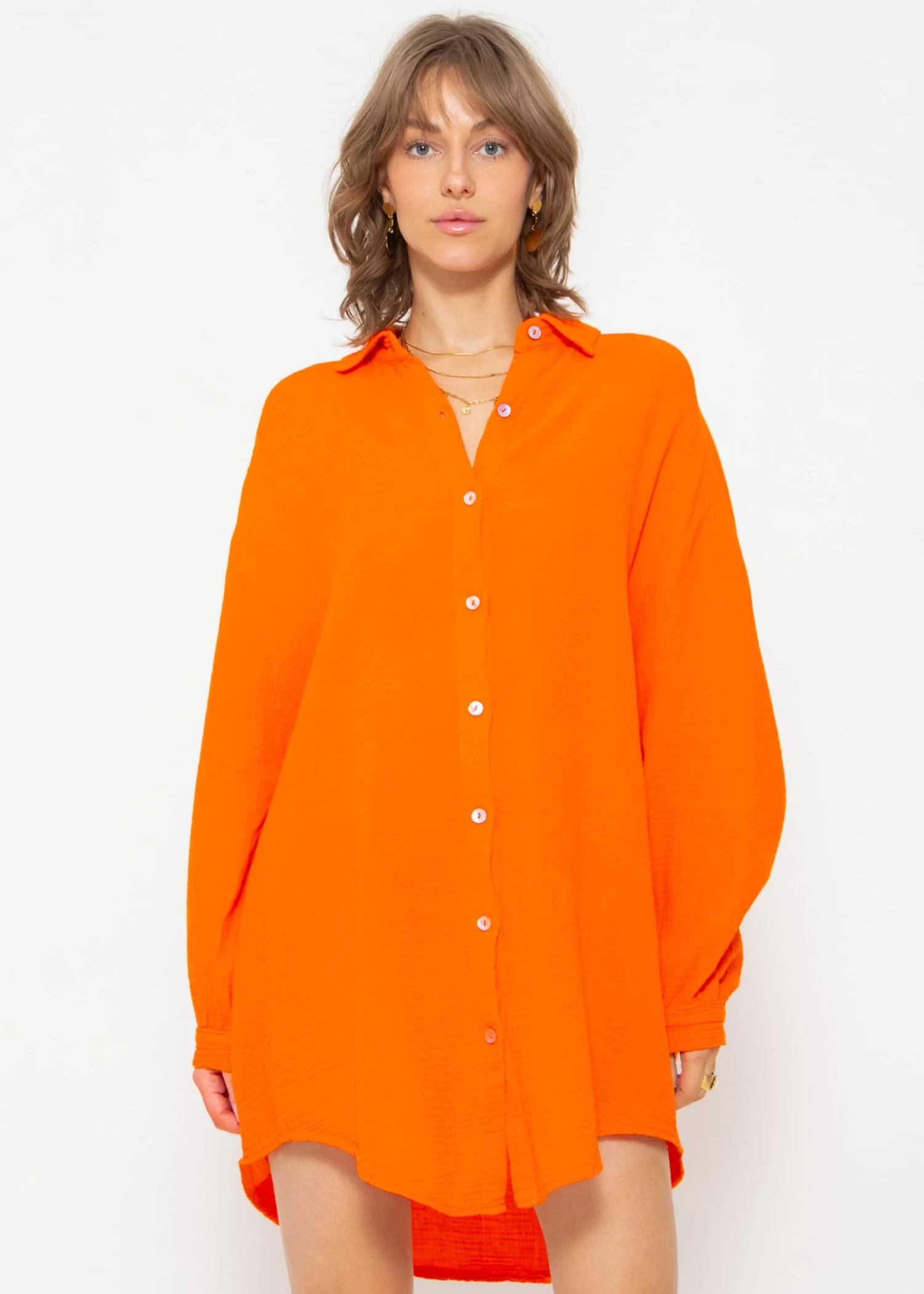 Locker fallendes Blusenhemd in Orange aus leichtem, hochwertigem Baumwoll-Musselin mit Perlmuttknöpfen. Bei diesem Modell handelt es sich um die lange Variante unserer Musselinbluse. Die stylische Longbluse besteht aus dem super soften, angenehmen und atmungsaktiven Trendstoff Musselin und ist daher ein absolutes Must-Have. Sie ist schön oversize geschnitten, fällt hinten etwas länger als vorne und besitzt überschnittene Schultern, wodurch sie ihren lässigen Look erhält. Der Kragen, der Knopfverschluss, Manschetten an den langen Ärmeln sowie die querlaufende Falte am Rücken verleihen der Musselinbluse besondere, liebevolle Details und geben ihr einen eleganten Touch. Sie ist ein treuer Begleiter für jede Jahreszeit und du kannst sie vielseitig kombinieren. Trage sie klassisch als Bluse, offen als Jacke oder Cardigan-Ersatz über einem Top, als Kleid, unter einem Pullover für einen zeitlosen Layering-Look oder einfach trendig geknotet mit tiefem Ausschnitt über einen schönen Spitzen-BH. Dieser raffinierte Allrounder kommt in Einheitsgröße und wird bis Größe 48 empfohlen.