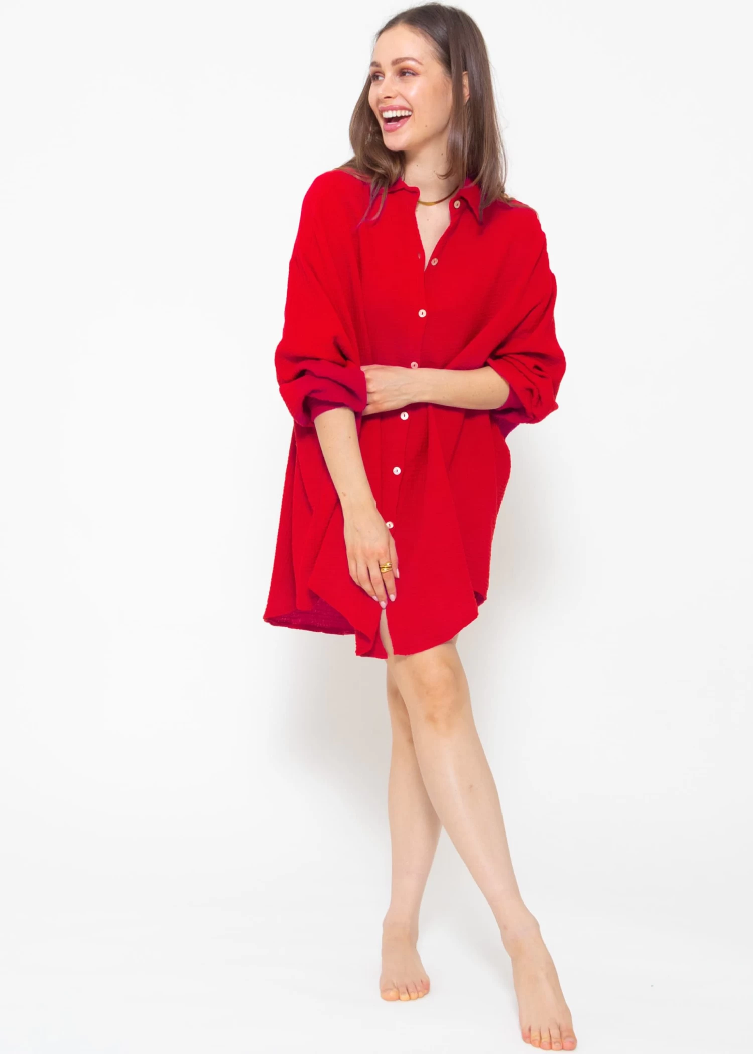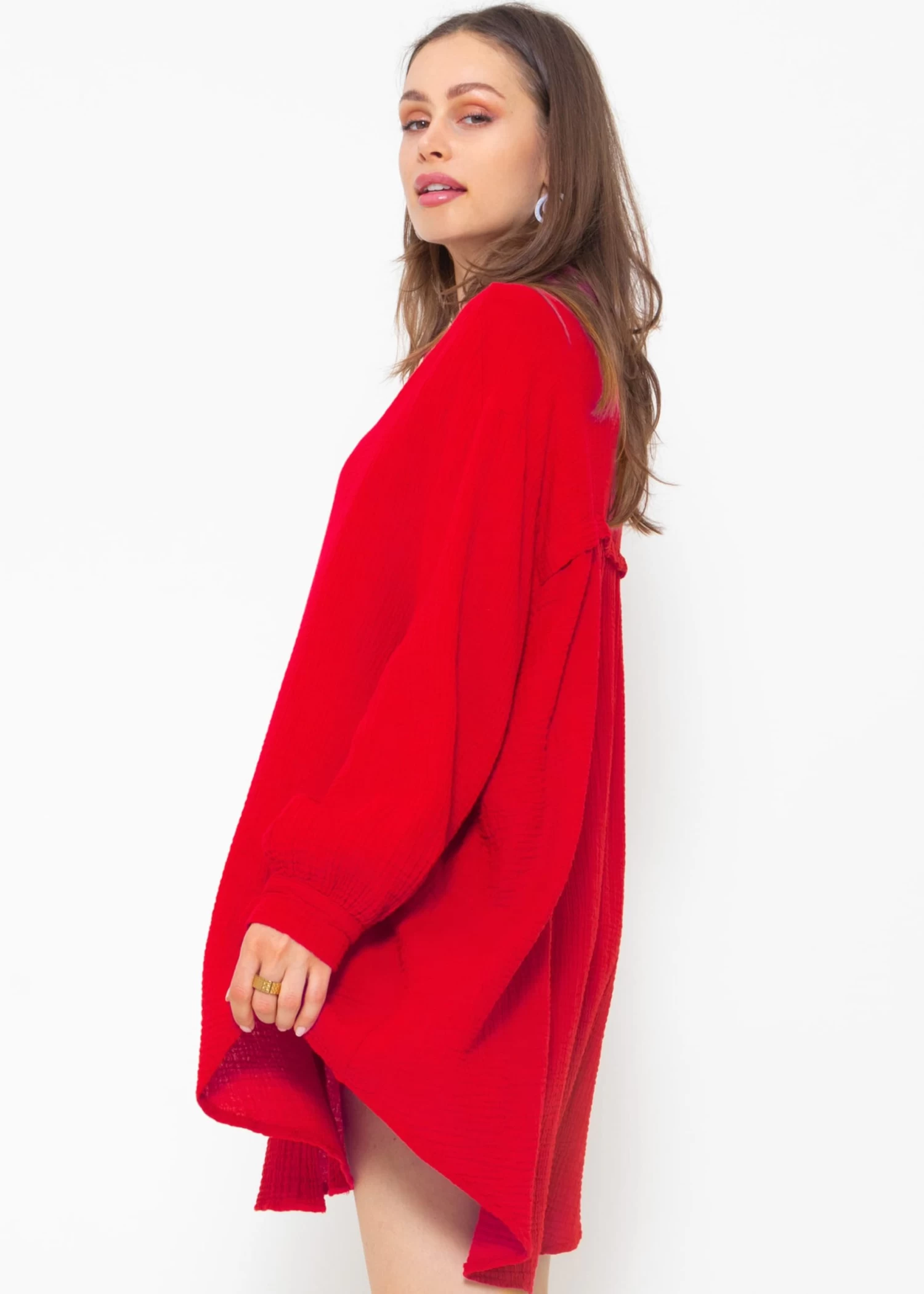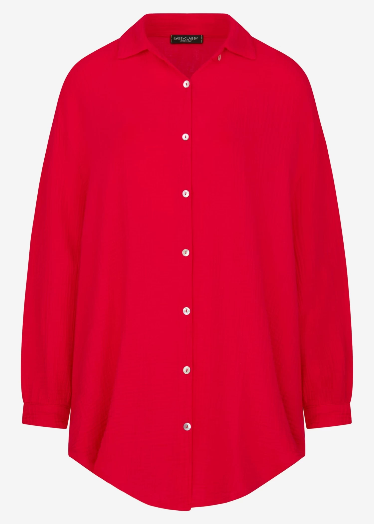 Locker fallendes Blusenhemd in Rot aus leichtem, hochwertigem Baumwoll-Musselin mit Perlmuttknöpfen. Bei diesem Modell handelt es sich um die lange Variante unserer Musselinbluse. Die stylische Longbluse besteht aus dem super soften, angenehmen und atmungsaktiven Trendstoff Musselin und ist daher ein absolutes Must-Have. Sie ist schön oversize geschnitten, fällt hinten etwas länger als vorne und besitzt überschnittene Schultern, wodurch sie ihren lässigen Look erhält. Der Kragen, der Knopfverschluss, Manschetten an den langen Ärmeln sowie die querlaufende Falte am Rücken verleihen der Musselinbluse besondere, liebevolle Details und geben ihr einen eleganten Touch. Sie ist ein treuer Begleiter für jede Jahreszeit und du kannst sie vielseitig kombinieren. Trage sie klassisch als Bluse, offen als Jacke oder Cardigan-Ersatz über einem Top, als Kleid, unter einem Pullover für einen zeitlosen Layering-Look oder einfach trendig geknotet mit tiefem Ausschnitt über einen schönen Spitzen-BH. Dieser raffinierte Allrounder kommt in Einheitsgröße und wird bis Größe 48 empfohlen.