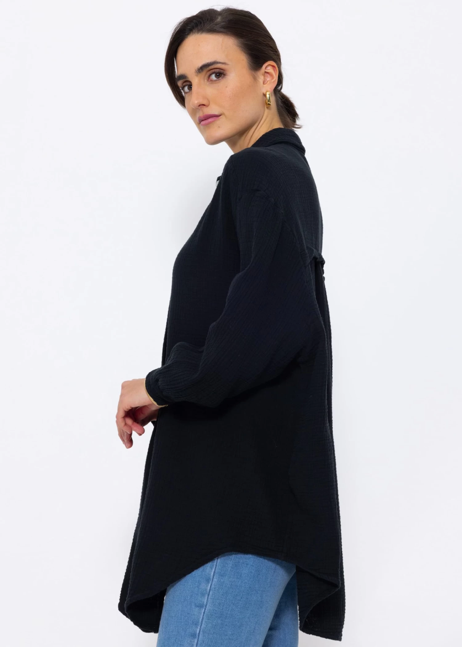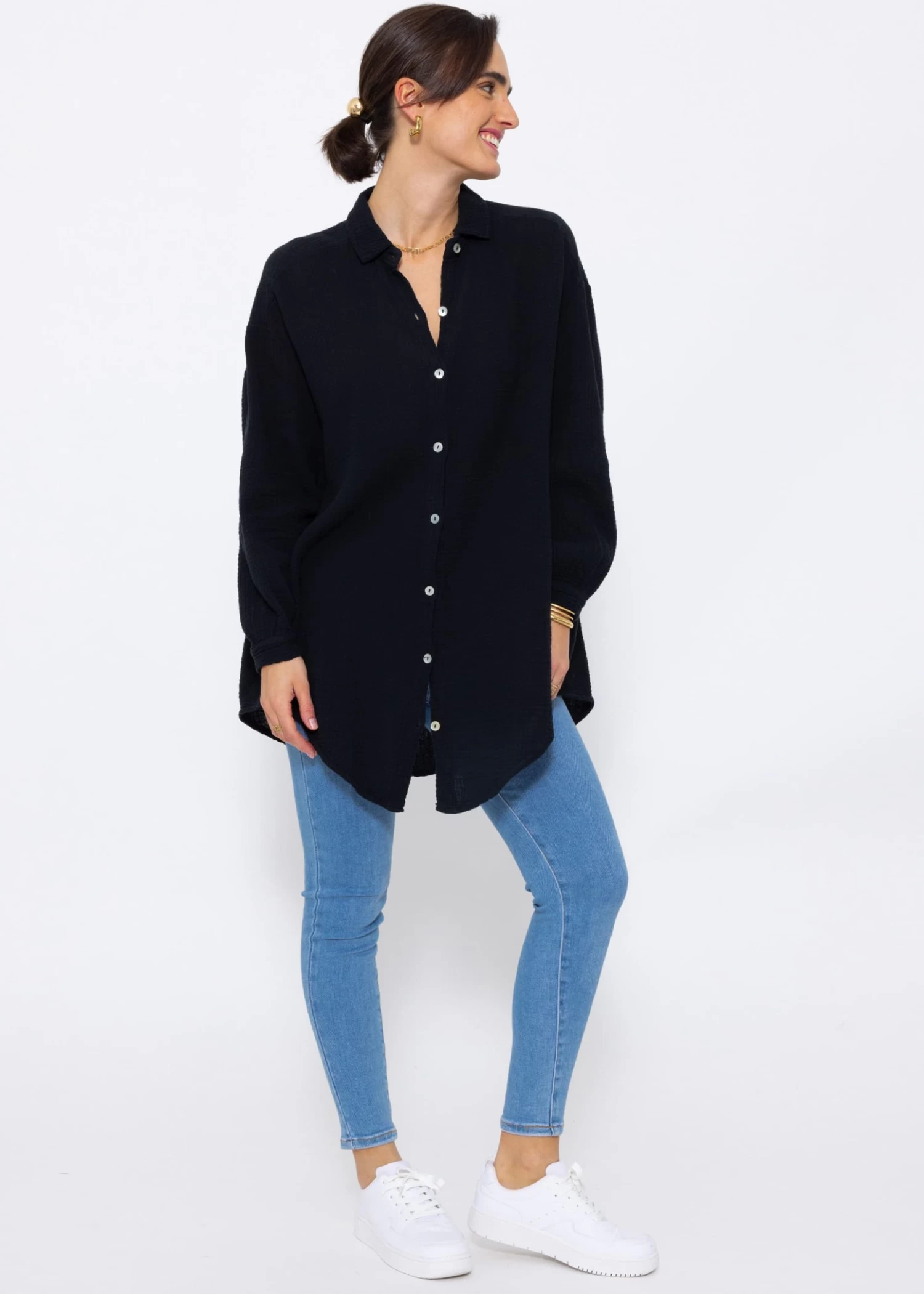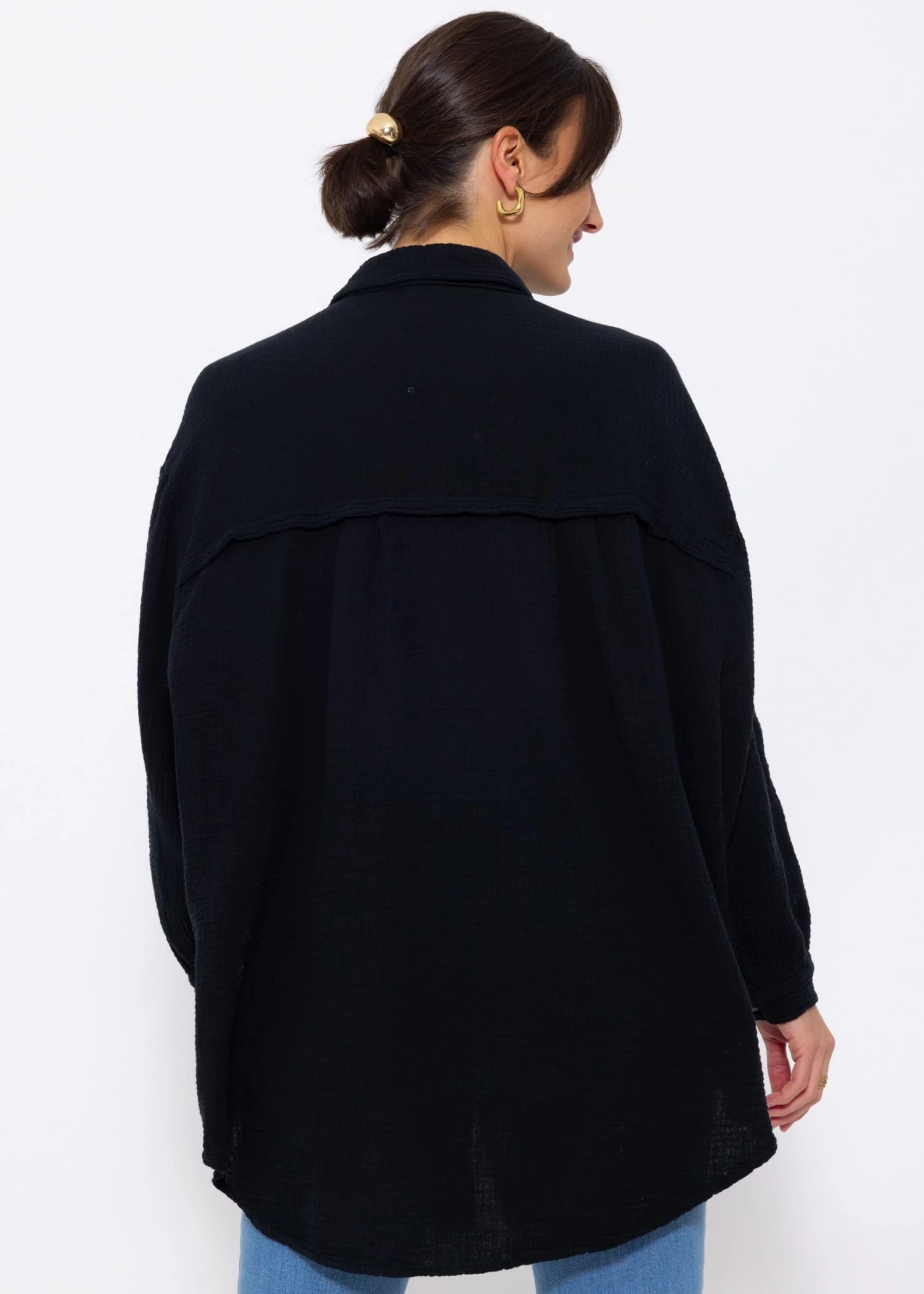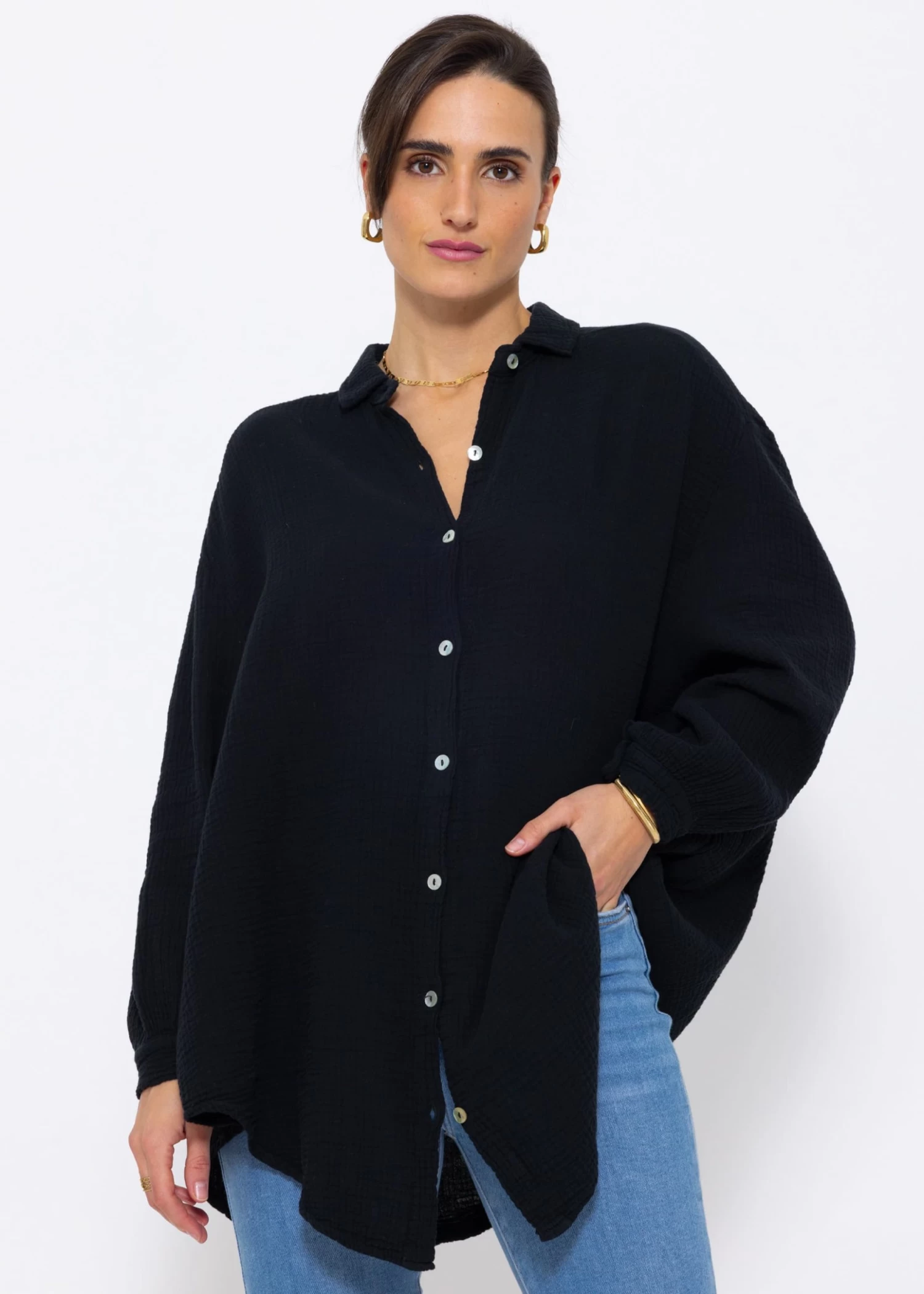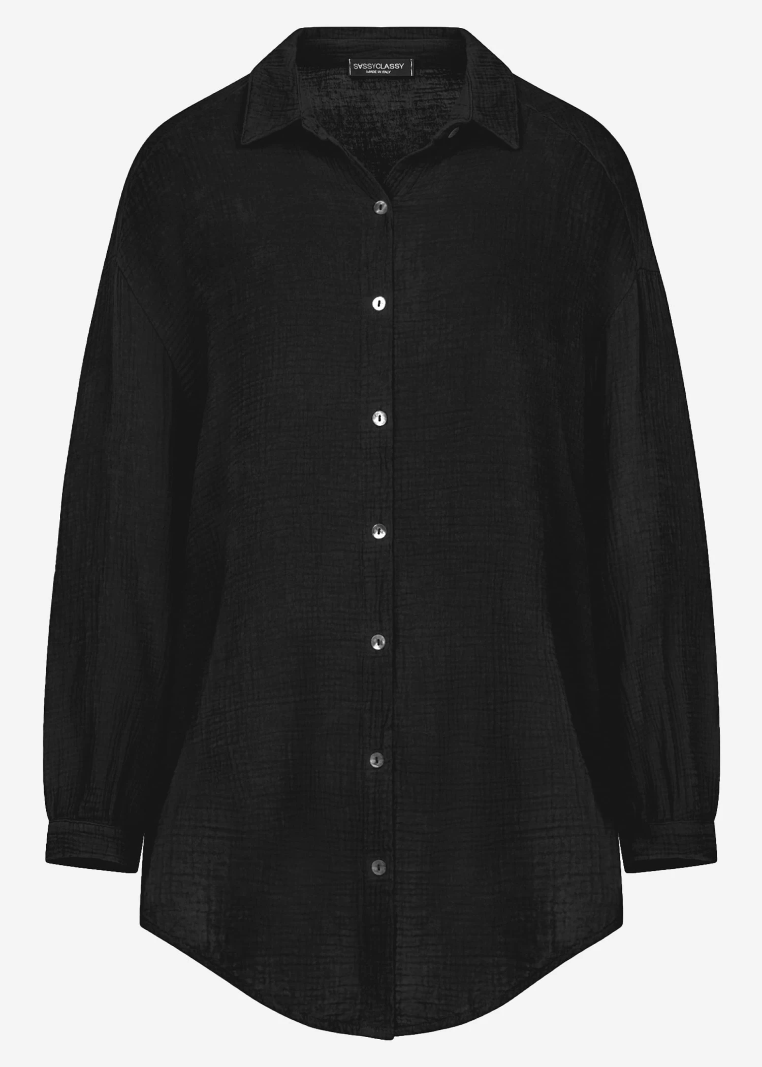 Locker fallendes Blusenhemd in Schwarz aus leichtem, hochwertigem Baumwoll-Musselin mit Perlmuttknöpfen. Bei diesem Modell handelt es sich um die lange Variante unserer Musselinbluse. Die stylische Longbluse besteht aus dem super soften, angenehmen und atmungsaktiven Trendstoff Musselin und ist daher ein absolutes Must-Have. Sie ist schön oversize geschnitten, fällt hinten etwas länger als vorne und besitzt überschnittene Schultern, wodurch sie ihren lässigen Look erhält. Der Kragen, der Knopfverschluss, Manschetten an den langen Ärmeln sowie die querlaufende Falte am Rücken verleihen der Musselinbluse besondere, liebevolle Details und geben ihr einen eleganten Touch. Sie ist ein treuer Begleiter für jede Jahreszeit und du kannst sie vielseitig kombinieren. Trage sie klassisch als Bluse, offen als Jacke oder Cardigan-Ersatz über einem Top, als Kleid, unter einem Pullover für einen zeitlosen Layering-Look oder einfach trendig geknotet mit tiefem Ausschnitt über einen schönen Spitzen-BH. Dieser raffinierte Allrounder kommt in Einheitsgröße und wird bis Größe 48 empfohlen
