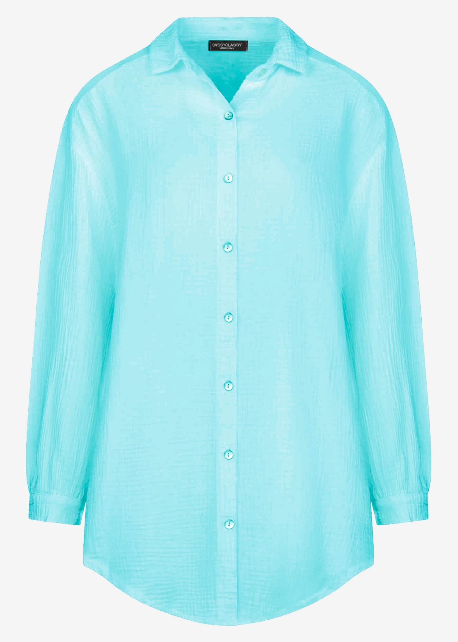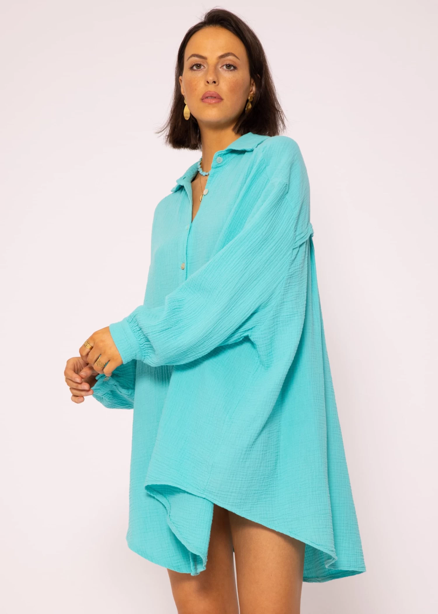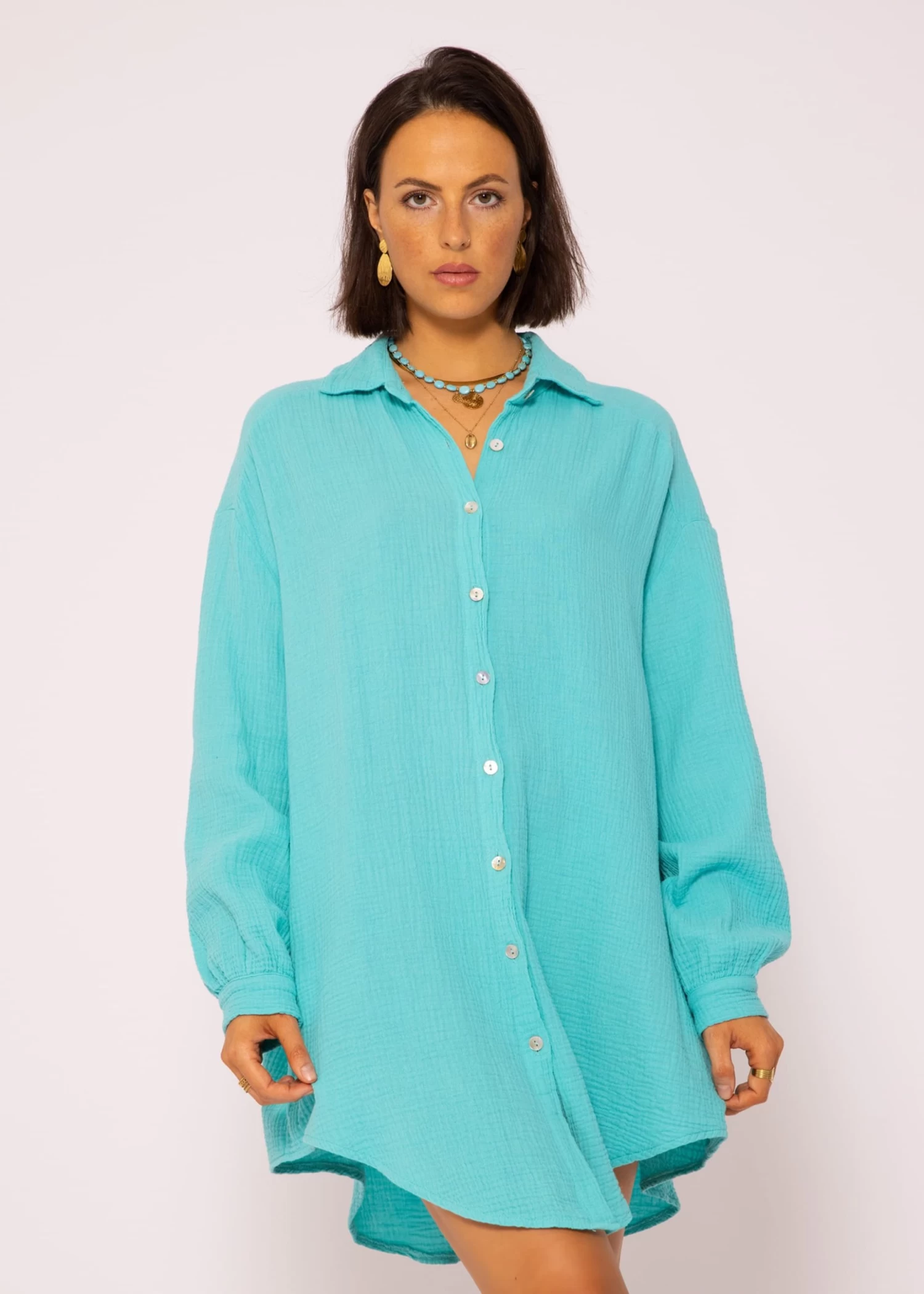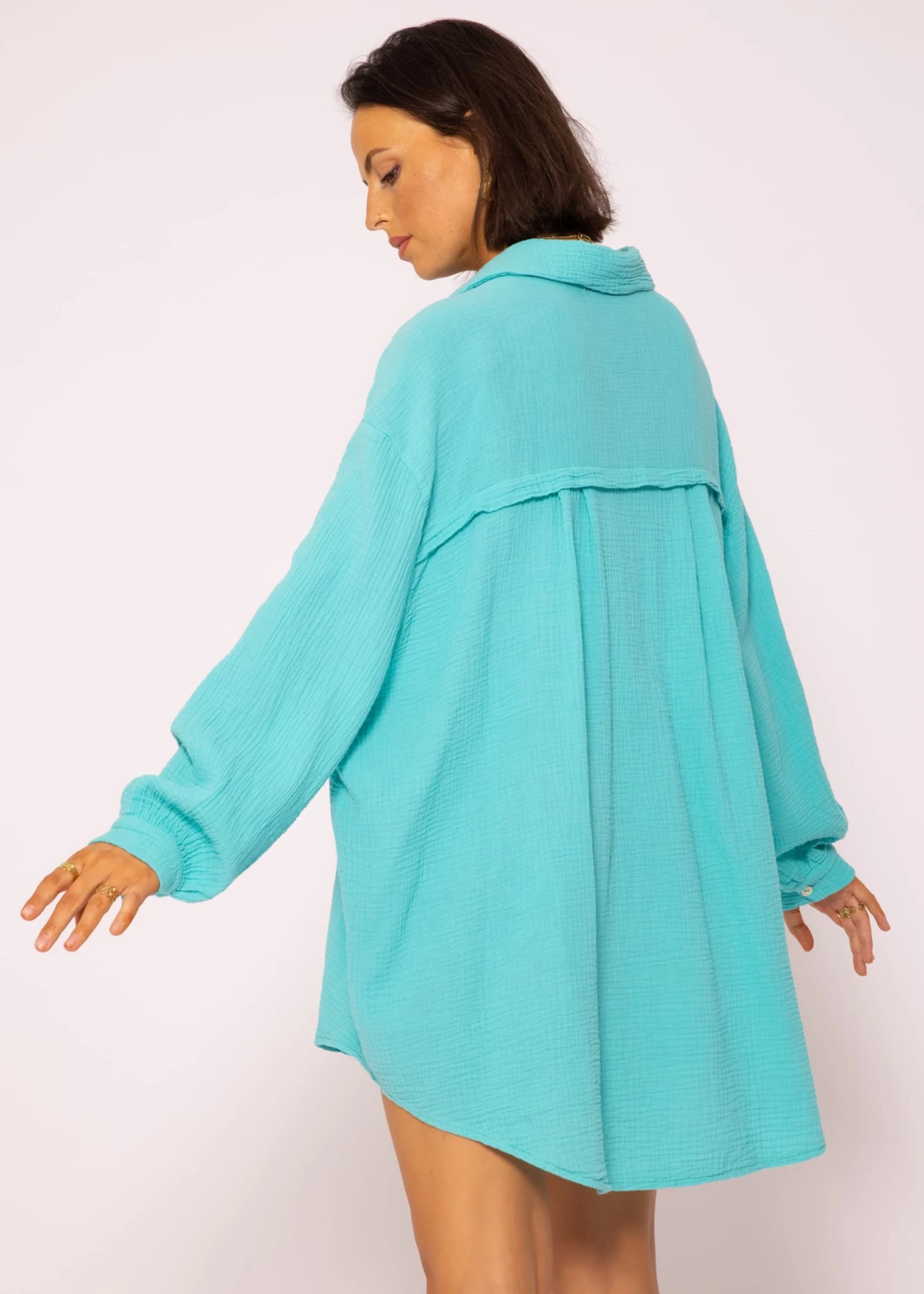 Locker fallendes Blusenhemd in türkis aus leichtem, hochwertigem Baumwoll-Musselin mit Perlmuttknöpfen. Bei diesem Modell handelt es sich um die lange Variante unserer Musselinbluse. Die stylische Longbluse besteht aus dem super soften, angenehmen und atmungsaktiven Trendstoff Musselin und ist daher ein absolutes Must-Have. Sie ist schön oversize geschnitten, fällt hinten etwas länger als vorne und besitzt überschnittene Schultern, wodurch sie ihren lässigen Look erhält. Der Kragen, der Knopfverschluss, Manschetten an den langen Ärmeln sowie die querlaufende Falte am Rücken verleihen der Musselinbluse besondere, liebevolle Details und geben ihr einen eleganten Touch. Sie ist ein treuer Begleiter für jede Jahreszeit und du kannst sie vielseitig kombinieren. Trage sie klassisch als Bluse, offen als Jacke oder Cardigan-Ersatz über einem Top, als Kleid, unter einem Pullover für einen zeitlosen Layering-Look oder einfach trendig geknotet mit tiefem Ausschnitt über einen schönen Spitzen-BH. Dieser raffinierte Allrounder kommt in Einheitsgröße und wird bis Größe 48 empfohlen.