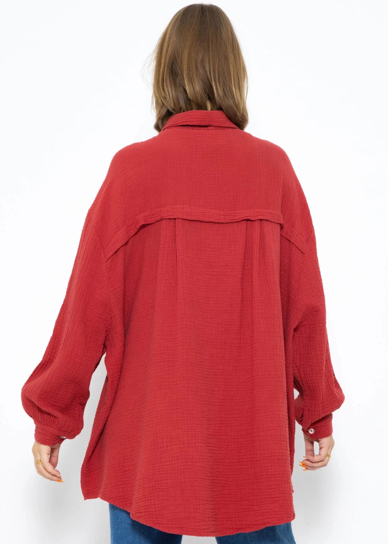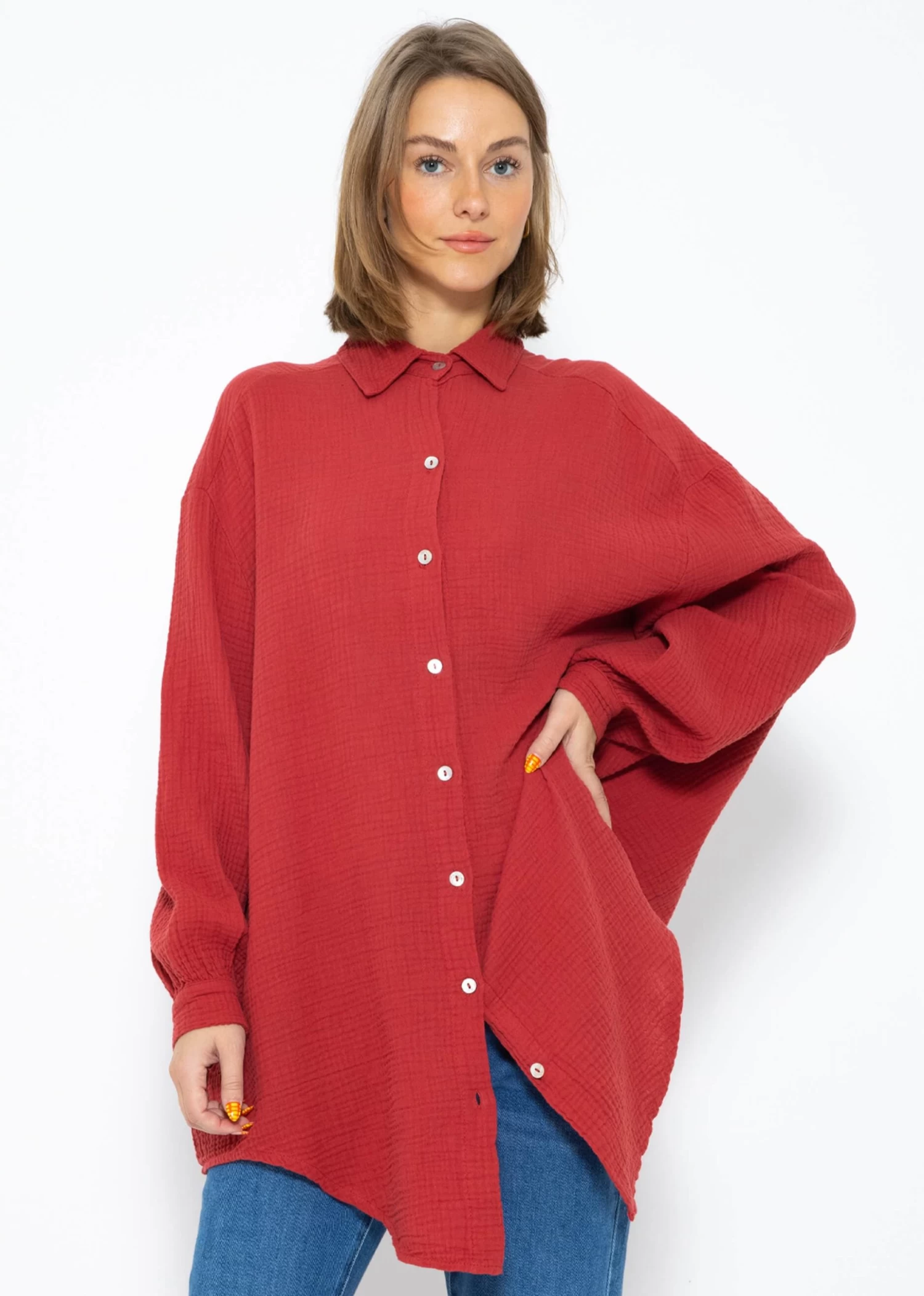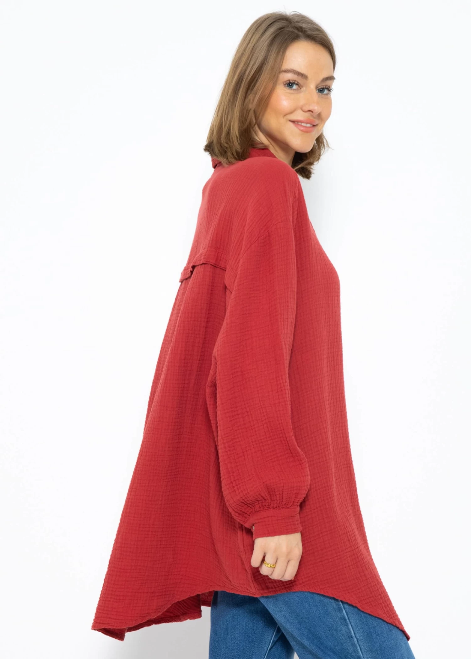 Locker fallendes Blusenhemd in Ziegelrot aus leichtem, hochwertigem Baumwoll-Musselin mit Perlmuttknöpfen. Bei diesem Modell handelt es sich um die lange Variante unserer Musselinbluse. Die stylische Longbluse besteht aus dem super soften, angenehmen und atmungsaktiven Trendstoff Musselin und ist daher ein absolutes Must-Have. Sie ist schön oversize geschnitten, fällt hinten etwas länger als vorne und besitzt überschnittene Schultern, wodurch sie ihren lässigen Look erhält. Der Kragen, der Knopfverschluss, Manschetten an den langen Ärmeln sowie die querlaufende Falte am Rücken verleihen der Musselinbluse besondere, liebevolle Details und geben ihr einen eleganten Touch. Sie ist ein treuer Begleiter für jede Jahreszeit und du kannst sie vielseitig kombinieren. Trage sie klassisch als Bluse, offen als Jacke oder Cardigan-Ersatz über einem Top, als Kleid, unter einem Pullover für einen zeitlosen Layering-Look oder einfach trendig geknotet mit tiefem Ausschnitt über einen schönen Spitzen-BH. Dieser raffinierte Allrounder kommt in Einheitsgröße und wird bis Größe 48 empfohlen