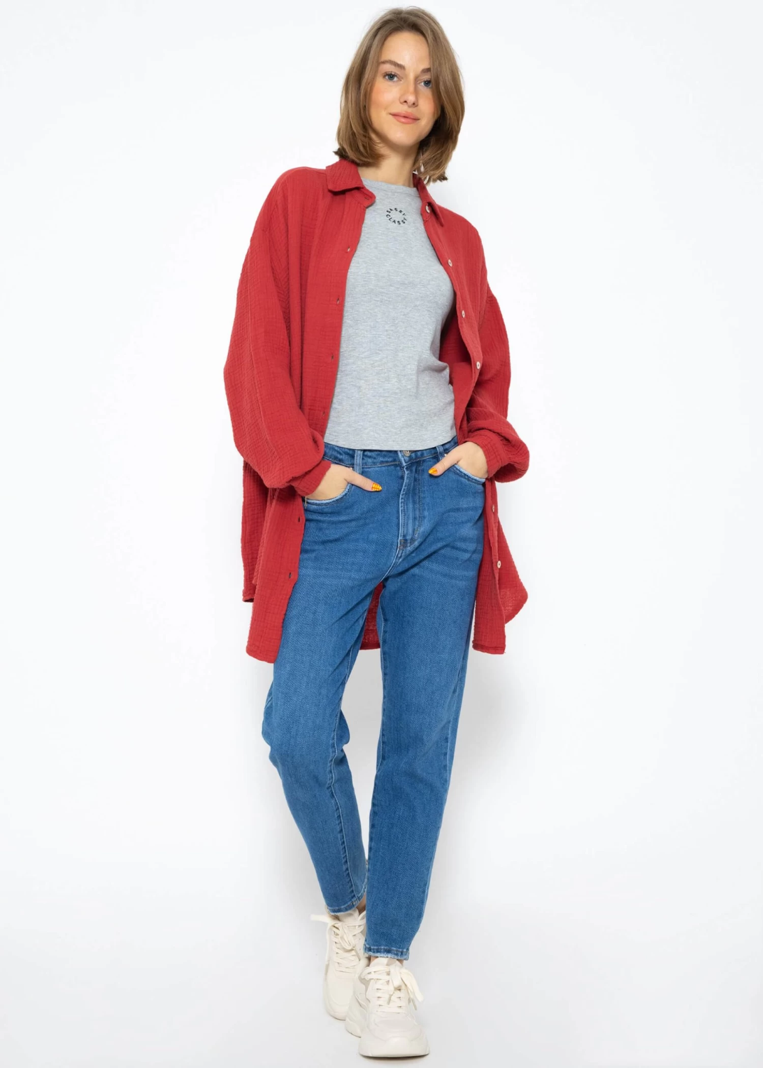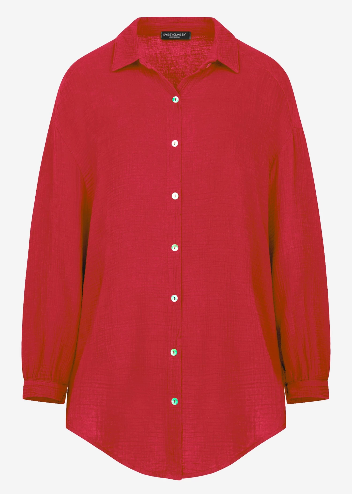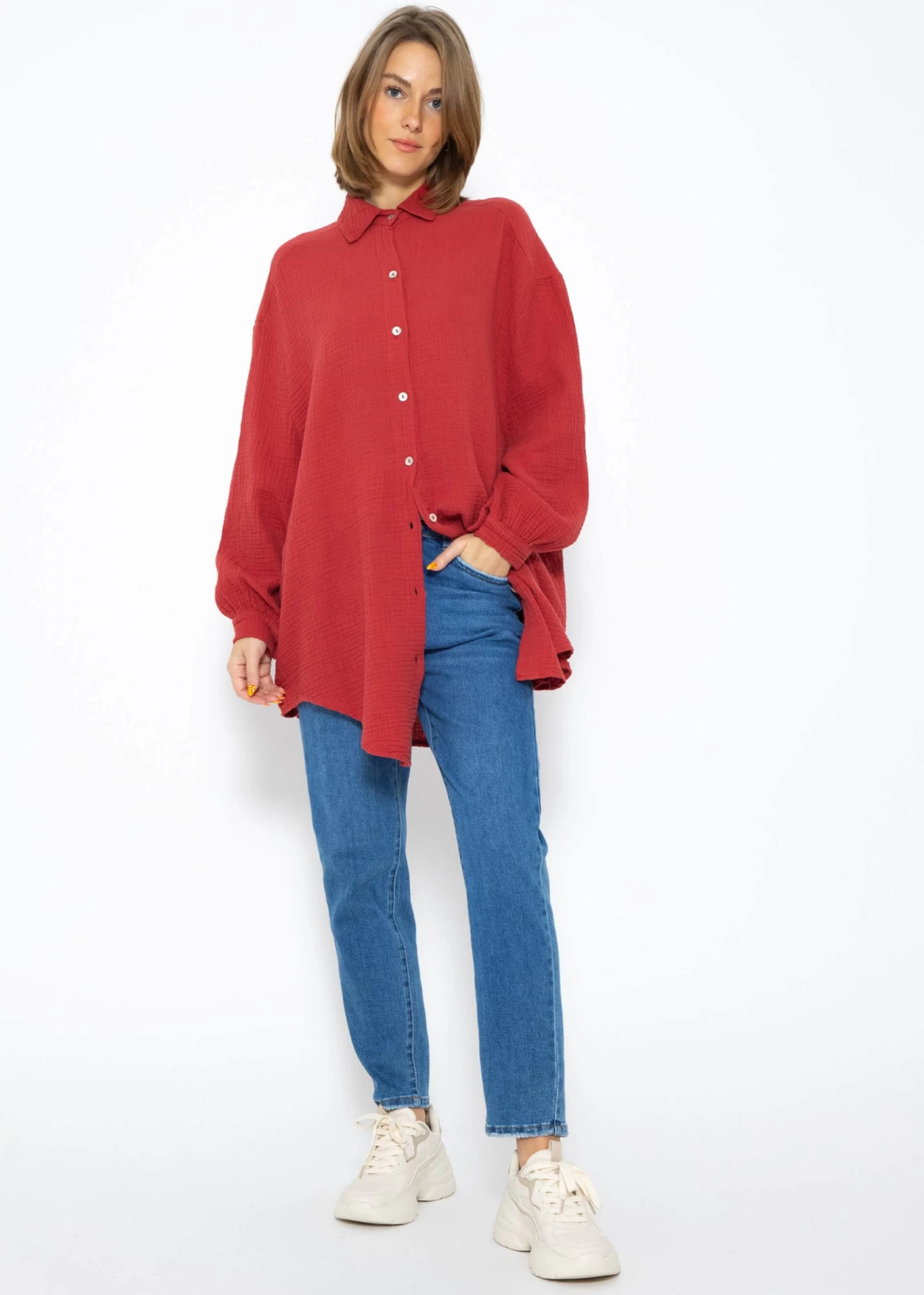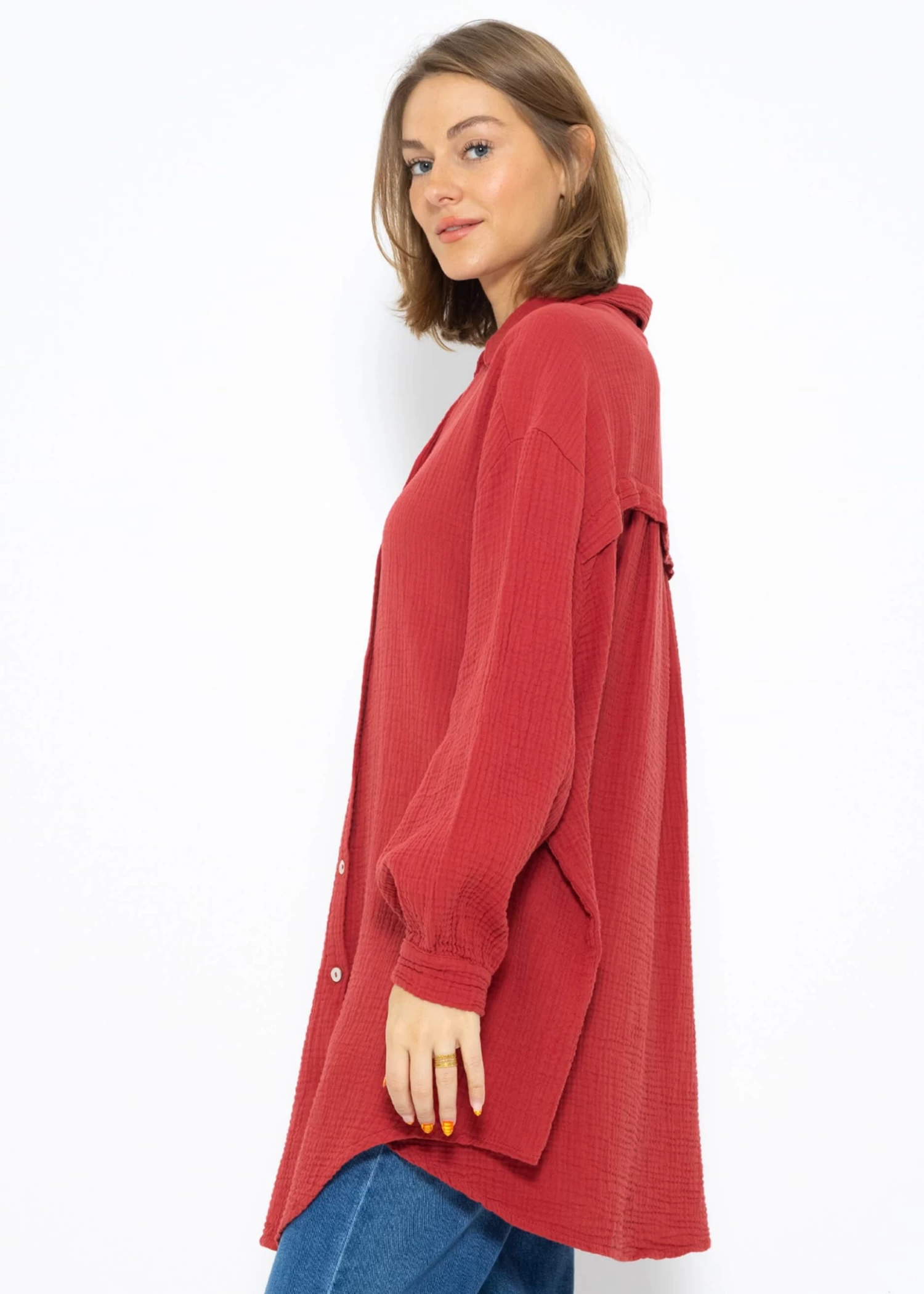 Locker fallendes Blusenhemd in Ziegelrot aus leichtem, hochwertigem Baumwoll-Musselin mit Perlmuttknöpfen. Bei diesem Modell handelt es sich um die lange Variante unserer Musselinbluse. Die stylische Longbluse besteht aus dem super soften, angenehmen und atmungsaktiven Trendstoff Musselin und ist daher ein absolutes Must-Have. Sie ist schön oversize geschnitten, fällt hinten etwas länger als vorne und besitzt überschnittene Schultern, wodurch sie ihren lässigen Look erhält. Der Kragen, der Knopfverschluss, Manschetten an den langen Ärmeln sowie die querlaufende Falte am Rücken verleihen der Musselinbluse besondere, liebevolle Details und geben ihr einen eleganten Touch. Sie ist ein treuer Begleiter für jede Jahreszeit und du kannst sie vielseitig kombinieren. Trage sie klassisch als Bluse, offen als Jacke oder Cardigan-Ersatz über einem Top, als Kleid, unter einem Pullover für einen zeitlosen Layering-Look oder einfach trendig geknotet mit tiefem Ausschnitt über einen schönen Spitzen-BH. Dieser raffinierte Allrounder kommt in Einheitsgröße und wird bis Größe 48 empfohlen