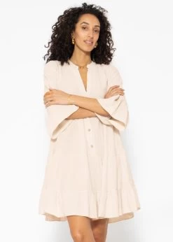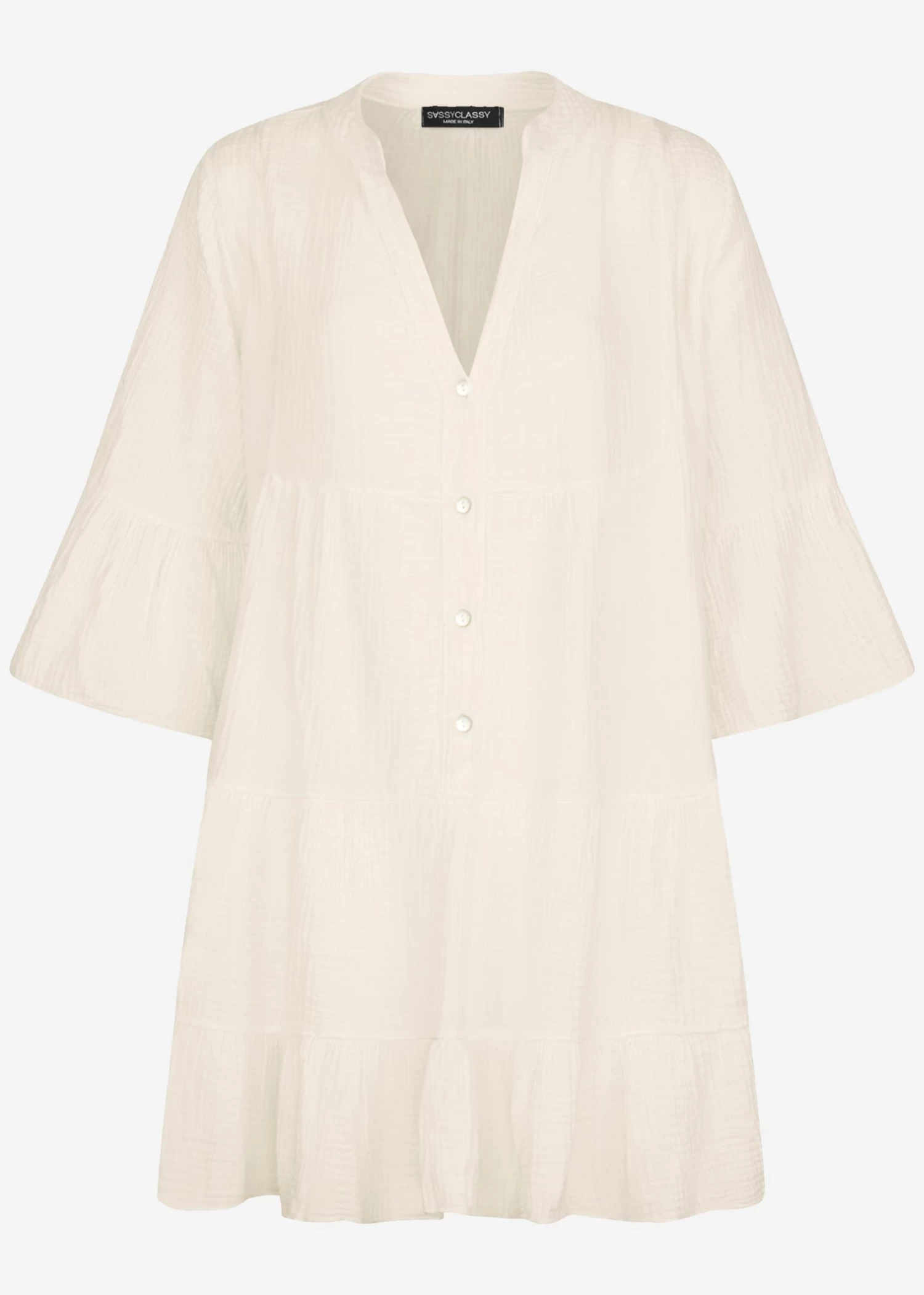 Vorne geknöpftes Kleid aus Baumwoll-Musseline. Es ist lässig fallend und die 3/4 Ärmel schließen mit Volants ab. Der V-Ausschnitt ist zusätzlich mit einem Stehkragen verziert. Empfohlen bis Größe 42