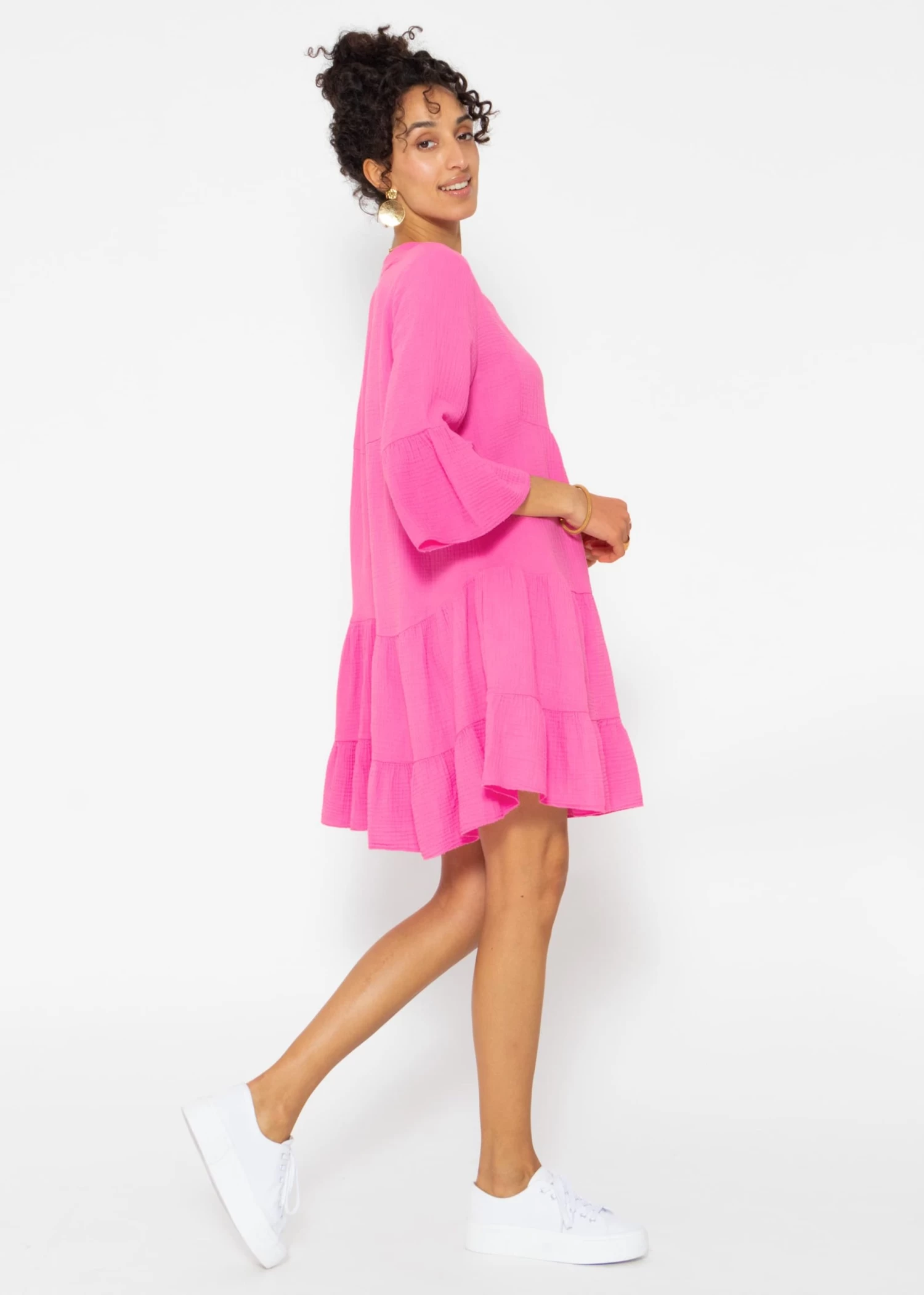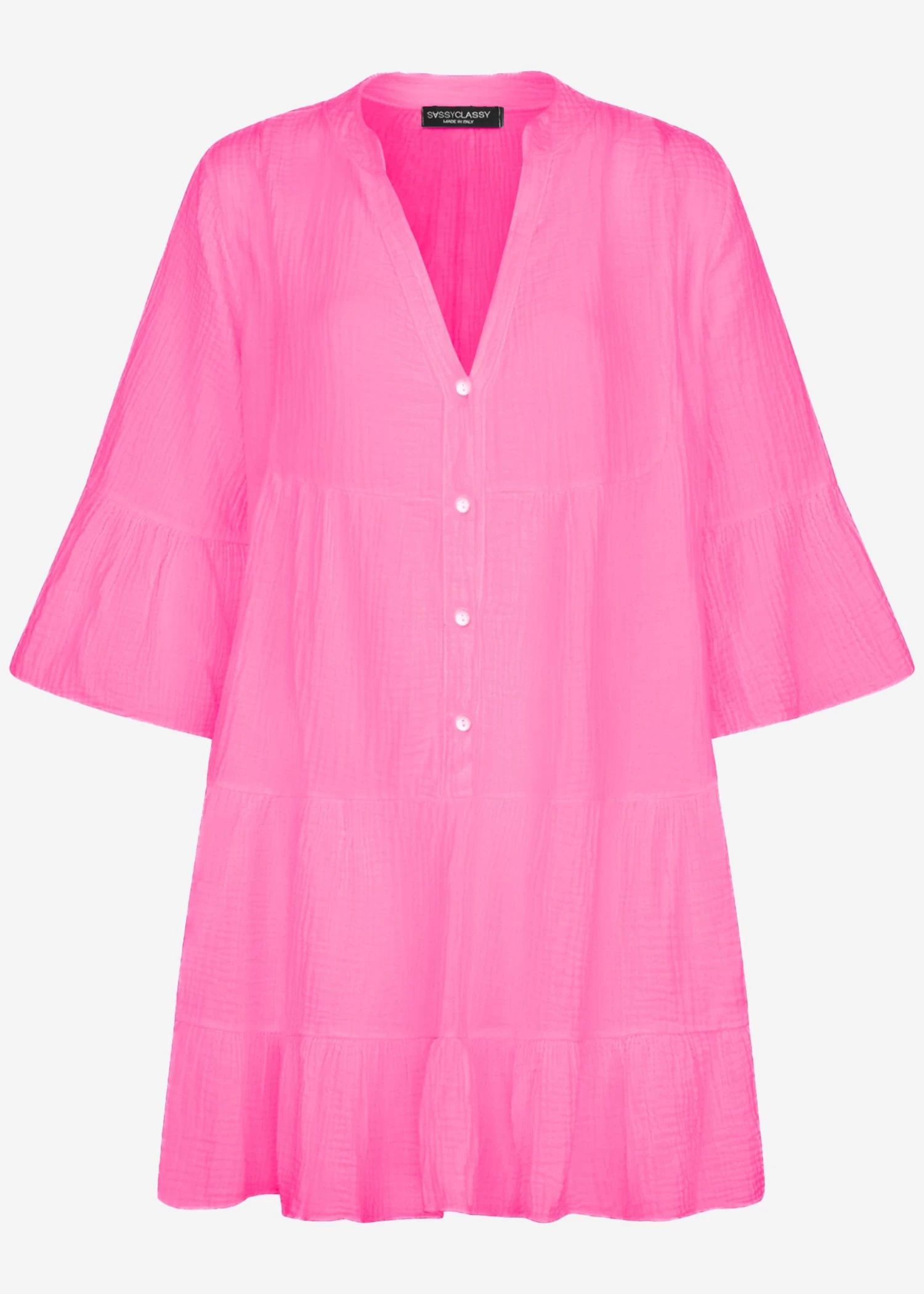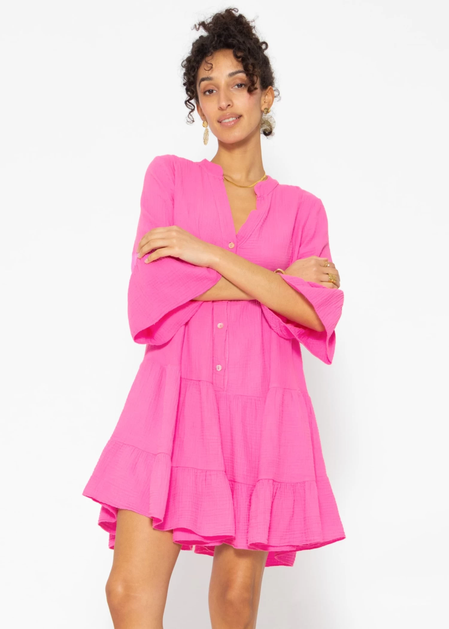 Vorne geknöpftes Kleid aus Baumwoll-Musseline. Es ist lässig fallend und die 3/4 Ärmel schließen mit Volants ab. Der V-Ausschnitt ist zusätzlich mit einem Stehkragen verziert. Empfohlen bis Größe 42