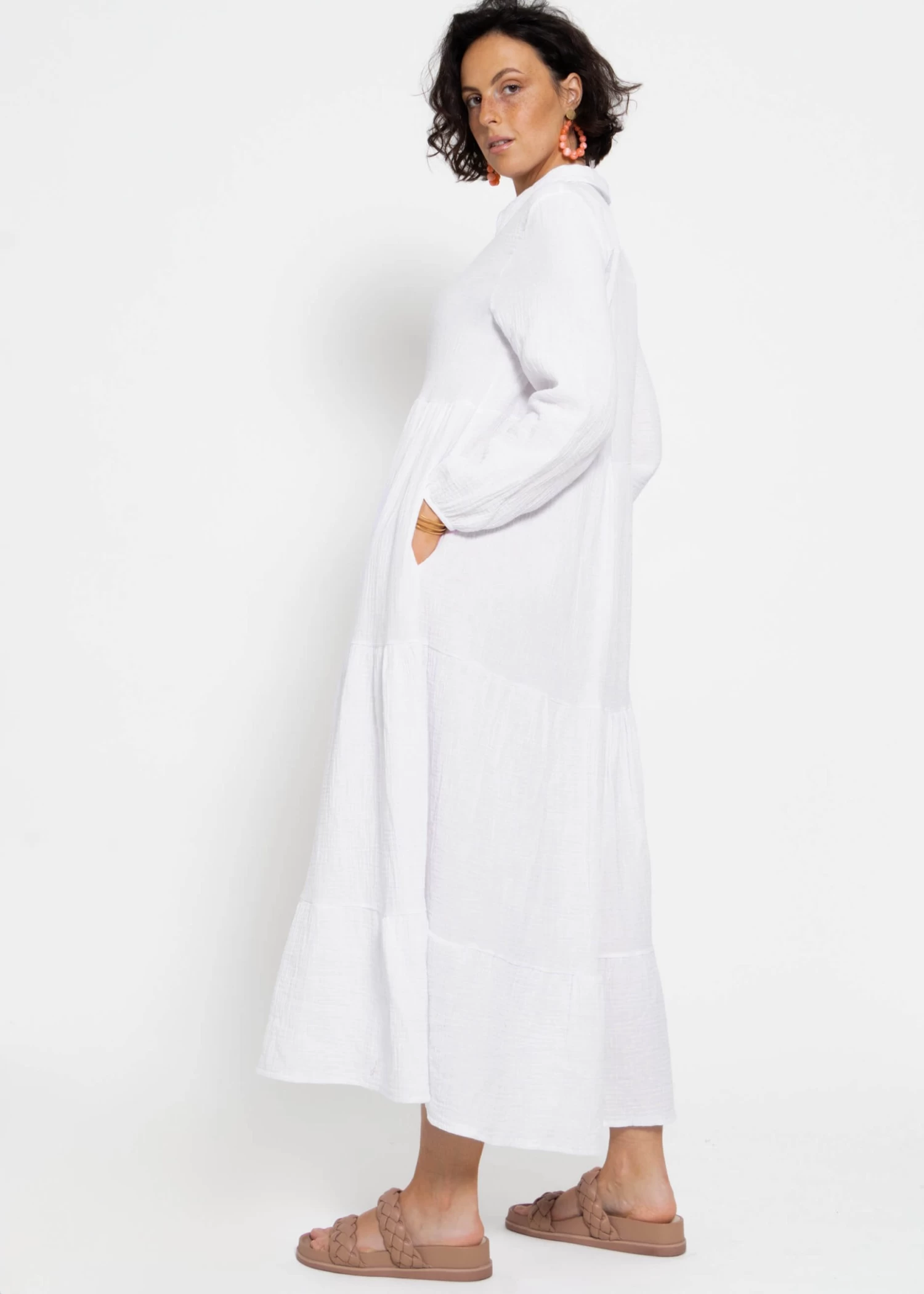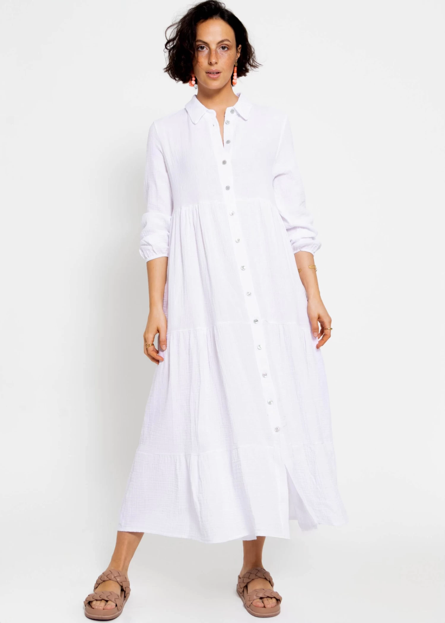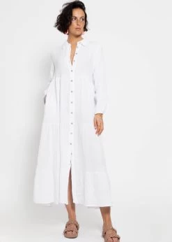 Dieses schöne Maxikleid aus Baumwollmusselin verbindet gekonnt femininen Charme mit entspanntem Komfort und ist ein absolutes Statement Piece für den Sommer. Das Modell besitzt einen Kragen und eine durchgehende Knopfleiste, wodurch es vielseitig getragen werden kann. Mit seinen langen Ärmeln, die mit einem Gummizug abschließen und dem sanft ausgestellten Schnitt in Stufen, ist dieses Kleid der Inbegriff von Verspieltheit und Eleganz. Die Oversize-Passform schmeichelt jeder Figur und bietet Bewegungsfreiheit, während die Maxilänge für einen eleganten, fließenden Effekt sorgt. Seitliche Eingrifftaschen geben dem Kleid einen sportlichen Touch. Du kannst das Kleid sowohl lässig mit Sandalen als auch schick mit Absätzen stylen.