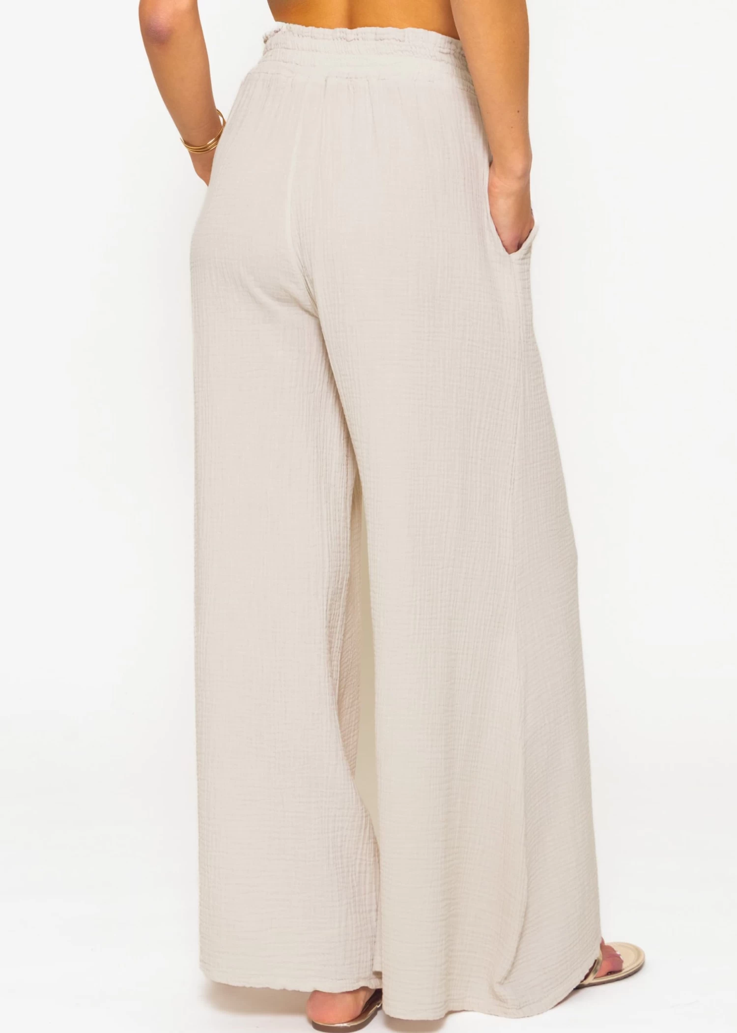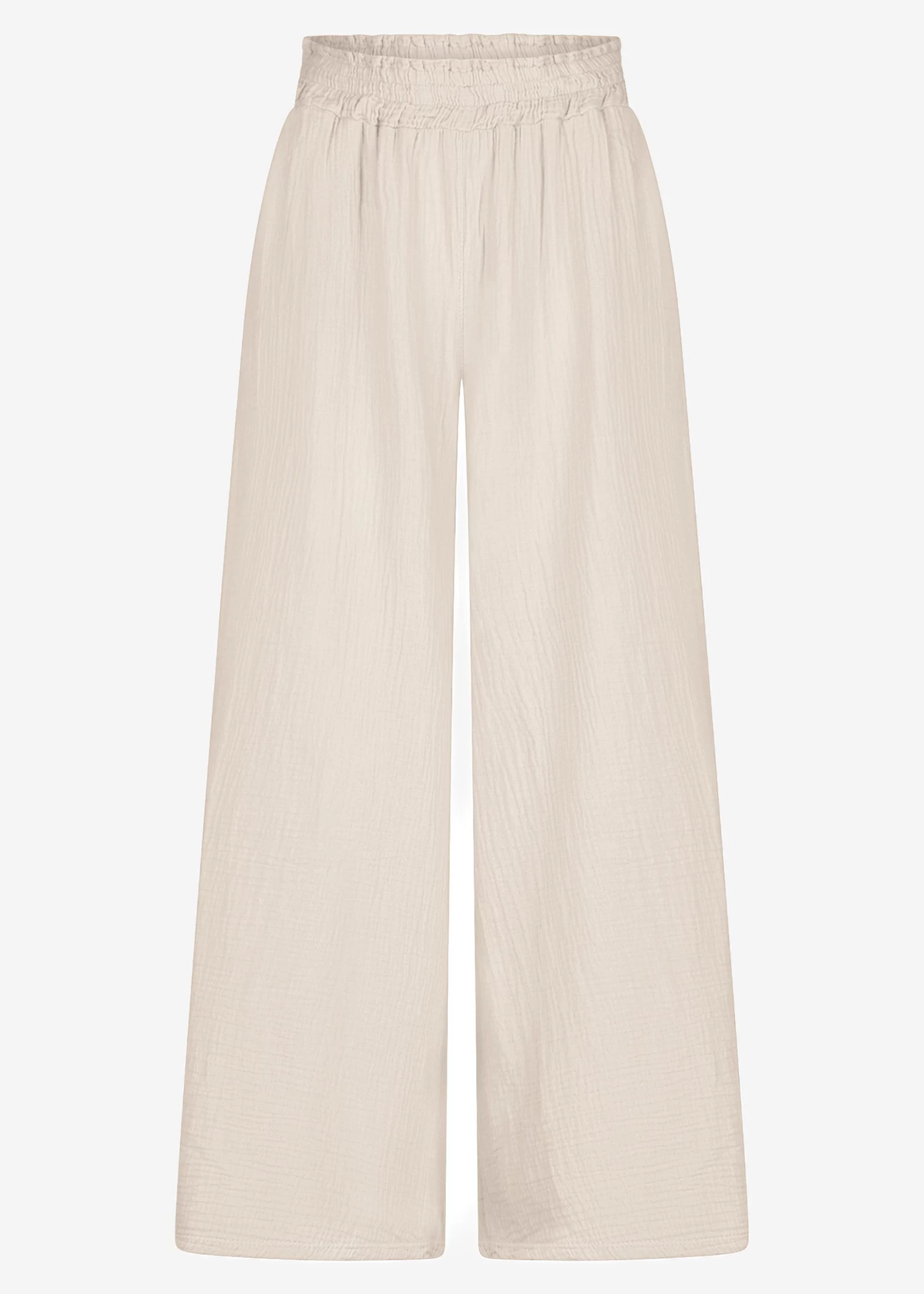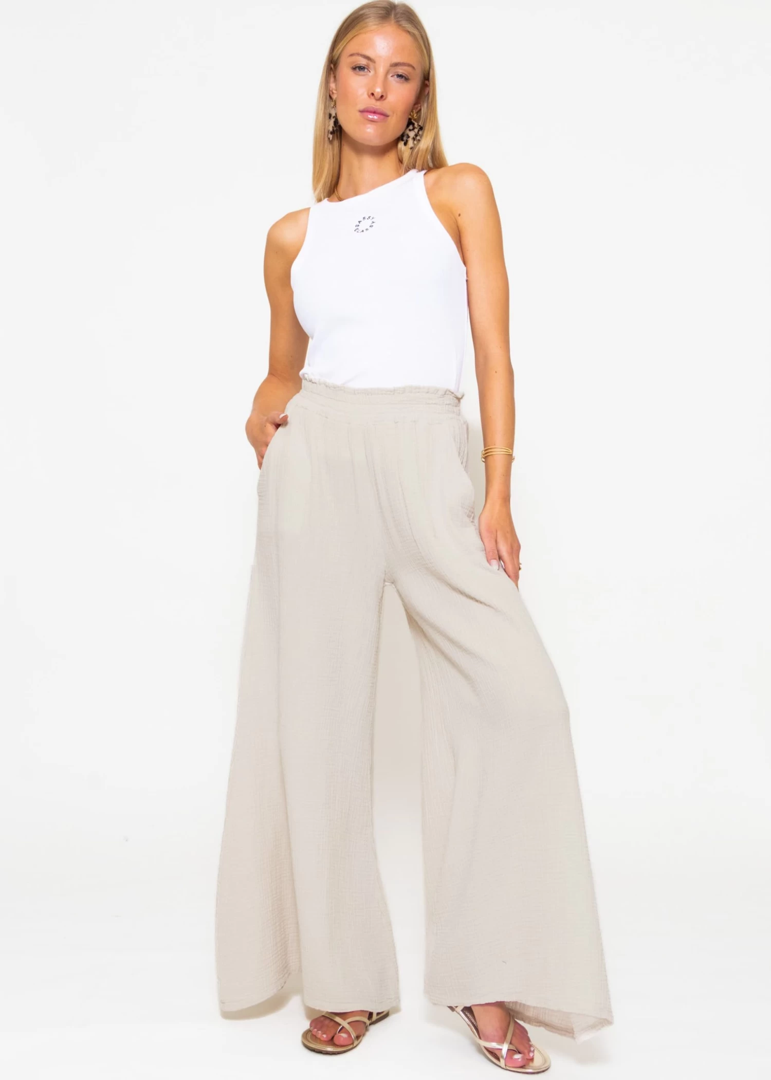 Weite Musselin Hose in Hellbeige. Das sehr weit geschnittene Bein und der lockere Fit bieten unglaubliche Bewegungsfreiheit und kreieren einen total angesagten, bequemen Look. Ein hoher elastischer Bund mit Gummizug sorgt für den optimalen Sitz. Das Modell besitzt schräge, seitliche Eingrifftaschen, die der Hose einen coolen Touch geben, während der lange, fließende Beinverlauf Eleganz verleiht. Das praktische Schlupf-Modell wurde in Italien aus Musselin-Baumwolle gefertigt und trägt dadurch zu einem luftigen Design bei. Wir empfehlen ein anliegendes Basic Crop-Top oder ein Multiway Top zu dieser Hose sowie eine Musselin Bluse in gleicher Struktur.