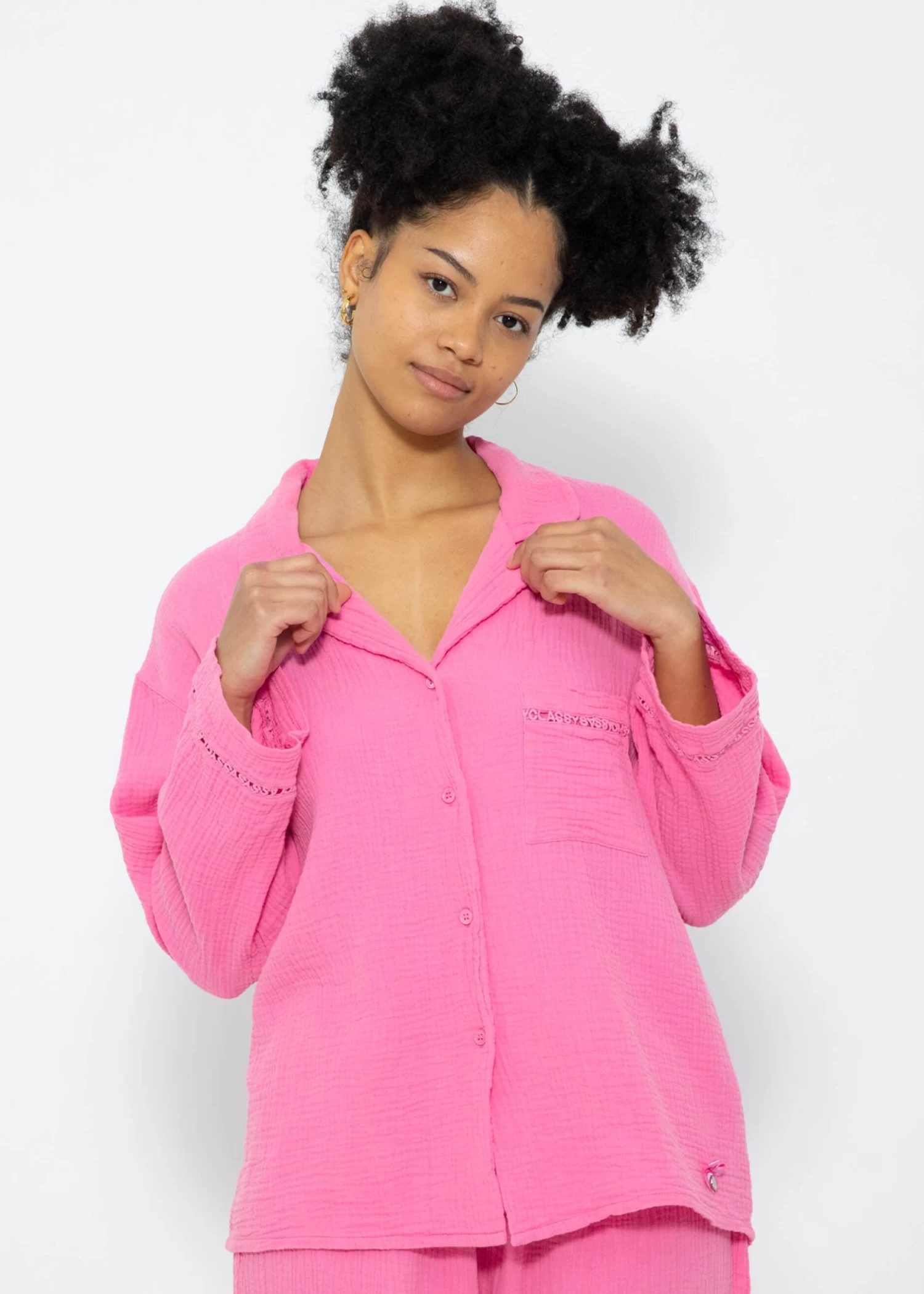 Musselin Pyjama Bluse mit Spitzenborte in Pink