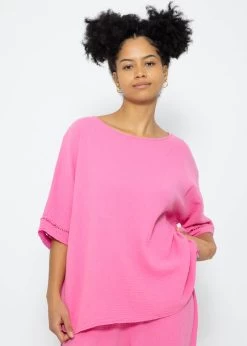 Musselin Pyjama Shirt mit Spitzenborte in Pink