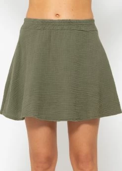 Musselin Rock/Shorts in Khaki. Unsere neuste Kreation aus unserem bekannten Baumwoll-Musselin ist stylisch, praktisch, schlicht und hochwertig zugleich. Das Modell ist ein raffiniertes Fashion-Highlight und zeigt die Optik eines Rockes, besitzt darunter aber eine integrierte Shorts, wodurch ein optimaler Sitz sowie uneingeschränkte Bewegungsfreiheit garantiert wird. Das Design verfügt über eine hohe Taillierung, Mini-Länge, einen elastischen Gummibund und eine lockere Passform. Als Stylingkombination empfehlen wir ein anliegendes Top und coole Sneakers dazu.