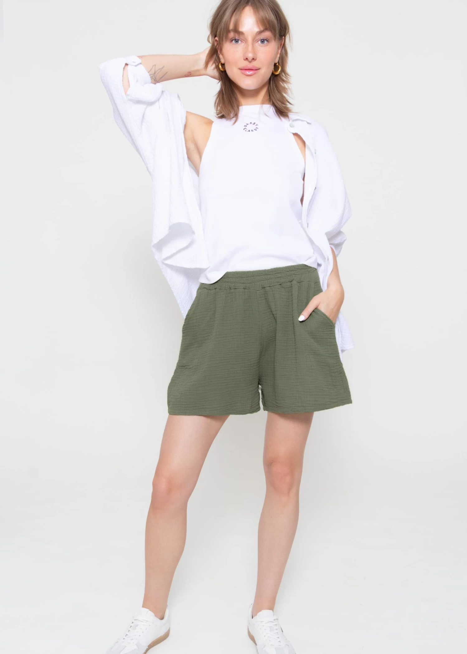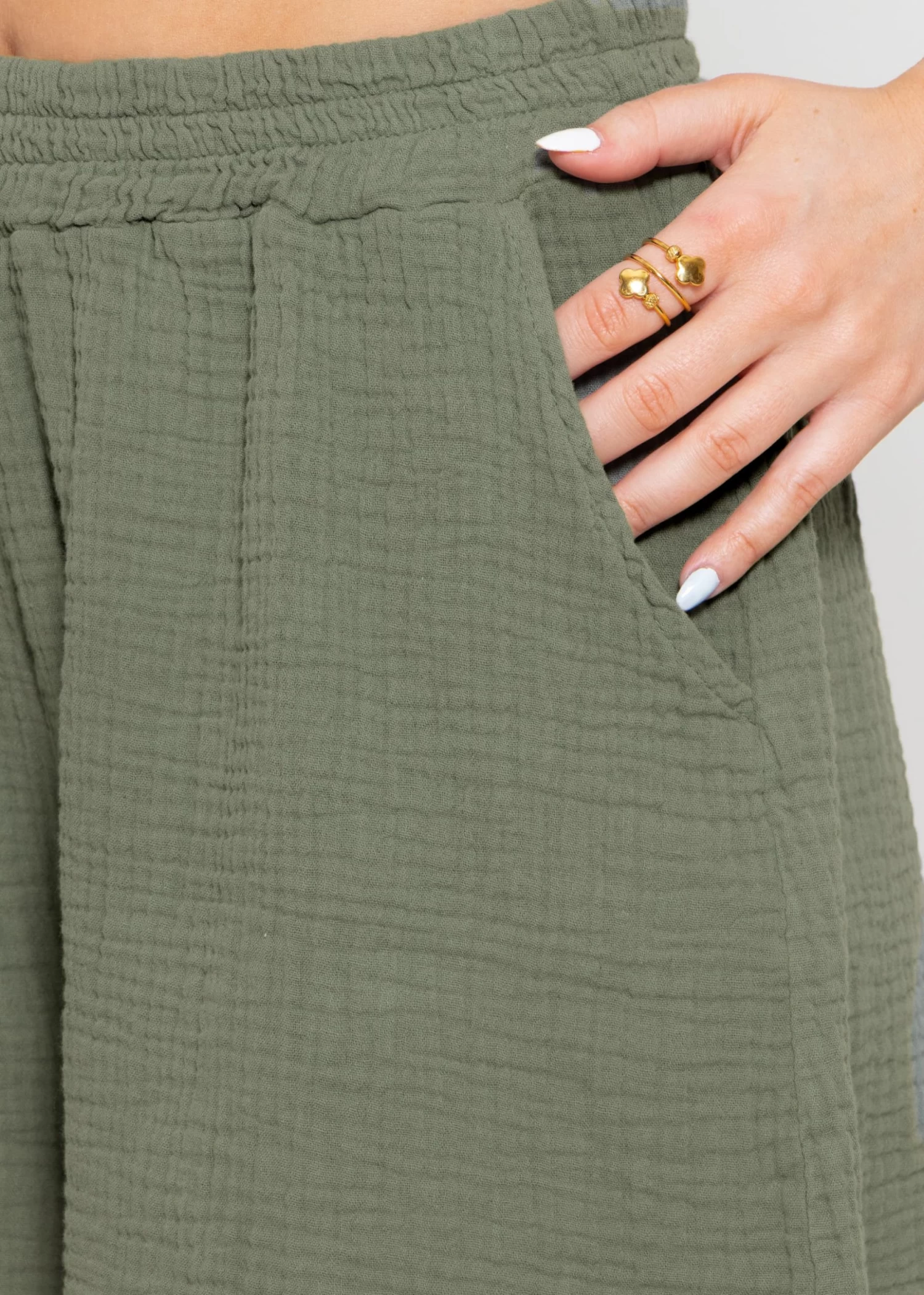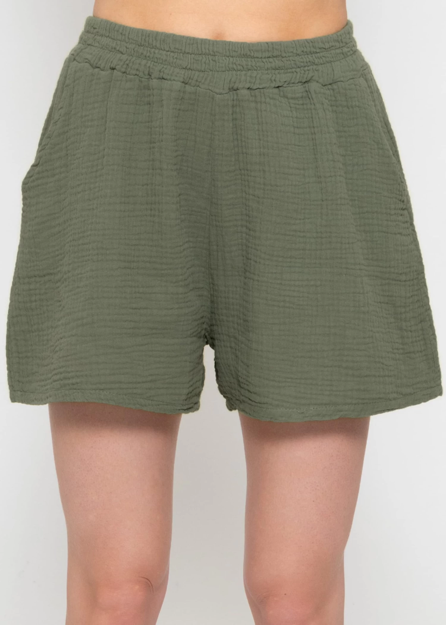 Freizeit Shorts aus softem Baumwoll-Musselin mit Gummibund. Einschubtaschen geben ihr den coolen Look.