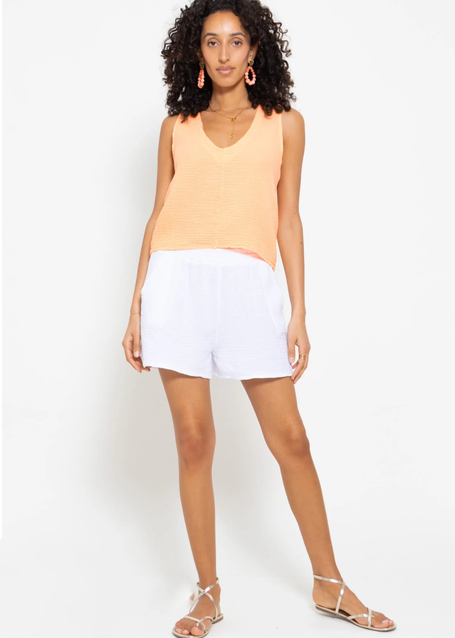 Dieses Musselin Top ist ein essenzielles Sommer-Piece und darf nicht in deinem Kleiderschrank fehlen. Es kommt in einer lockeren Passform, einem ärmellosen Design und breiten Trägern. Der tiefe V-Ausschnitt verleiht dem Top das gewisse Etwas und setzt dein Dekolleté perfekt in Szene. Auf der Vorderseite befindet sich mittig des Oberteils eine Teilungsnaht, die für zusätzliche Details sorgt. Ein abgerundeter Saumabschluss vervollständigt das Design auf geschickte Weise. Es wurde aus reinem Baumwoll-Musselin hergestellt und wirkt daher luftig und leicht. Trage es zu einer schönen Jeans oder Shorts und Sneakers für einen lässigen Look.