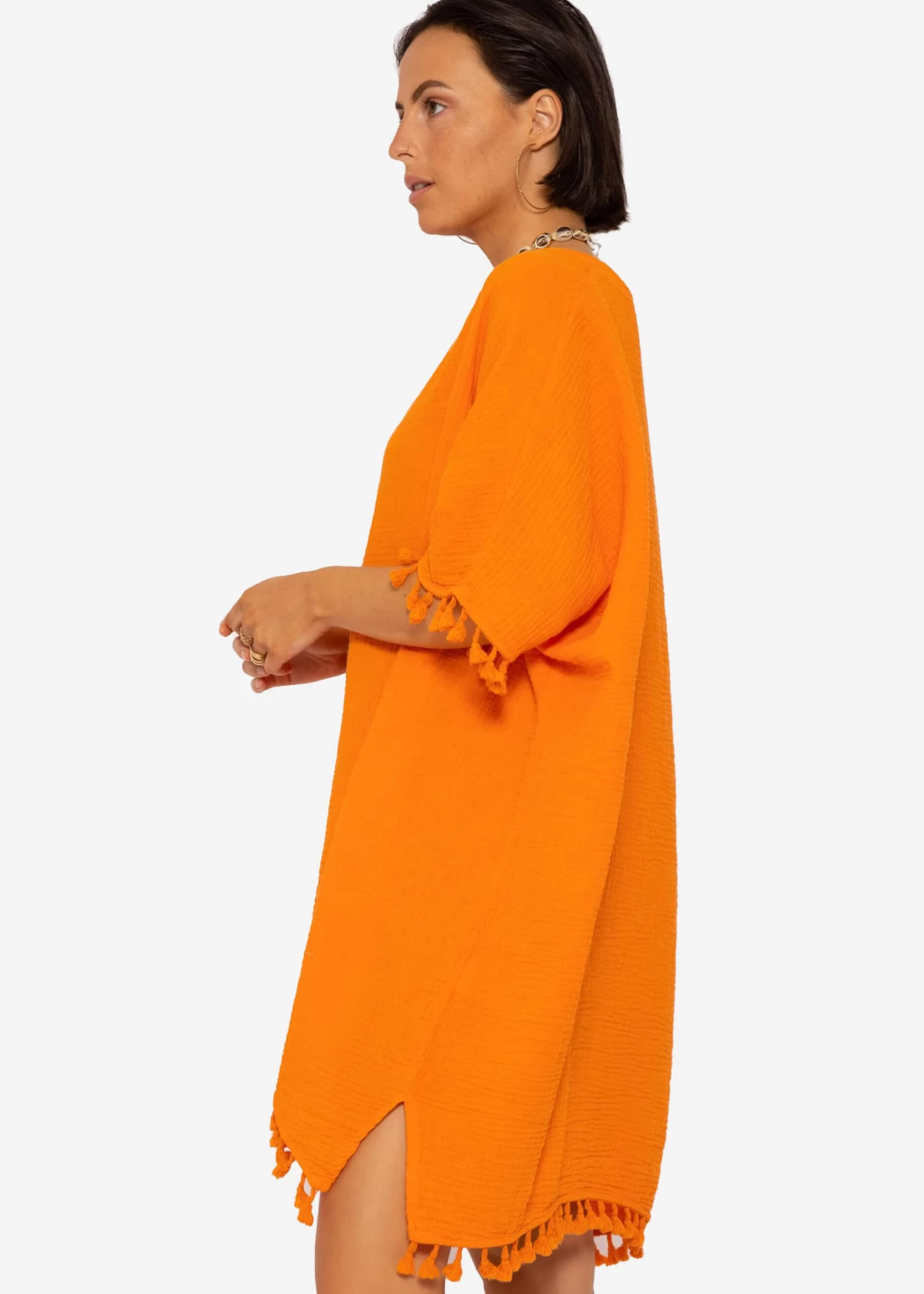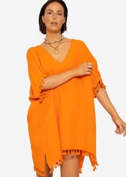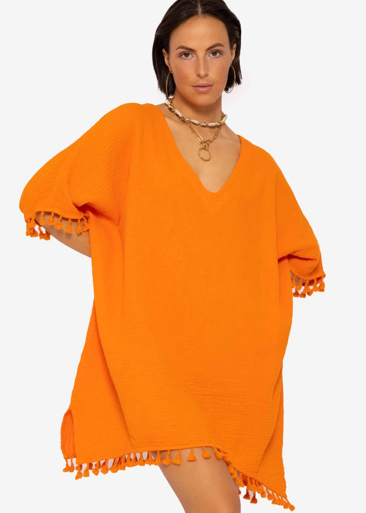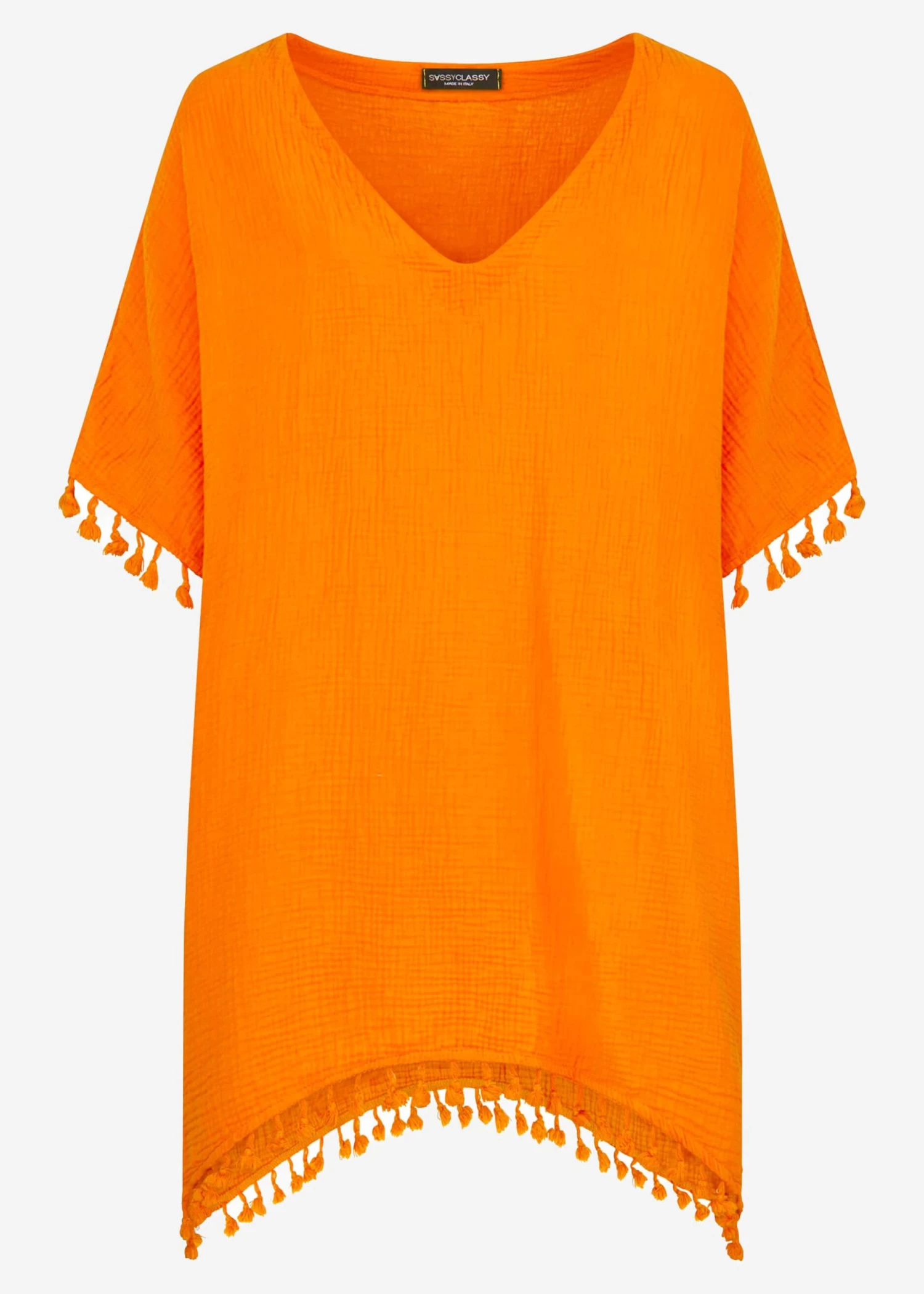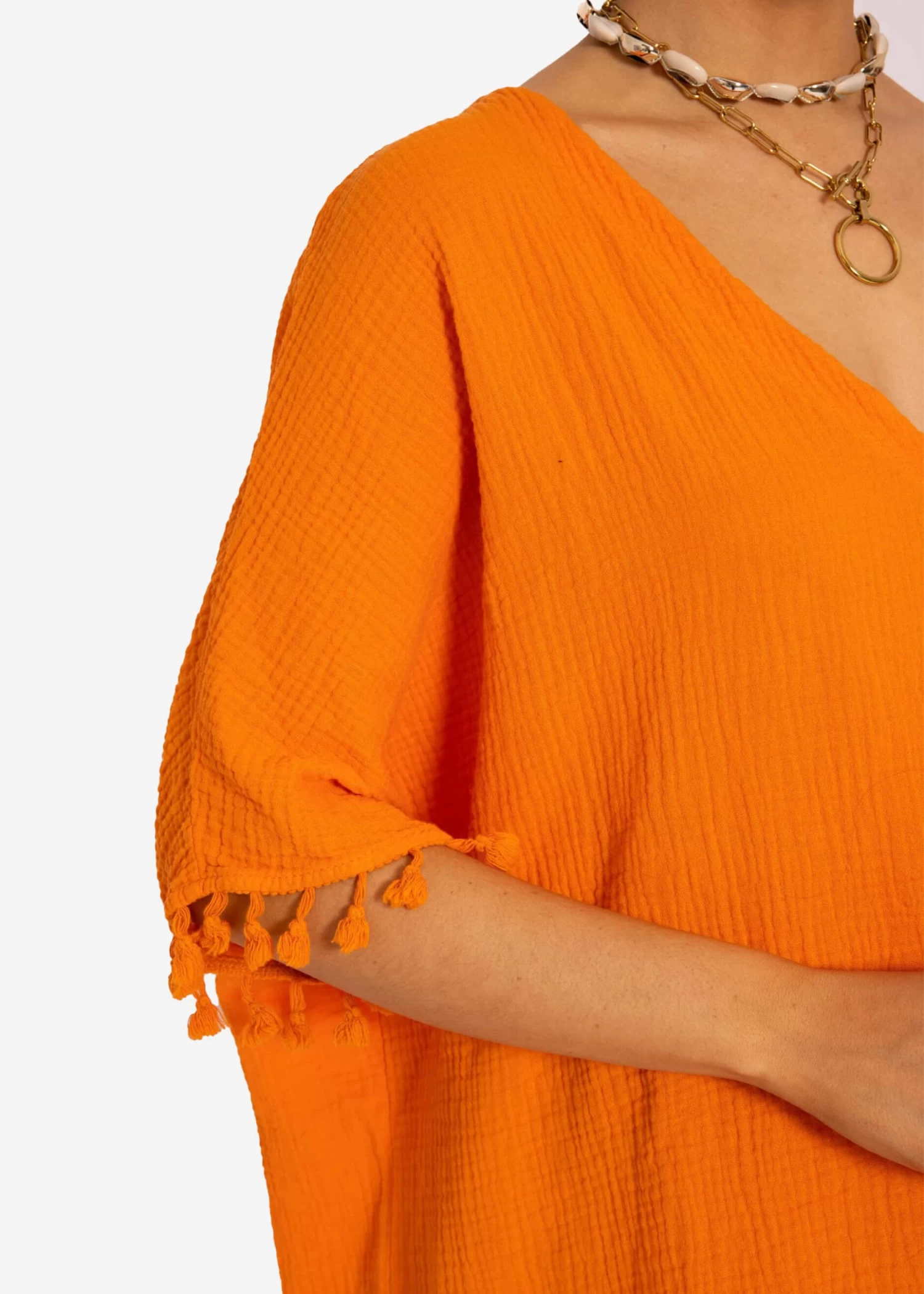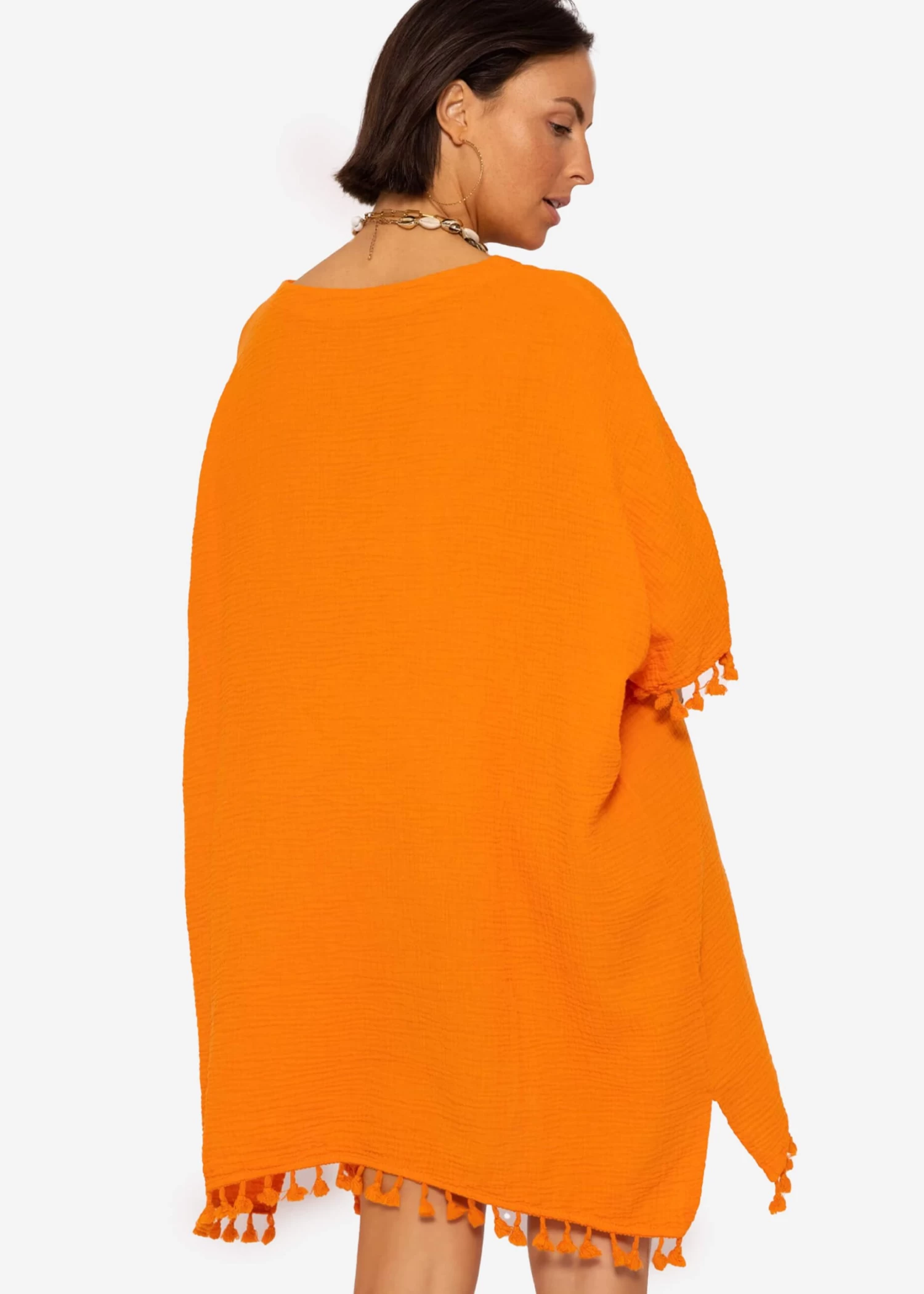 Lässig fallendes Tunikahemd aus softem Baumwoll-Musselin. Der Oversized-Schnitt und der tiefe V-Ausschnitt versprühen eine Lässigkeit. Die angeschnittenen, kurzen Ärmel sowie der Saum sind mit Tassels verziert. Seitlich befinden sich Schlitze und hinten fällt das Tunikahemd länger. Das Sommerteil eignet sich optimal für den Strand oder über Shorts. Empfohlen bis Größe 48