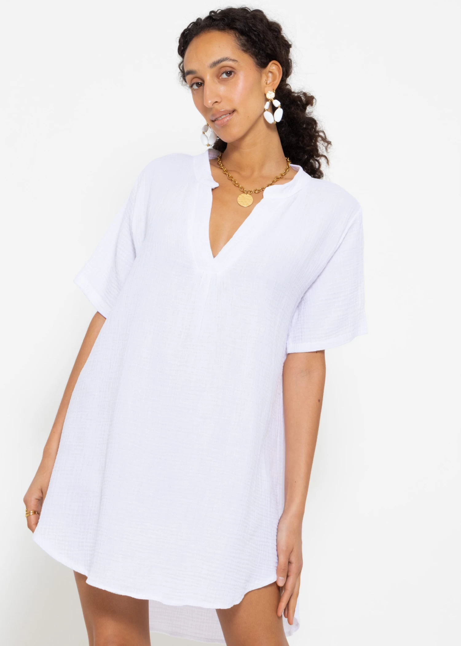 Diese leichte Musselin Tunika ist die ideale Wahl für einen lässigen, aber eleganten Look. Die lockere, luftige Passform sorgt für eine legere Silhouette, während der V-Ausschnitt dem Design eine feminine Note verleiht. Die halblangen Ärmel und der leicht abgerundete Saum unterstreichen den lässigen Charme der Tunika. Hergestellt aus hochwertigem Musselin-Gewebe, bietet das Modell ein angenehmes, weiches Tragegefühl und wird zum absoluten Trendteil. Eine verlängerte Rückenpartie sorgt dafür, dass du dich wohlfühlst und rundet das Design gekonnt ab.
