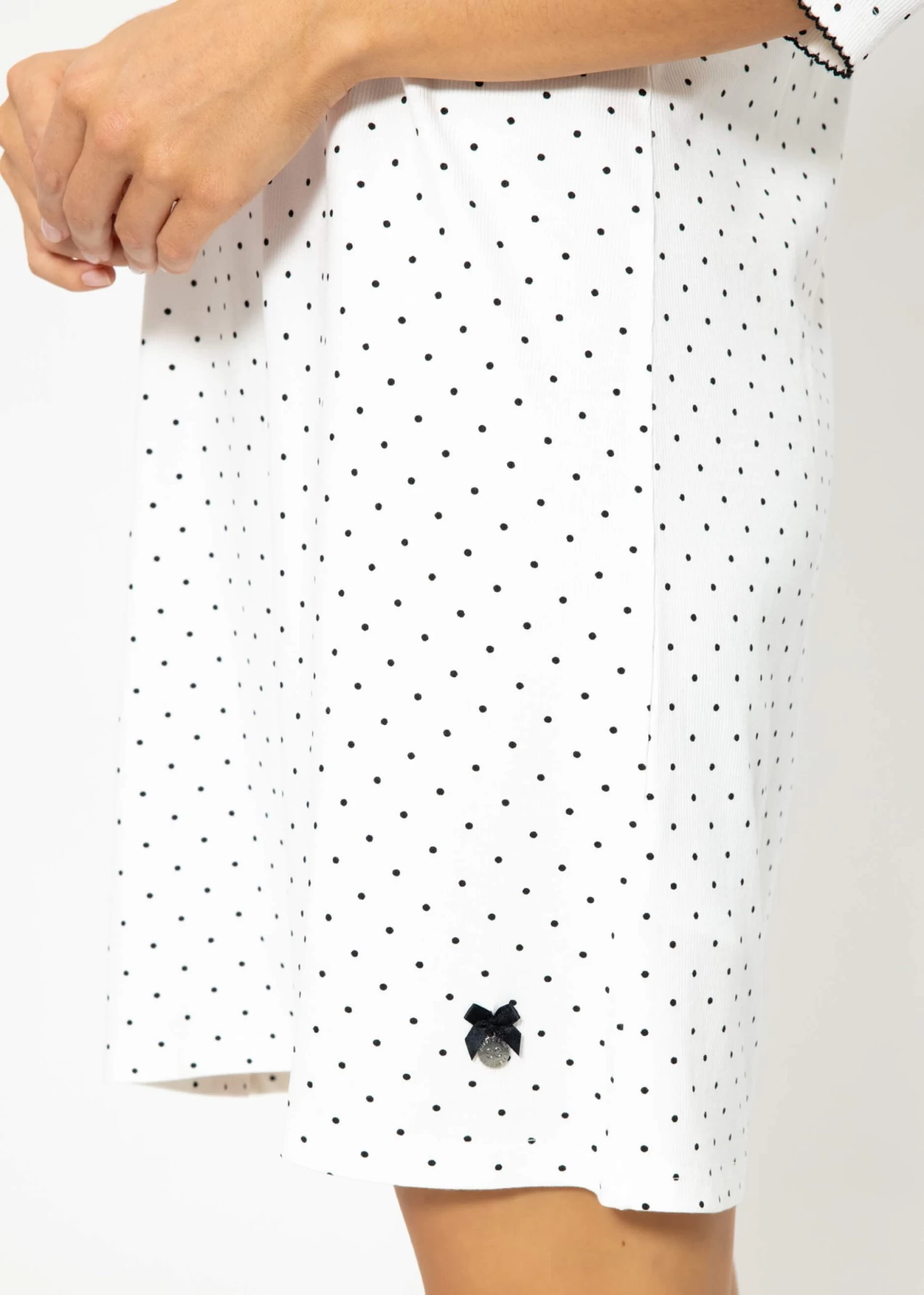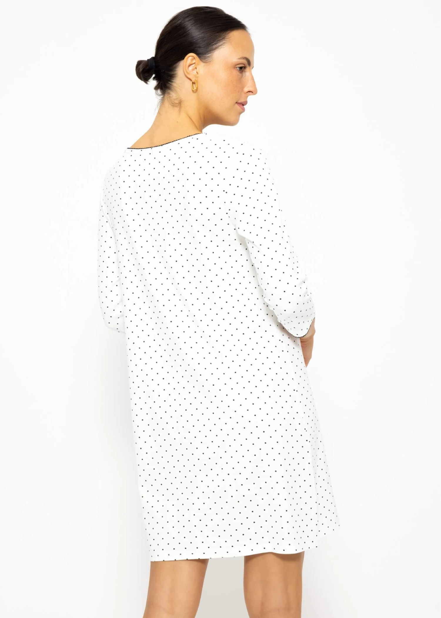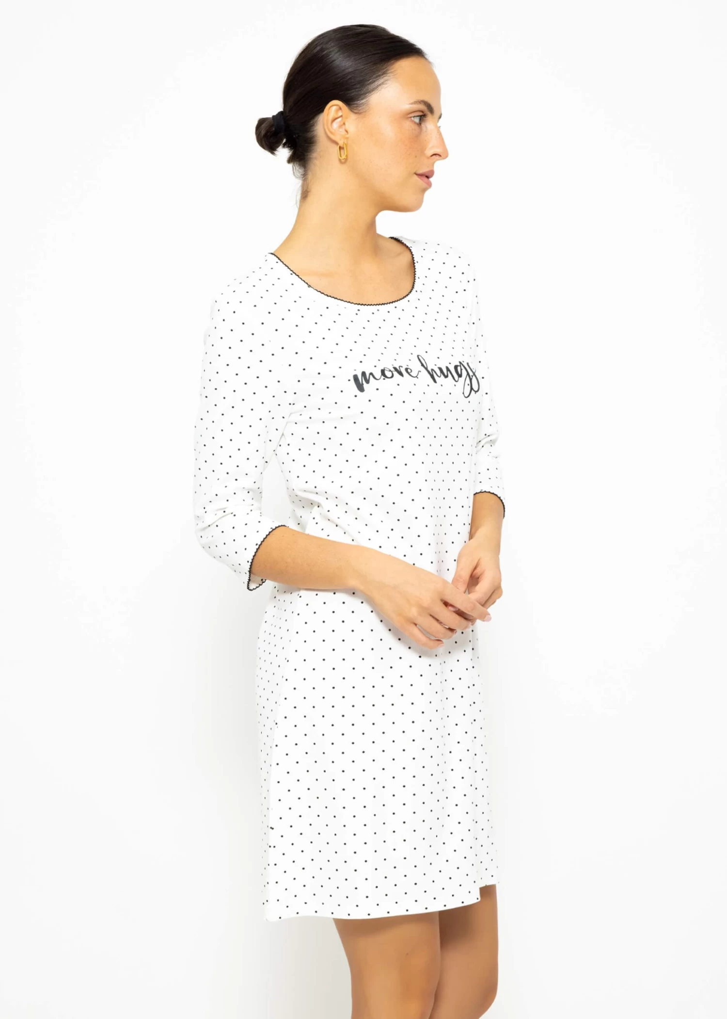 Dieses lange Pyjamashirt wurde sorgfältig entworfen, um dir eine angenehme Nachtruhe zu bieten, ohne dabei auf modischen Charme zu verzichten. Die 7/8 Armlänge des Nachthemds bietet die perfekte Balance zwischen Wärme und Atmungsaktivität, während der Rundhalsausschnitt einen femininen Touch verleiht. Die Kombination aus den Pünktchen und dem verspielten Schriftzug schafft ein einzigartiges Design, während die gebrandete SASSYCLASSY Schleife am Saum für Qualität spricht.