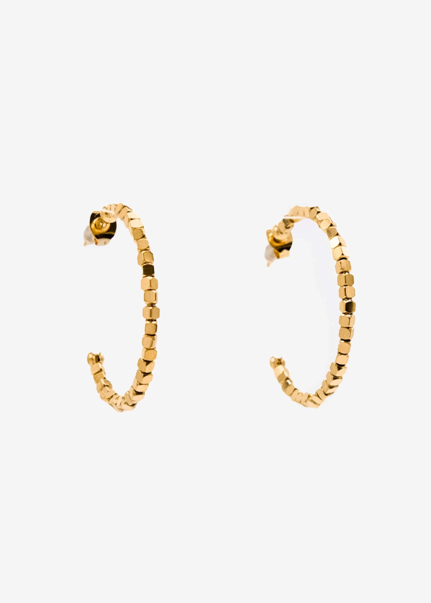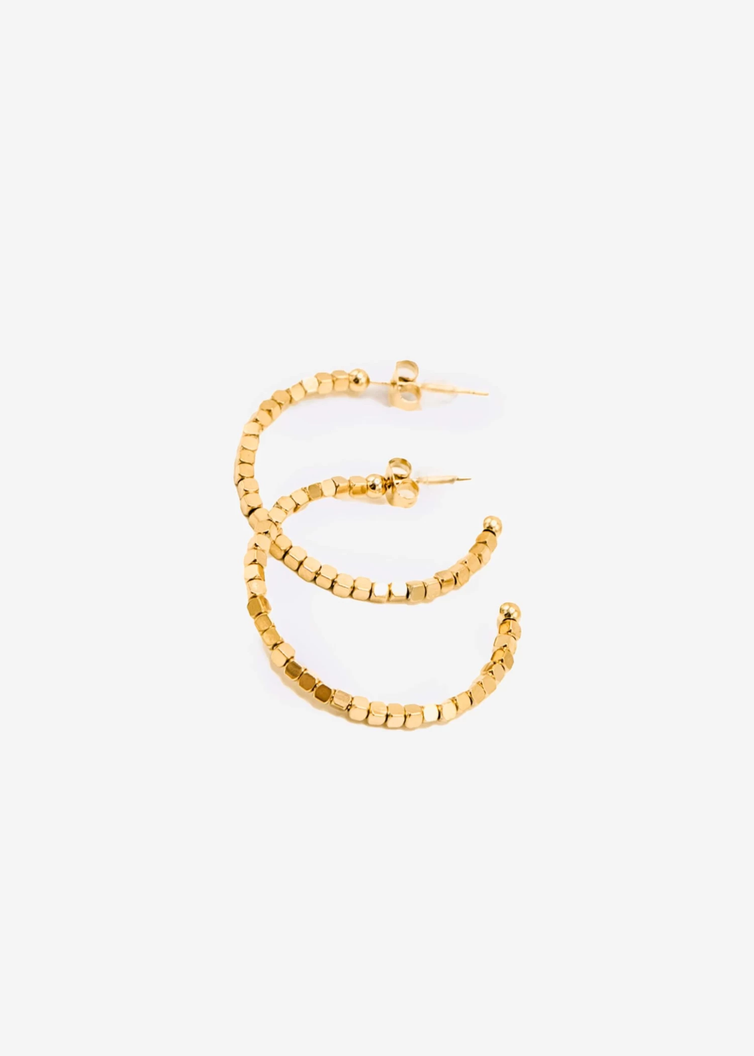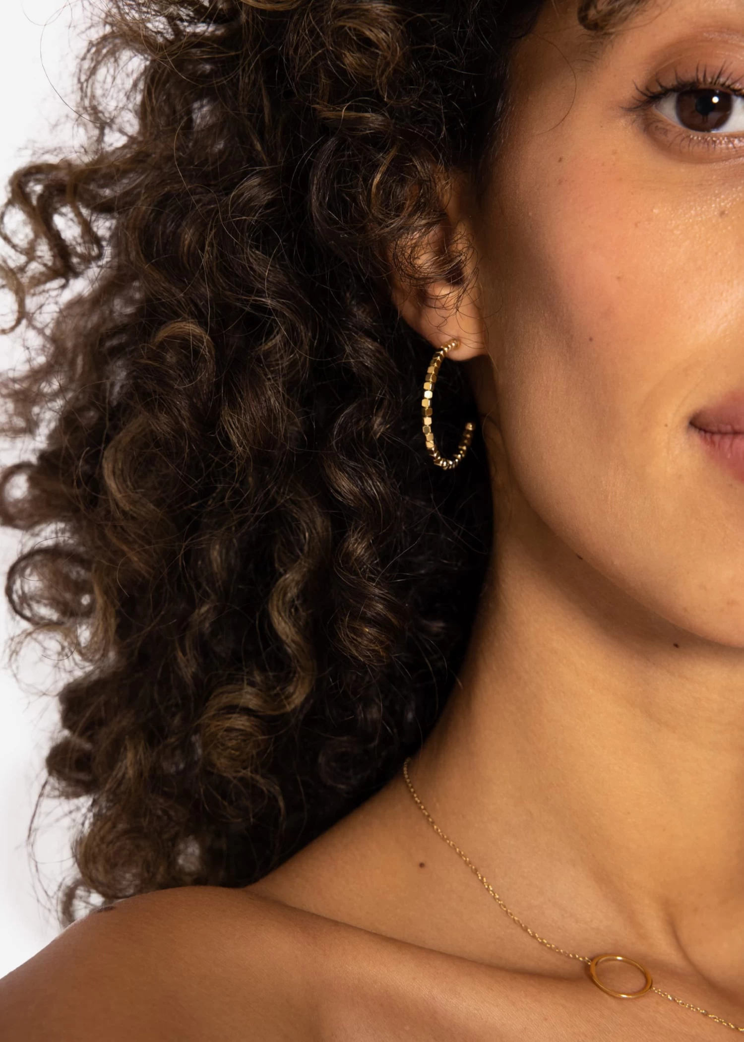 Goldfarbene, offene Creolen. Dieses Modell besticht durch sein zartes Design. Die feinen, aneinandergereihten, eckigen Perlchen und die Cut-Out-Optik verleihen diesen Ohrringen liebevolle Details. Sie beweisen sich als vielseitiger Begleiter und lassen sich zu lässigen Freizeitlooks, eleganten Business-Outfits als auch zu abendlichen Anlässen kombinieren. Sie sind mit einem klassischen Steckverschluss versehen.