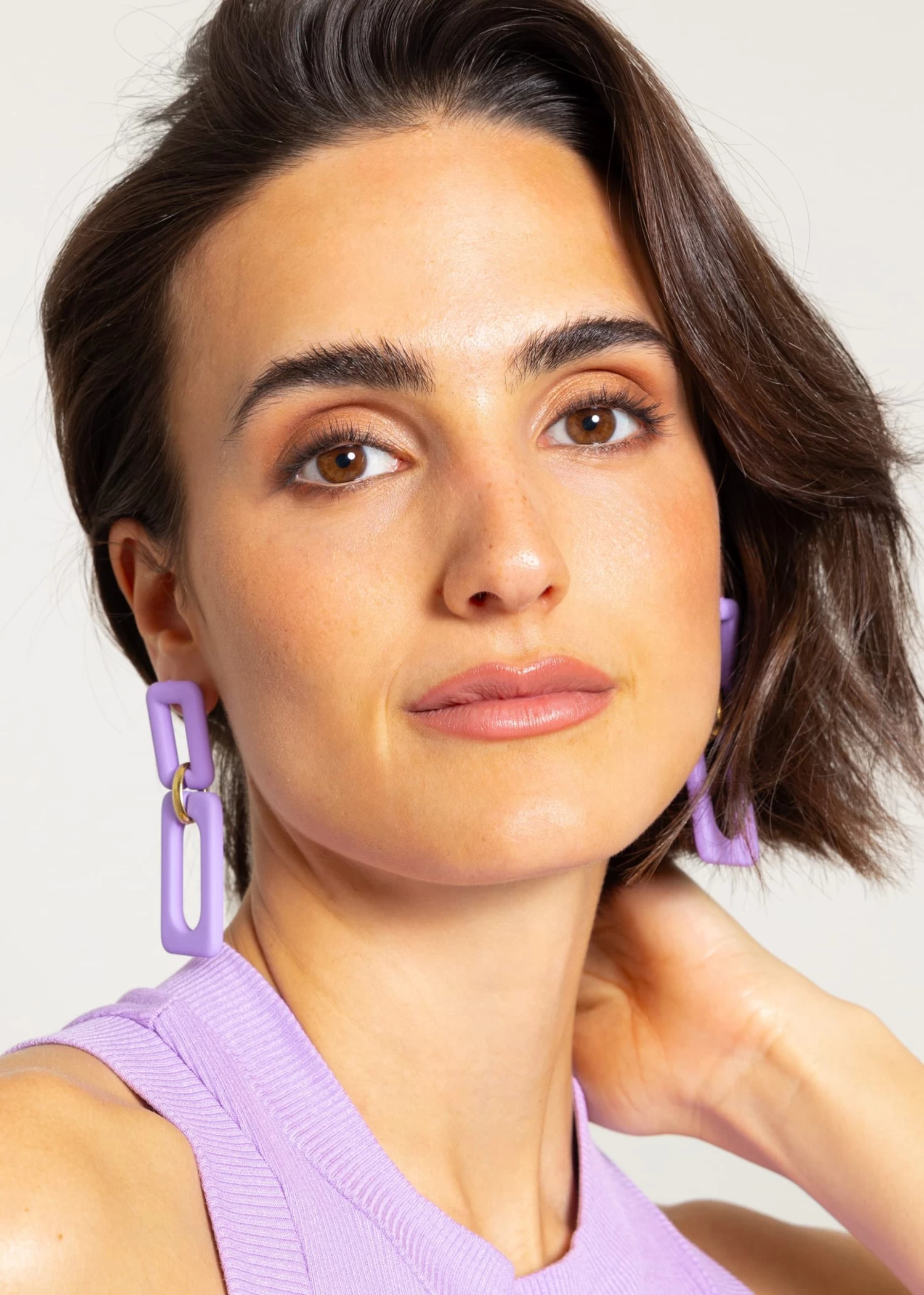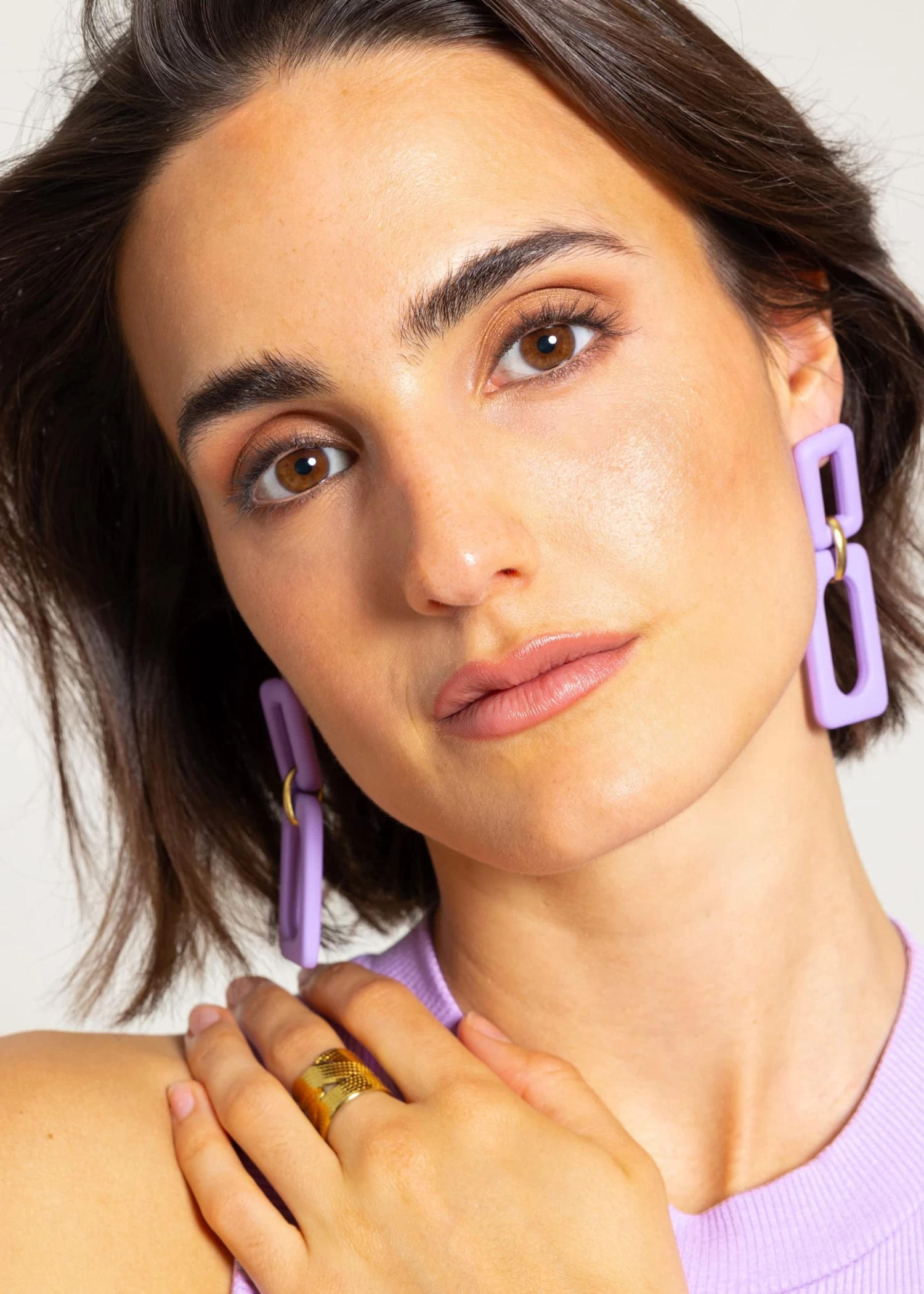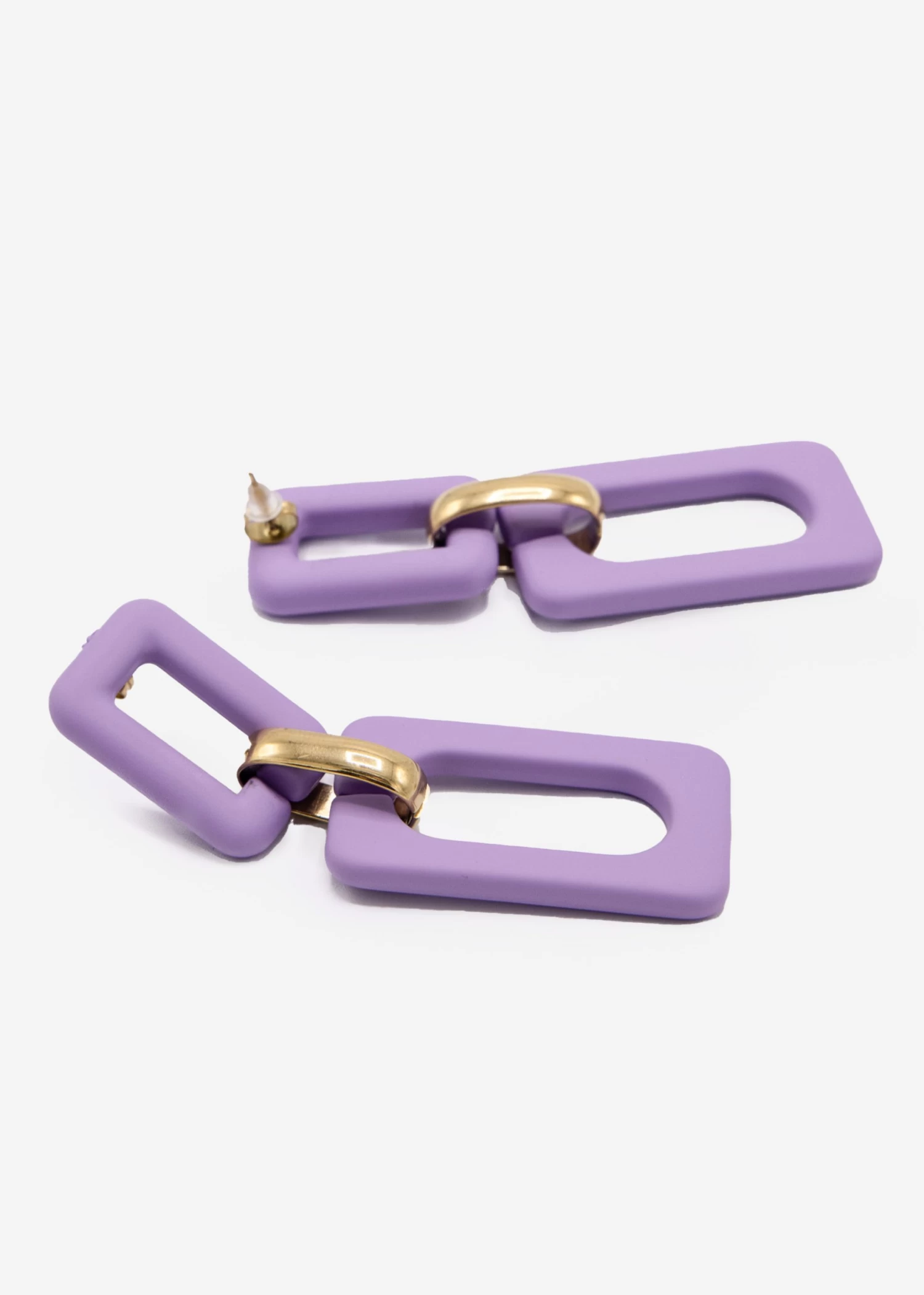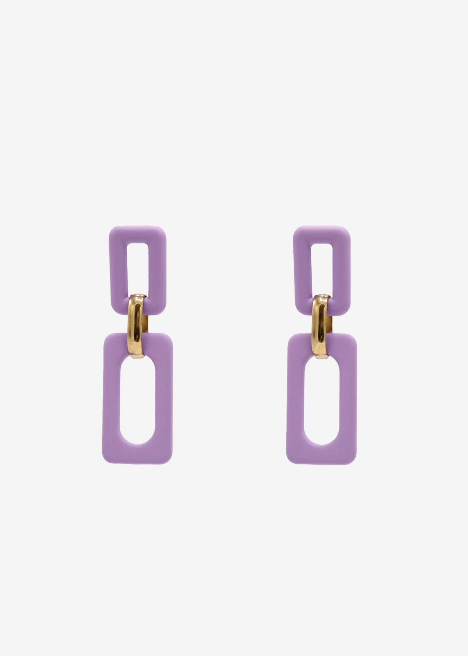 Geometrische Ohrstecker in Flieder. Sie bestehen aus zwei abgerundeten, rechteckigen Gliedern, die in der Mitte von einem goldfarbenen Element zusammengehalten werden. Diese Ohrstecker sind ein auffällig bunter Hingucker und geben deinem Outfit den letzten Schliff. Ob zu lässigen Freizeitlooks, eleganten Business-Outfits als auch zu abendlichen Anlässen, sie beweisen sich als vielseitiger Begleiter. Die Ohrringe sind mit einem klassischen Steckverschluss versehen.