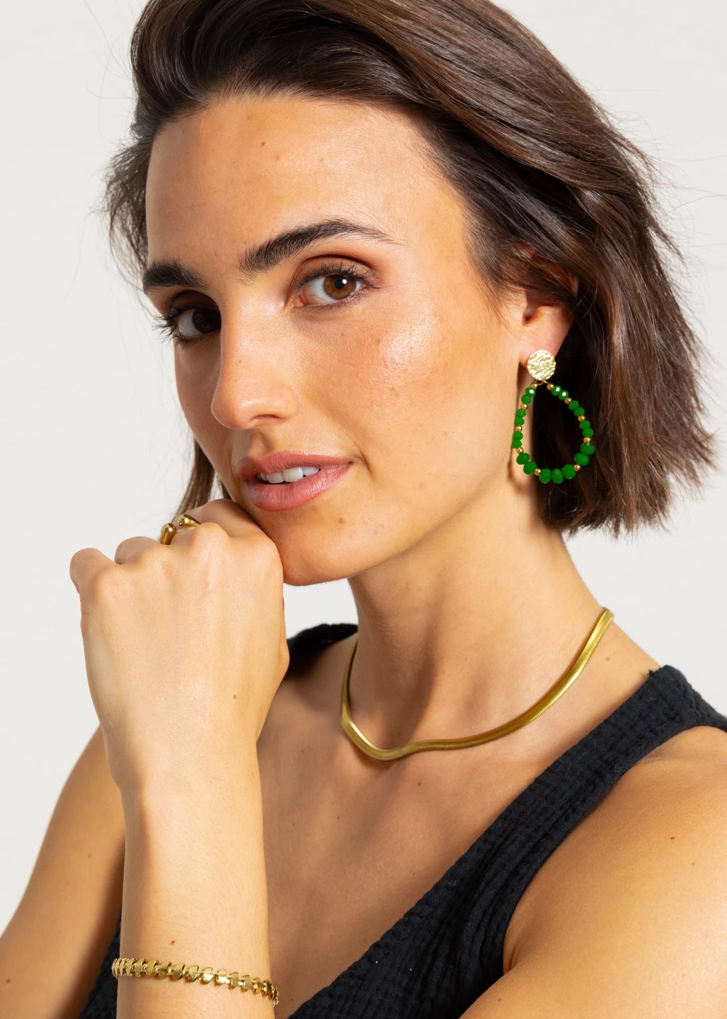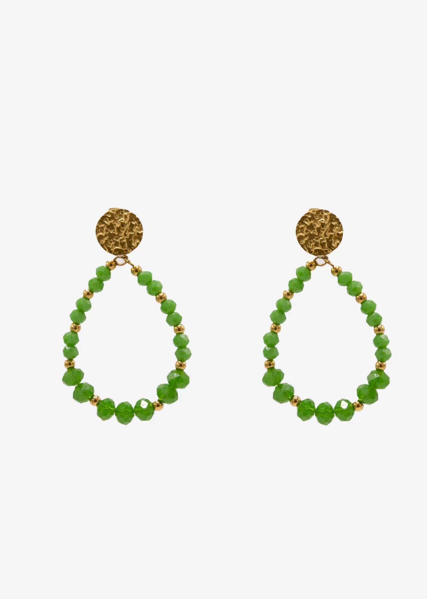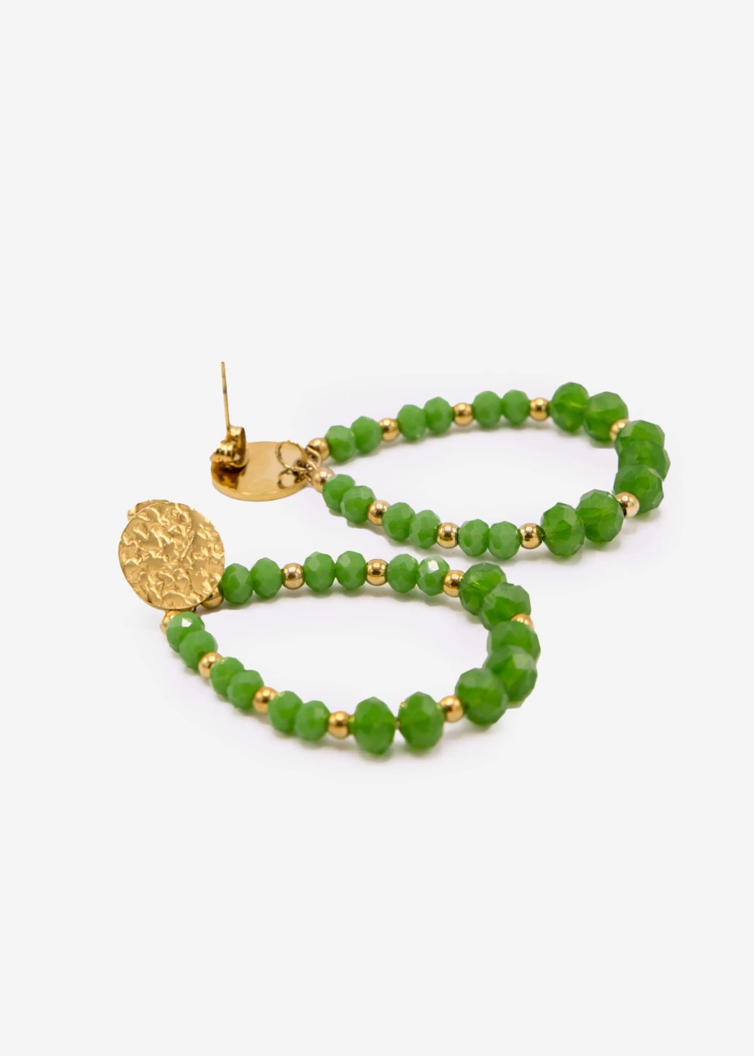 Ohrstecker in Edelstahl mit grünen und goldfarbenen Perlchen als Eyecatcher. Sie haben einen Steckverschluss.