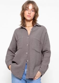 Oversize Musselin Bluse mit Brusttaschen in Taupe