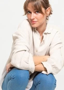 Diese Bluse verbindet schlichte Eleganz mit einem Hauch von Glanz und ist aus hochwertigem Musselin gefertigt, der sich leicht und luftig anfühlt. Die zarten Glitzer-Details, die über den gesamten Stoff verteilt sind, verleihen der Bluse ein modernes Update und machen sie perfekt für einen Tag im Büro oder einen Abend in der Stadt. Der Oversize Schnitt garantiert Komfort und eine fließende Silhouette, während klassische Elemente wie der Kragen und die Knopfleiste das Design zeitlos machen. Die langen Ärmel enden in fein abgestimmten Manschetten, die der Bluse Eleganz verleihen.