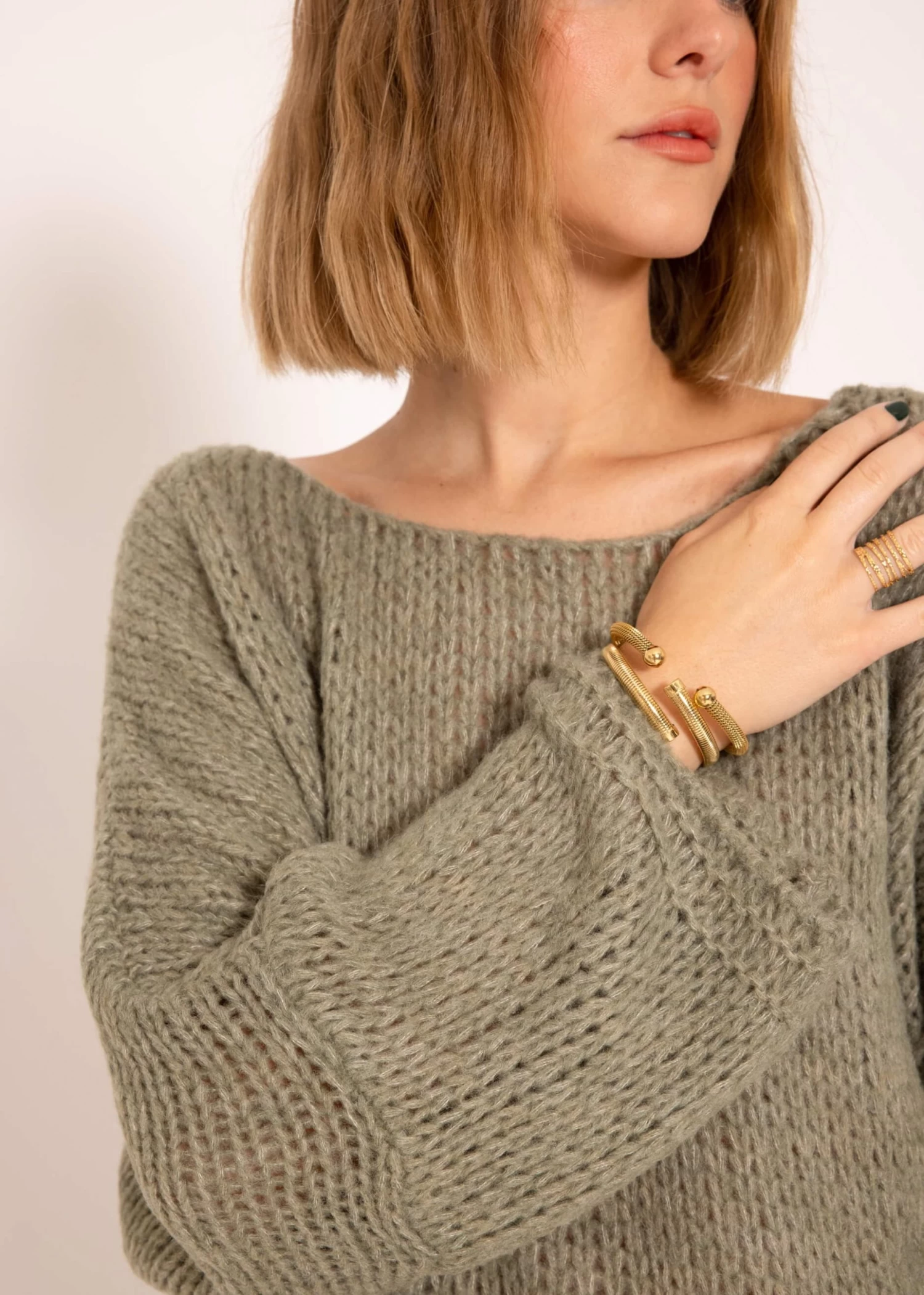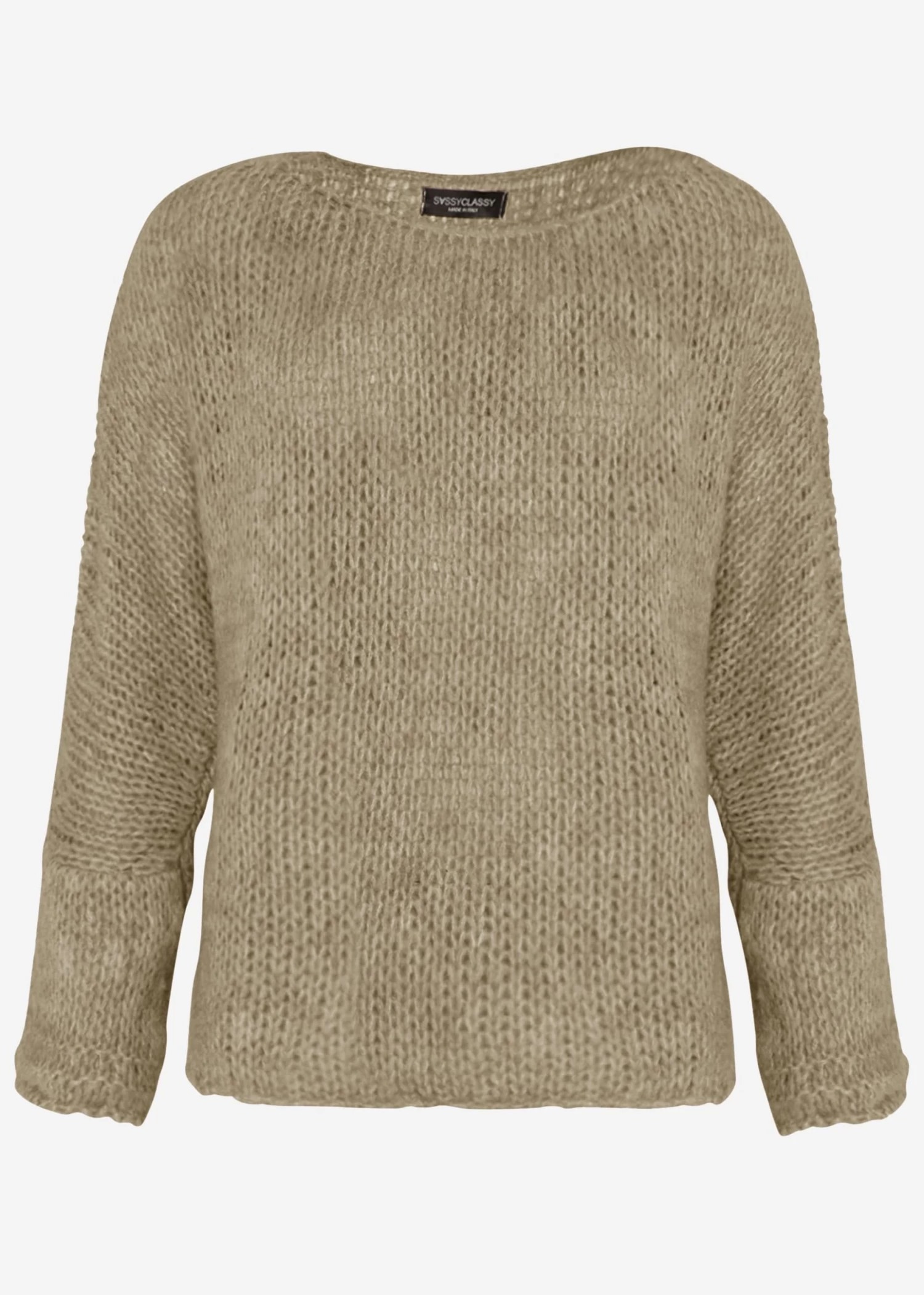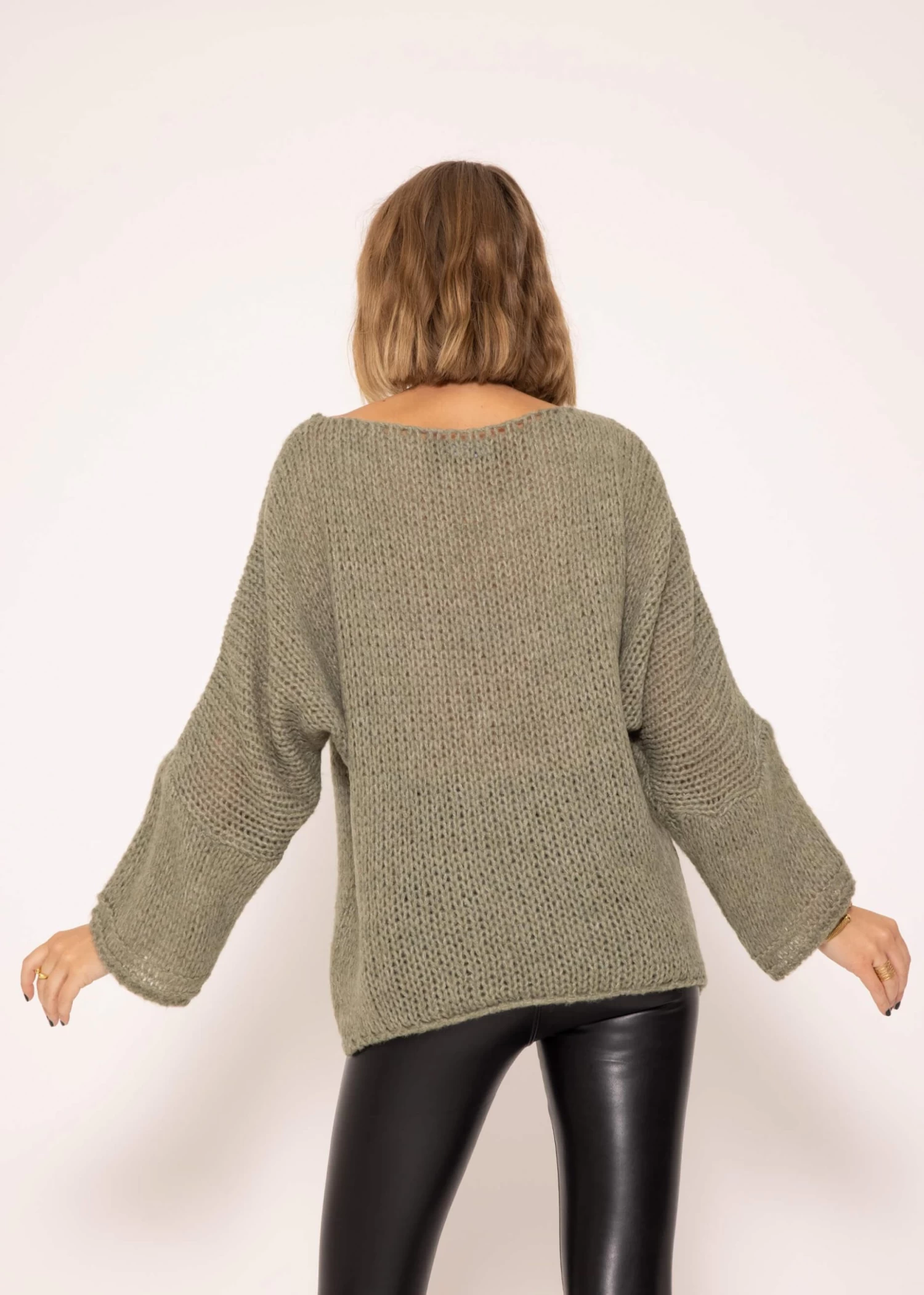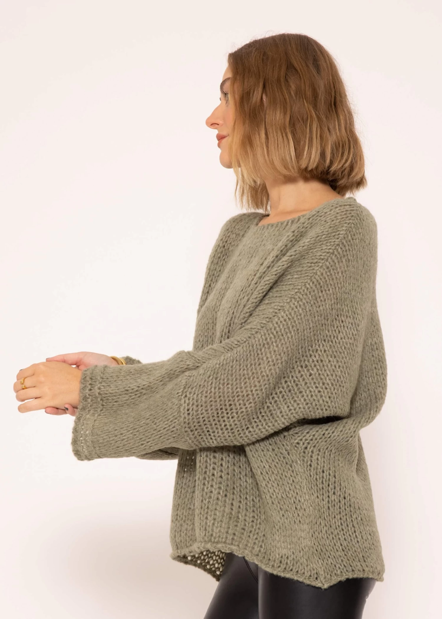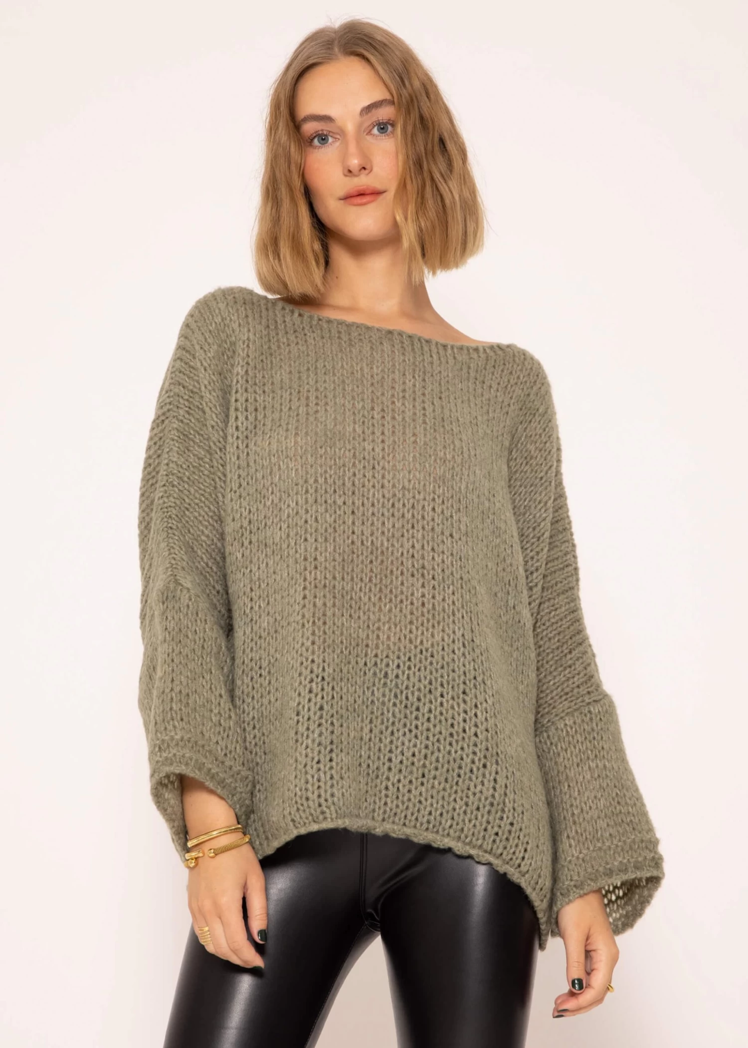 Oversize Pullover aus weichem Strick. Der Pullover hat einen weiten Rundhals und angestrickte 3/4 lange Ärmel. Der Ärmelabschluss ist mit einer quergestrickten Blende betont. Er ist in weiteren Farbvarianten online.