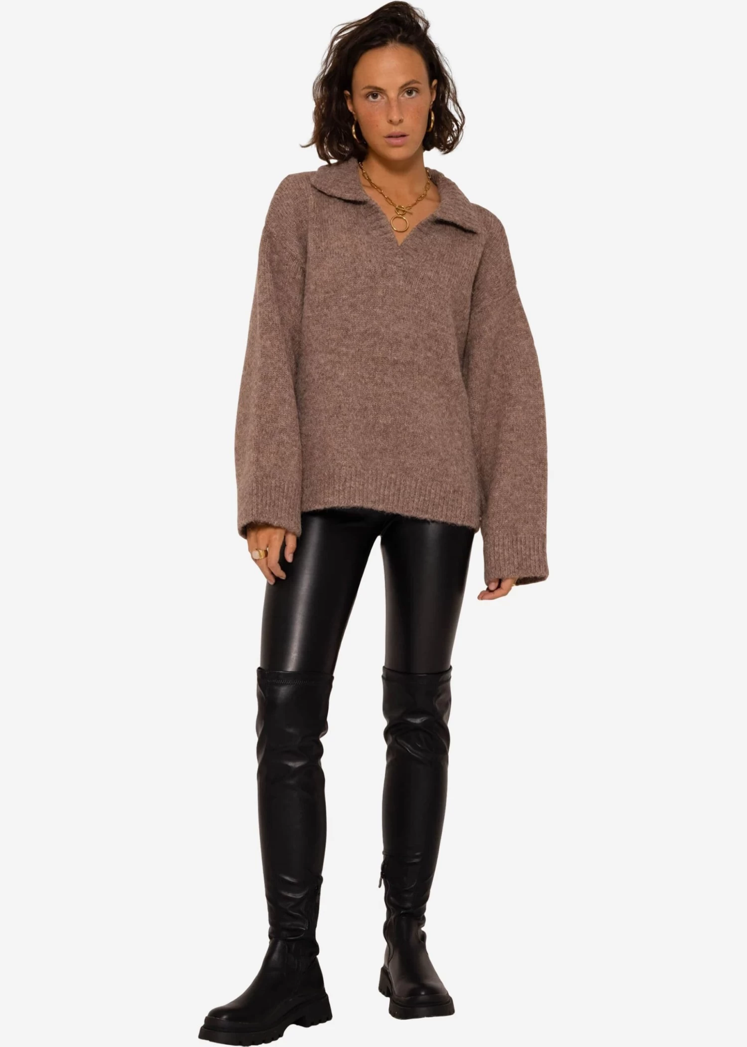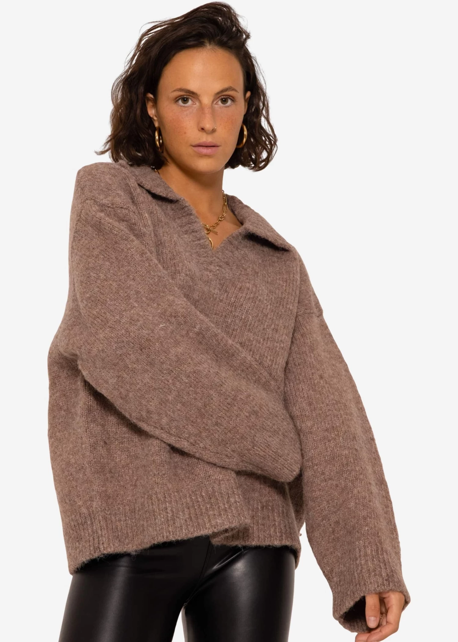 Dieser Pullover verkörpert die zeitlose Schönheit, die durch modernen Stil ergänzt wird. Das Modell besitzt eine Oversized-Passform, überschnittene Schultern sowie weite Ärmel, die für Lässigkeit sorgen. Kragen und V-Ausschnitt verleihen dem Pullover einen angesagten Touch, während gerippte Abschlüsse das Design gekonnt komplementieren. Dieser vielseitige Strickpullover harmoniert perfekt mit einer schönen Jeans oder Leggings für den perfekten Alltagslook.
