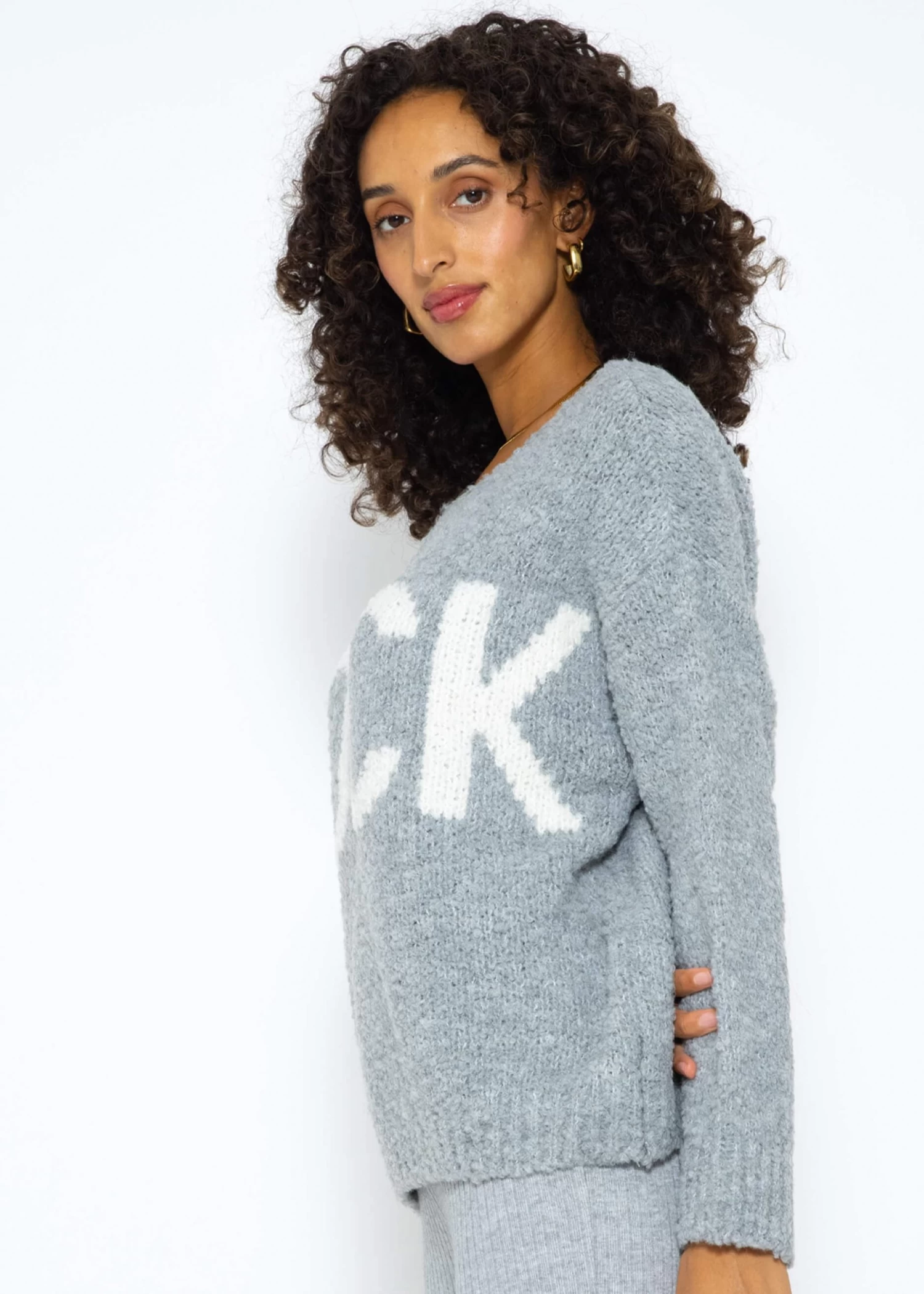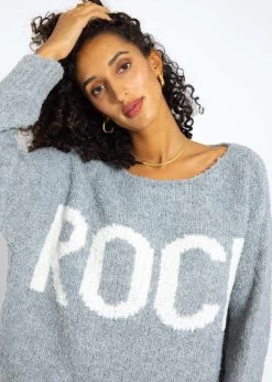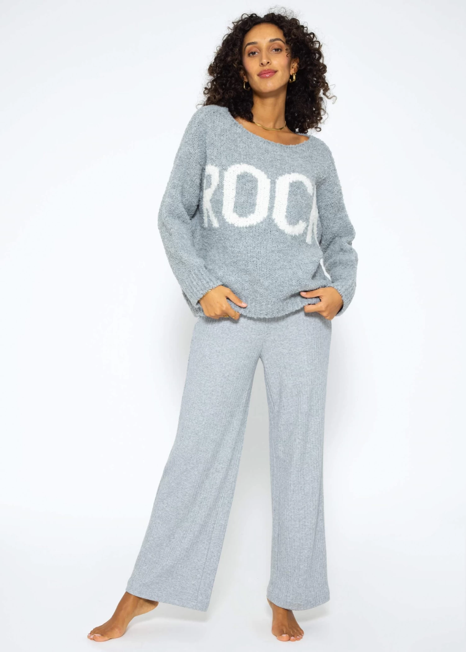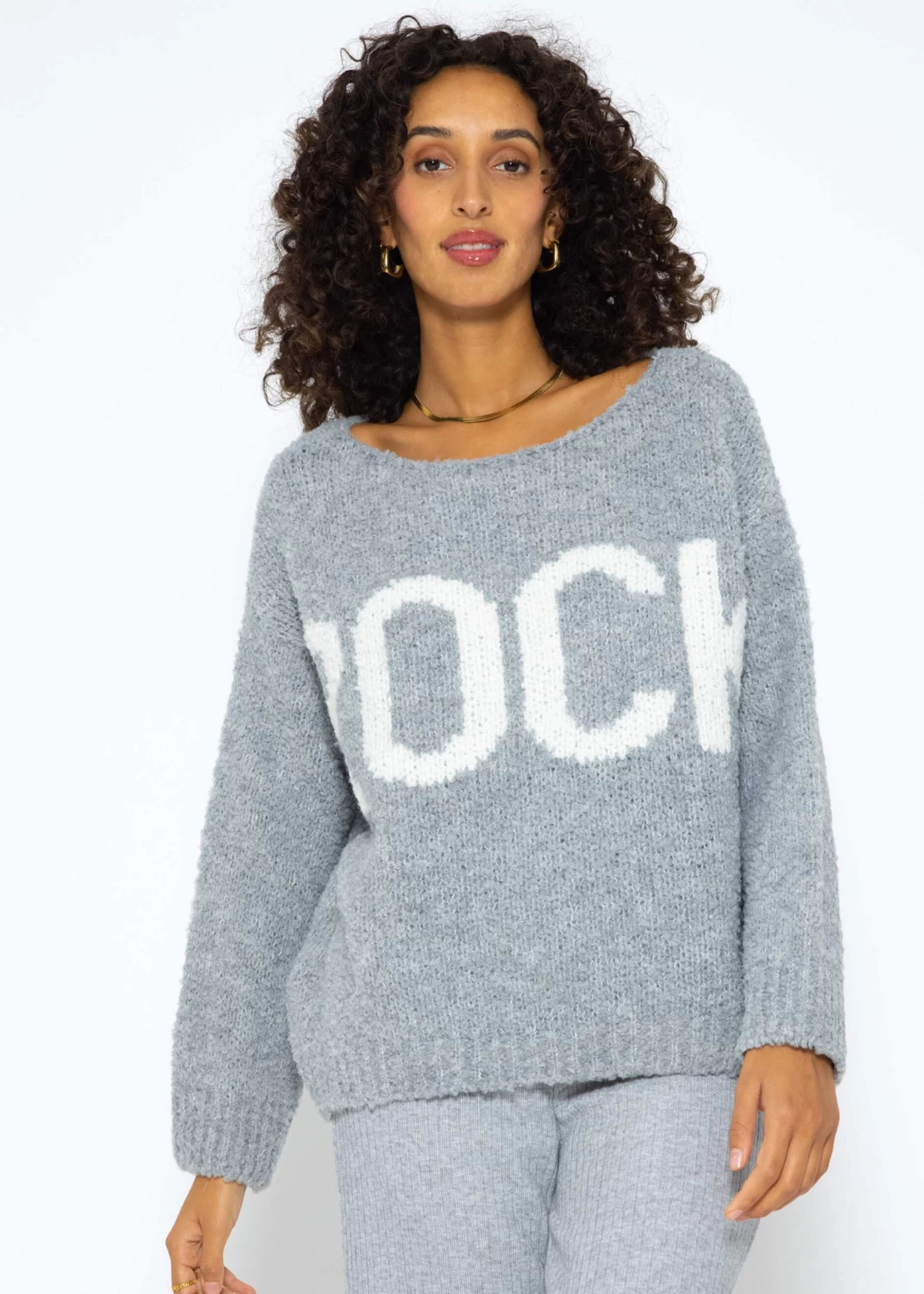 Oversize Pullover mit „Rock“-Schriftzug in grau-weiß