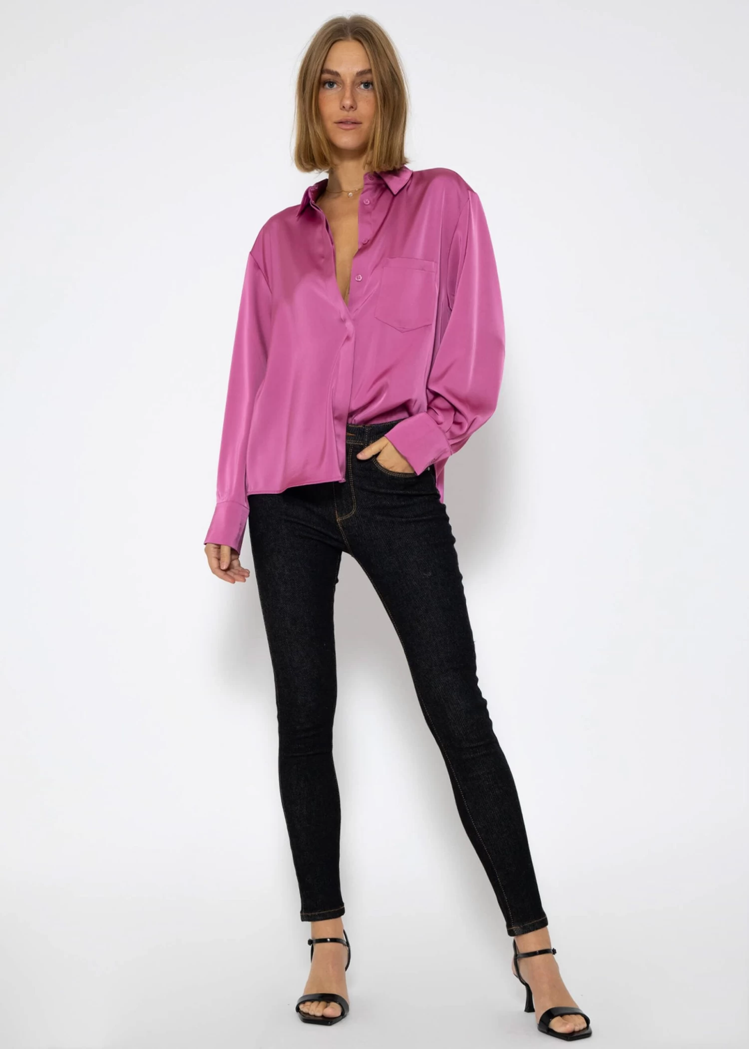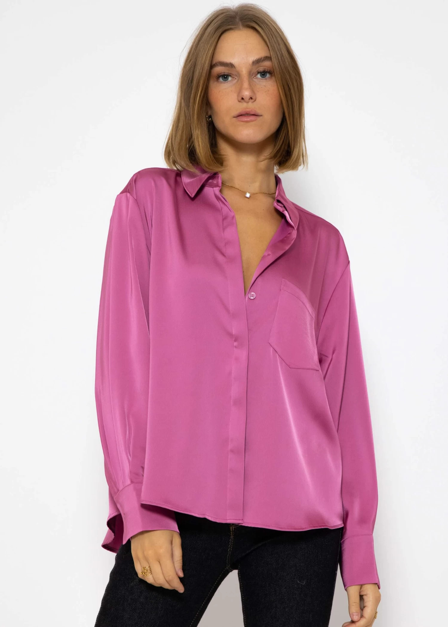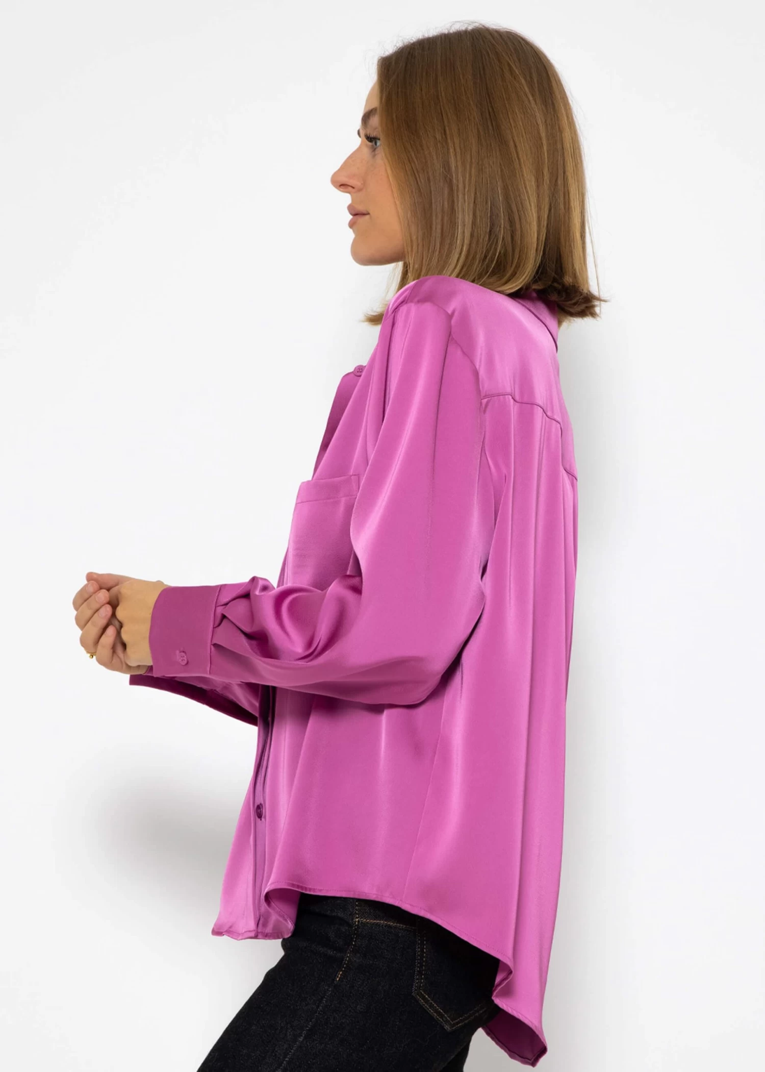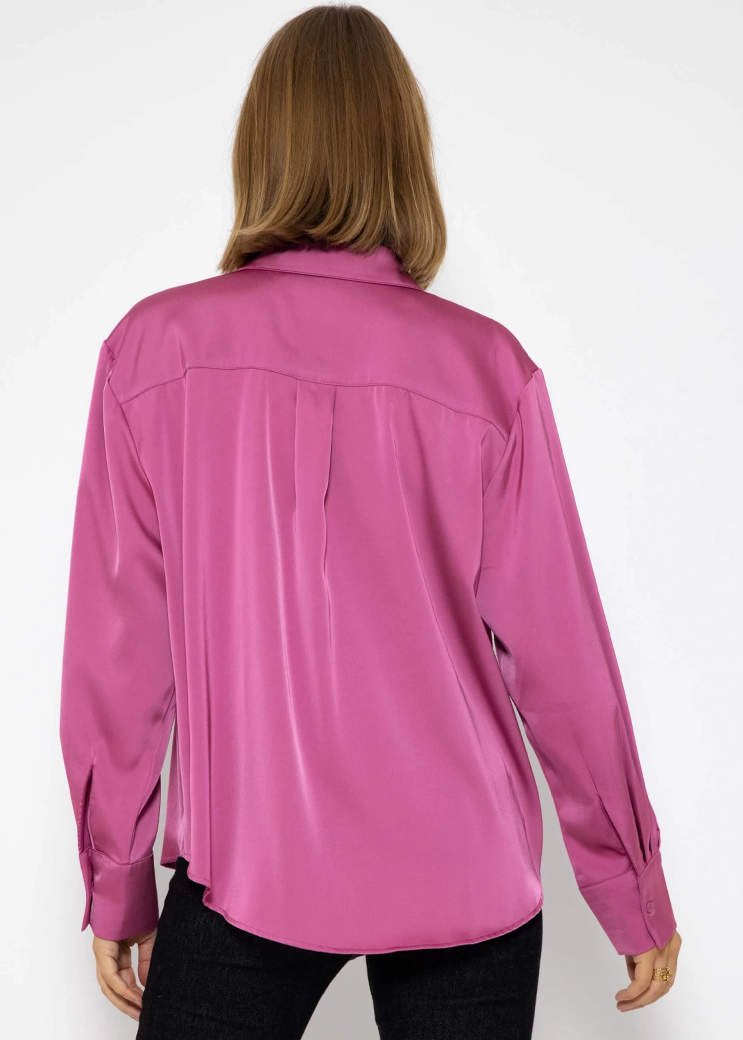 Mit ihrer einzigartigen Kombination aus schimmerndem Design und klassischen Details ist diese Oversize Bluse perfekt für besondere Anlässe oder um deinem Alltagslook eine luxuriöse Note zu verleihen. Das Modell zeichnet sich durch eine verdeckte Knopfleiste, Kragen sowie Manschetten an den langen Ärmeln aus. An den Manschetten sind zwei Knöpfe angebracht, wodurch sich die Passform regulieren lässt. Auf der linken Seite befindet sich eine Brusttasche, die für einen Hauch von Lässigkeit sorgt. Die SASSYCLASSY Knöpfe, die diese Bluse zieren, sind ein Markenzeichen von Stilbewusstsein. Die verlängerte Rückenpartie und die querlaufende Naht und Falte am Rücken runden das Design gekonnt ab.