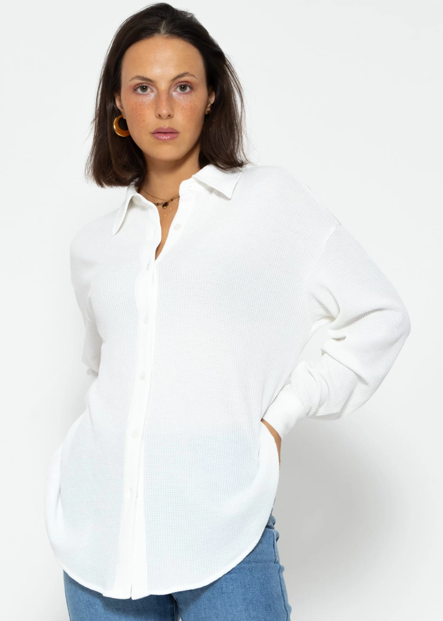 Diese Bluse ist der Inbegriff von lässiger Schönheit und verleiht deinem Look das gewisse Extra. Das hochwertige Waffelpiqué sorgt für eine ansprechende Struktur und bietet gleichzeitig höchsten Tragekomfort. Der Oversize-Schnitt, die langen Ärmel sowie die überschnittenen Schultern sorgen für einen entspannten und angesagten Look. Knopfleiste, Manschetten an den langen Ärmeln sowie Kragen verleihen der Bluse klassische Details, während die querlaufende Naht am Rücken Raffinesse hinzufügt und die Silhouette der Bluse betont. Trage sie locker über Jeans für einen lässigen Look oder stecke sie in einen Rock für einen schickeren Auftritt am Abend.