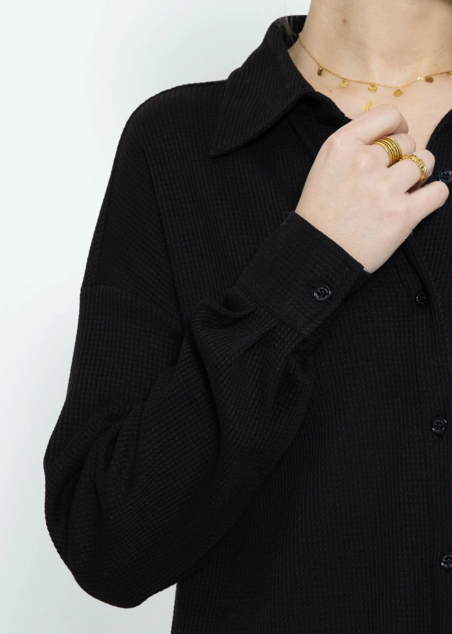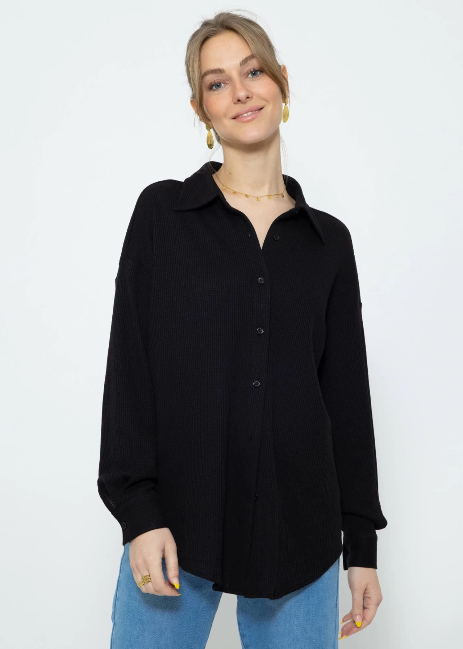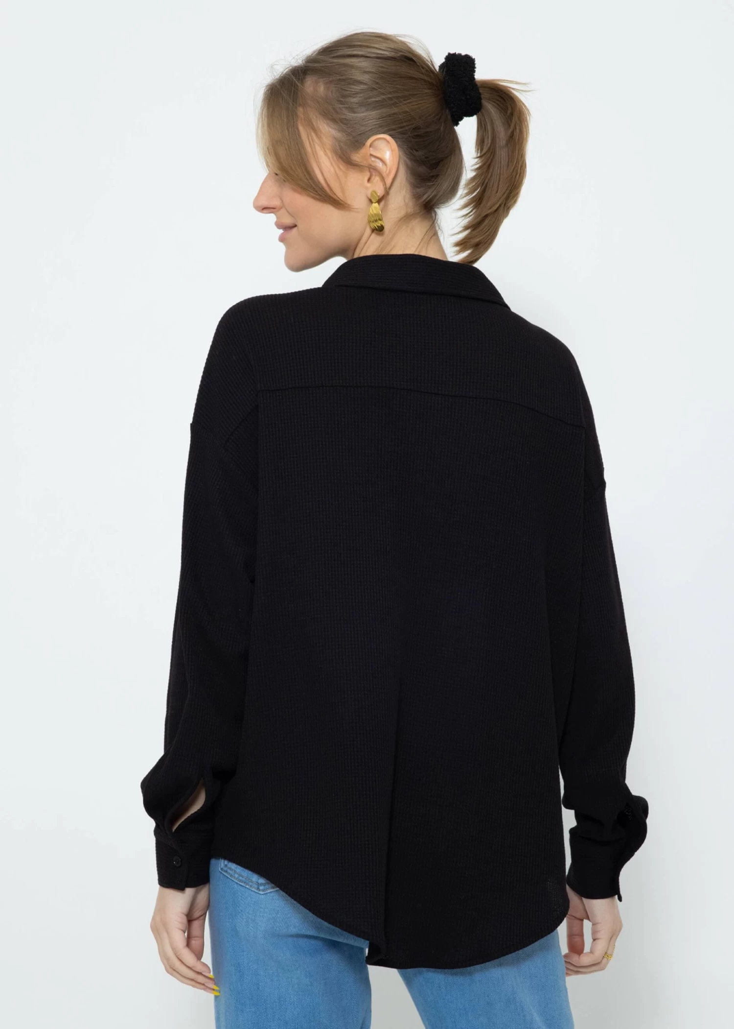Diese Bluse ist der Inbegriff von lässiger Schönheit und verleiht deinem Look das gewisse Extra. Das hochwertige Waffelpiqué sorgt für eine ansprechende Struktur und bietet gleichzeitig höchsten Tragekomfort. Der Oversize-Schnitt, die langen Ärmel sowie die überschnittenen Schultern sorgen für einen entspannten und angesagten Look. Knopfleiste, Manschetten an den langen Ärmeln sowie Kragen verleihen der Bluse klassische Details, während die querlaufende Naht am Rücken Raffinesse hinzufügt und die Silhouette der Bluse betont. Trage sie locker über Jeans für einen lässigen Look oder stecke sie in einen Rock für einen schickeren Auftritt am Abend.