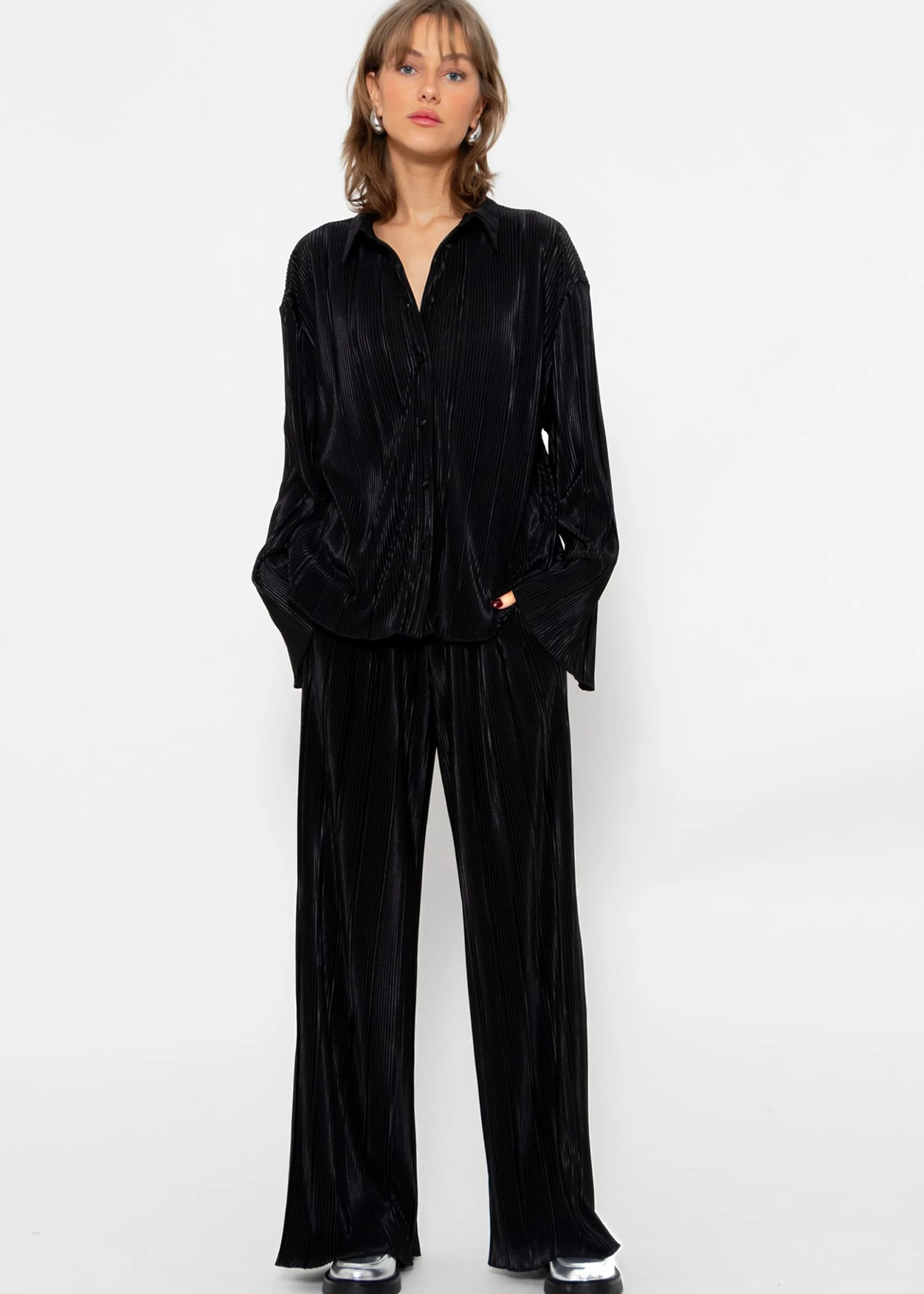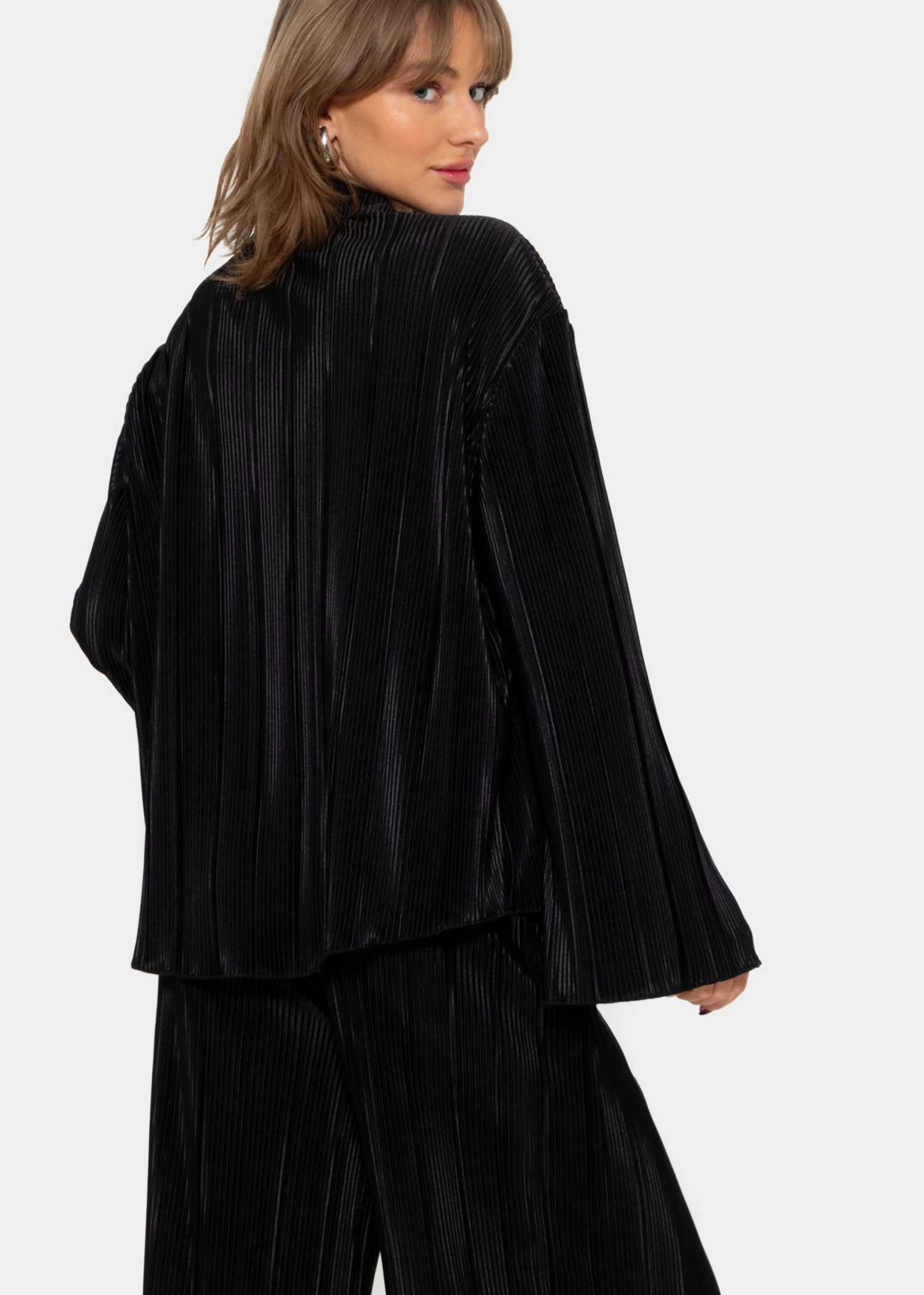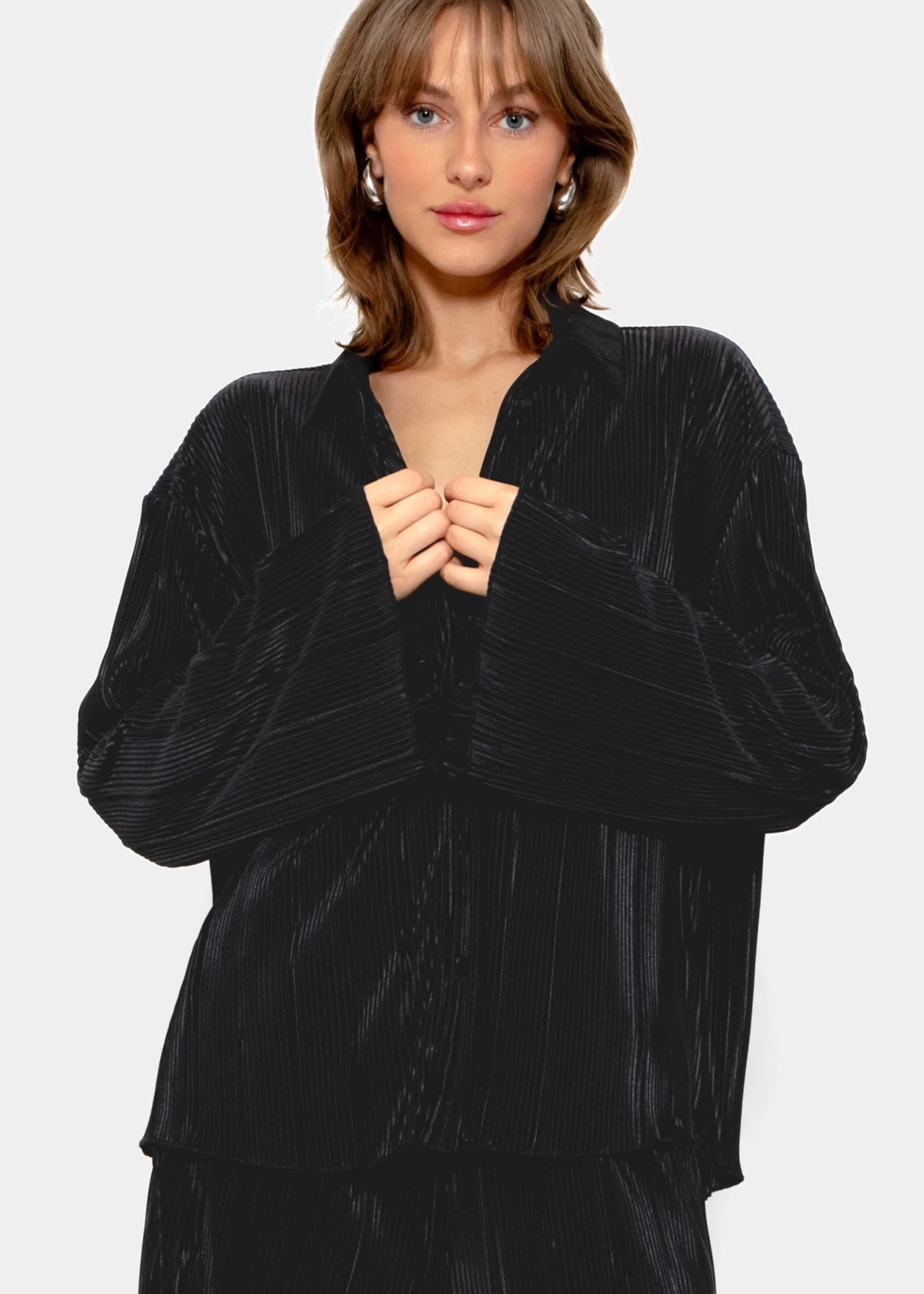 Diese Hemdbluse aus feinem Plissee verkörpert klassisches Design mit einem Hauch von zeitgenössischem Flair. Das Modell besitzt einen Kragen, eine Knopfleiste sowie eine lockere Passform, die für eine angesagte Silhouette sorgt. Die Bluse besticht durch ihre zarten Plisseefalten, die eine taktile und visuell ansprechende Textur schaffen. Die weiten Ärmel ergänzen das fließende und luftige Gefühl der Bluse und verleihen eine zusätzliche Dimension an Stil und Bewegung. Für einen Set-Look kannst du die zur Bluse passende Hose kombinieren.