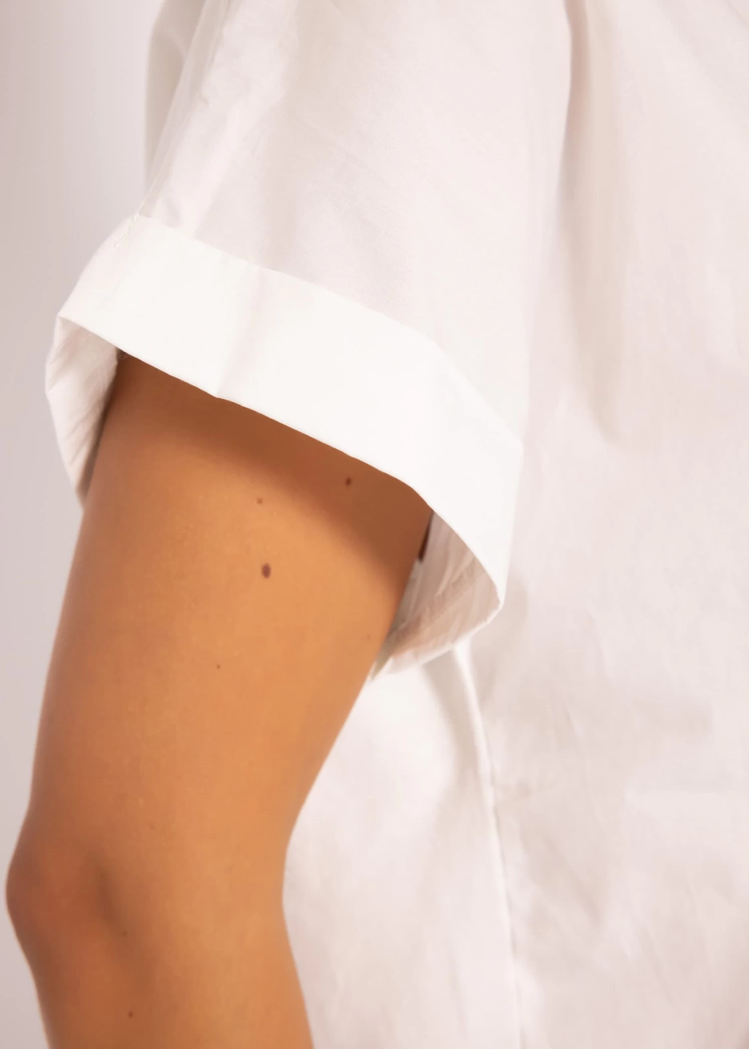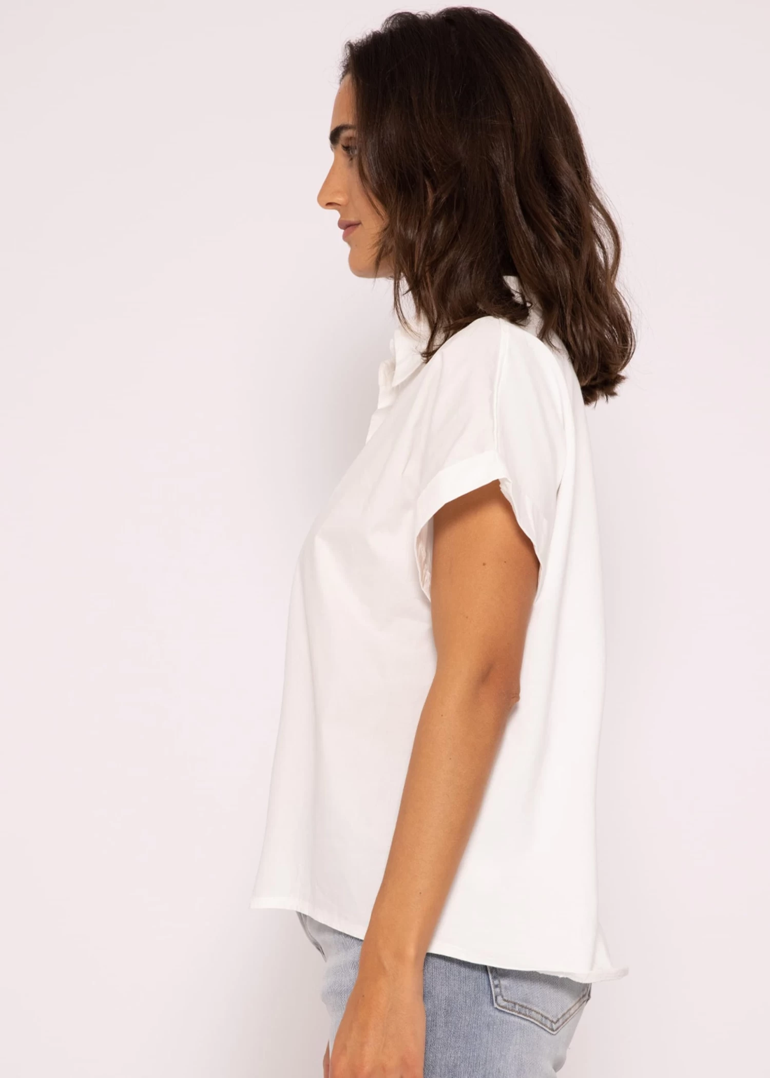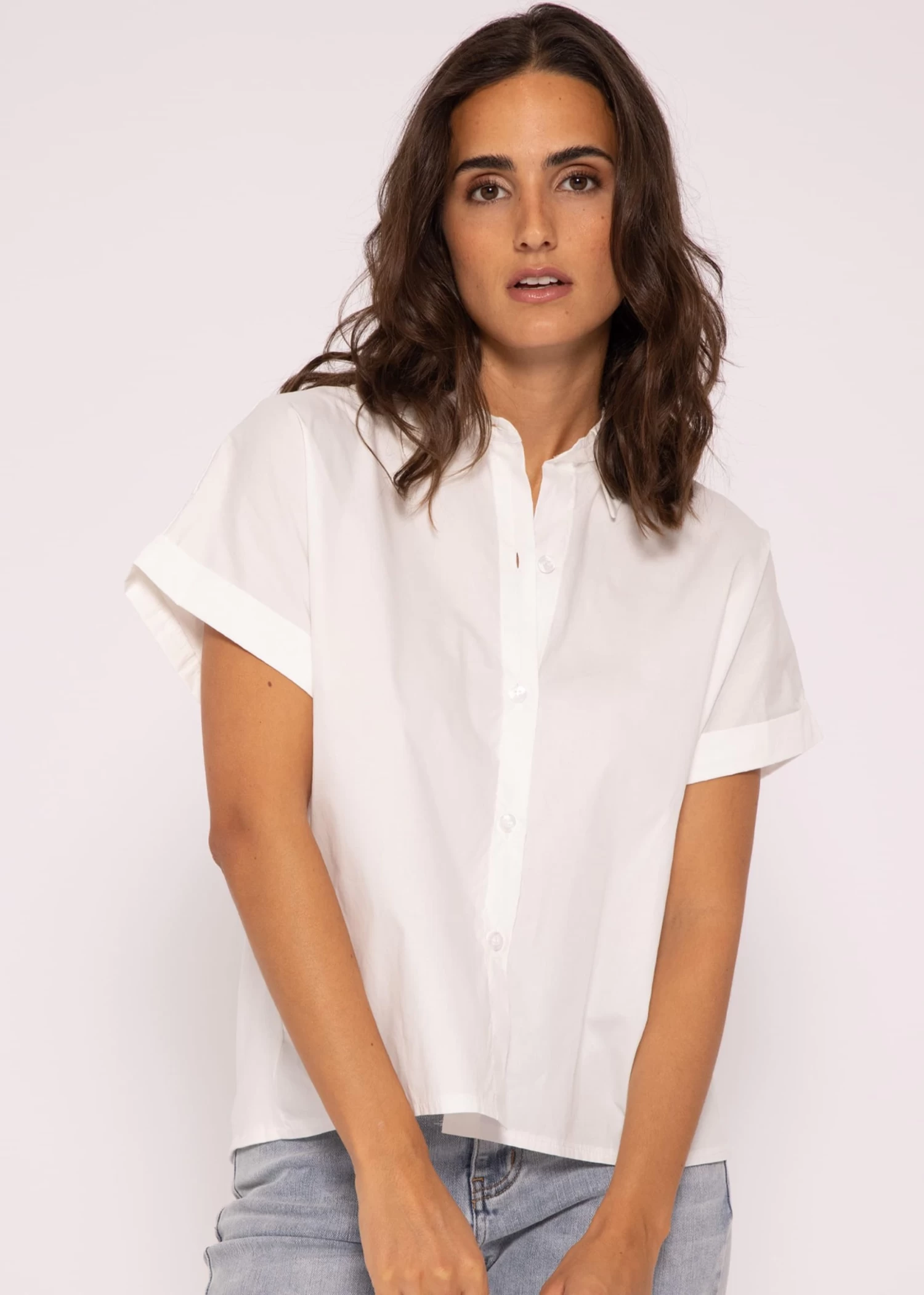 Popelin/Jersey Bluse in Offwhite. Dieses Modell besitzt einen klassischen Hemdblusenkragen, eine durchgehende Knopfleiste und angeschnittene, kurze Ärmel. Die Vorderseite der Bluse besteht aus Baumwoll-Popelin und verleiht dadurch einen eleganten Touch. Die Rückseite kommt in Baumwoll-Jersey und verleiht dadurch eine lässige Note. Das Design präsentiert sich in verkürzter Länge, lockerer Passform und fällt hinten etwas länger. Hervorzuheben sind die liebevoll gebrandeten Knöpfe mit SASSYCLASSY Logo. Trage diese Bluse mit einer Jeans und Sneakers für einen cleanen Look.