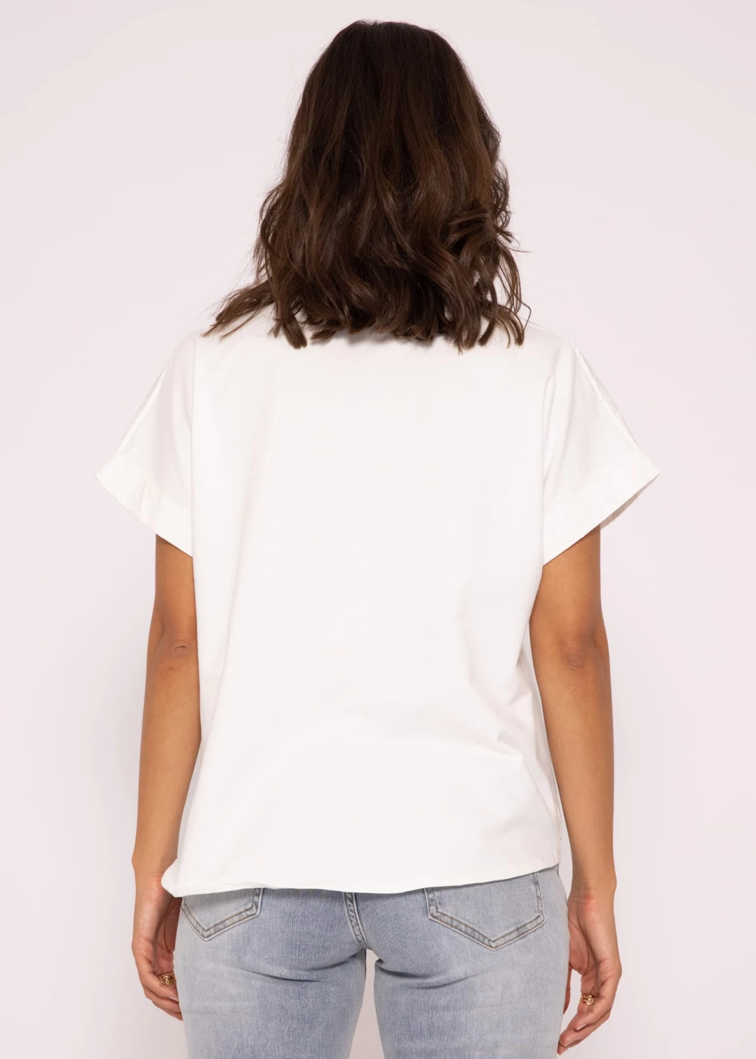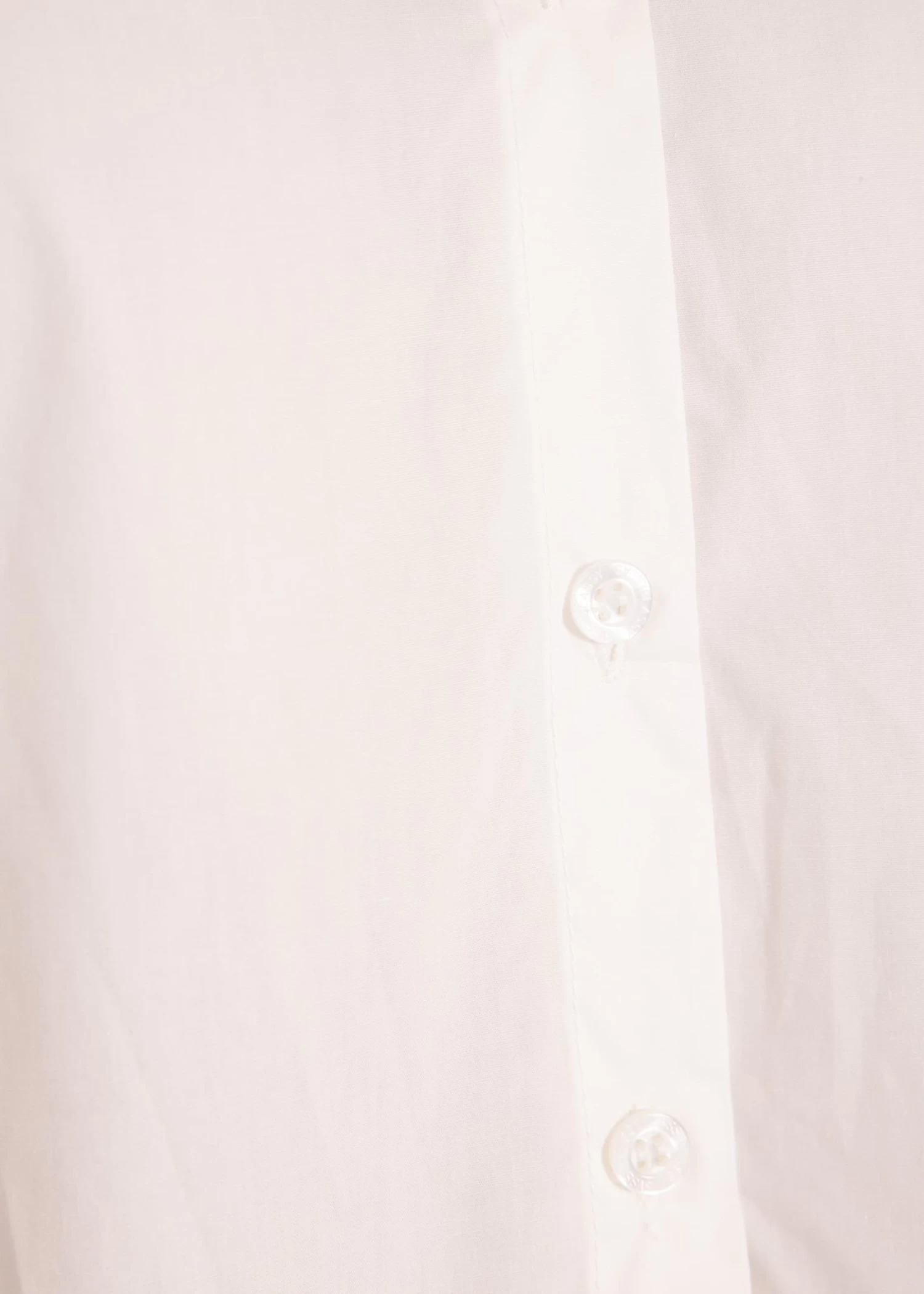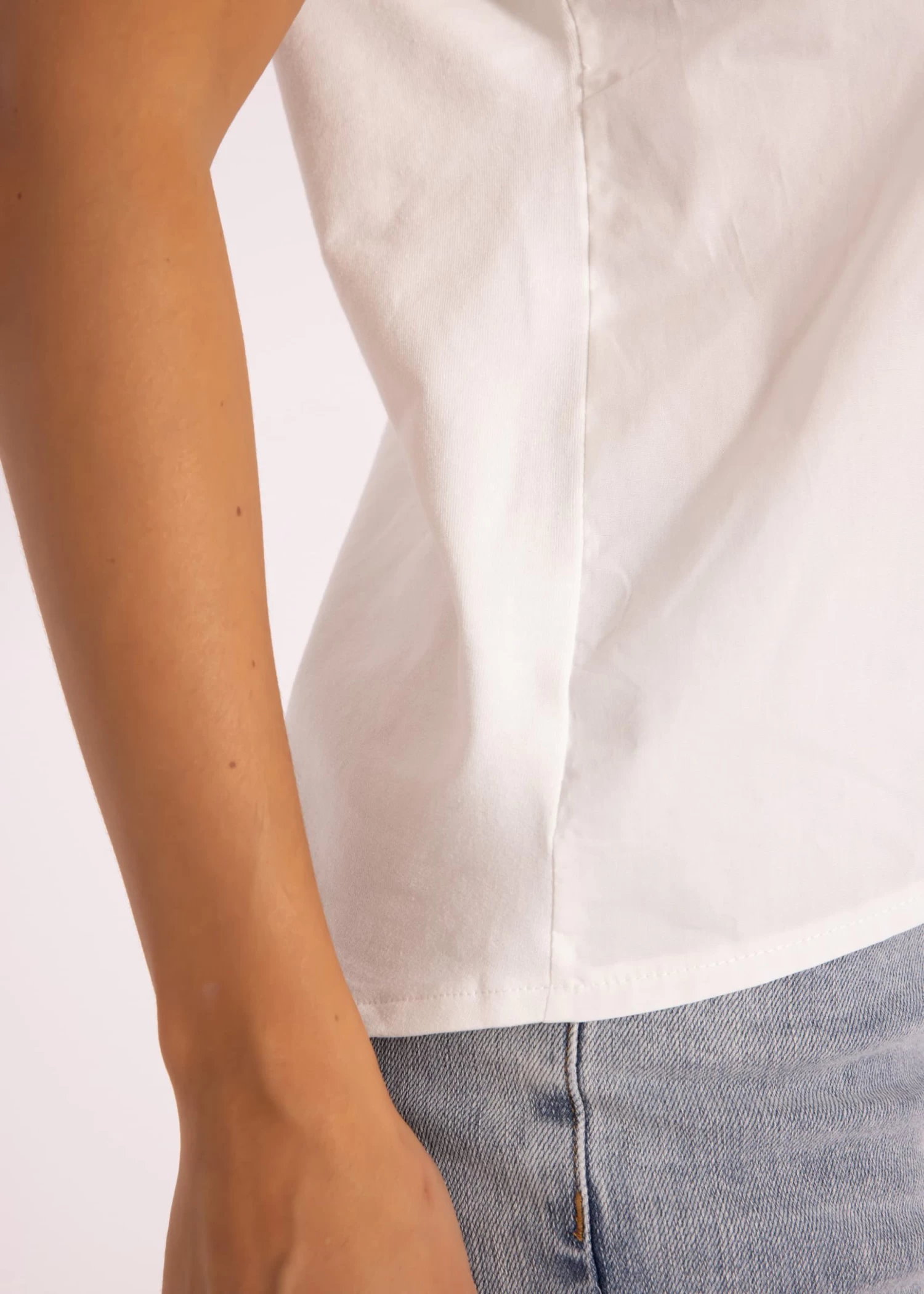 Popelin/Jersey Bluse in Offwhite. Dieses Modell besitzt einen klassischen Hemdblusenkragen, eine durchgehende Knopfleiste und angeschnittene, kurze Ärmel. Die Vorderseite der Bluse besteht aus Baumwoll-Popelin und verleiht dadurch einen eleganten Touch. Die Rückseite kommt in Baumwoll-Jersey und verleiht dadurch eine lässige Note. Das Design präsentiert sich in verkürzter Länge, lockerer Passform und fällt hinten etwas länger. Hervorzuheben sind die liebevoll gebrandeten Knöpfe mit SASSYCLASSY Logo. Trage diese Bluse mit einer Jeans und Sneakers für einen cleanen Look.