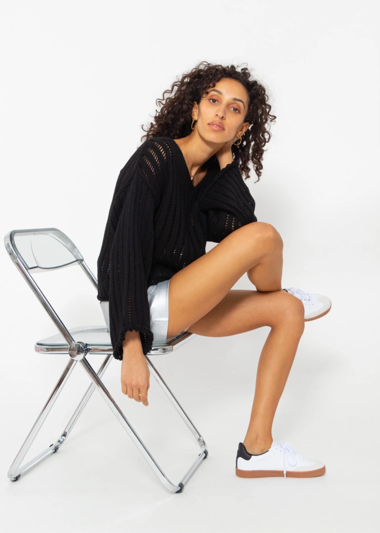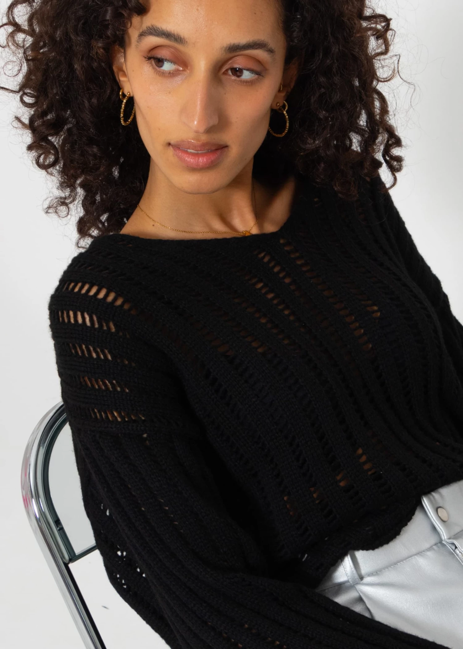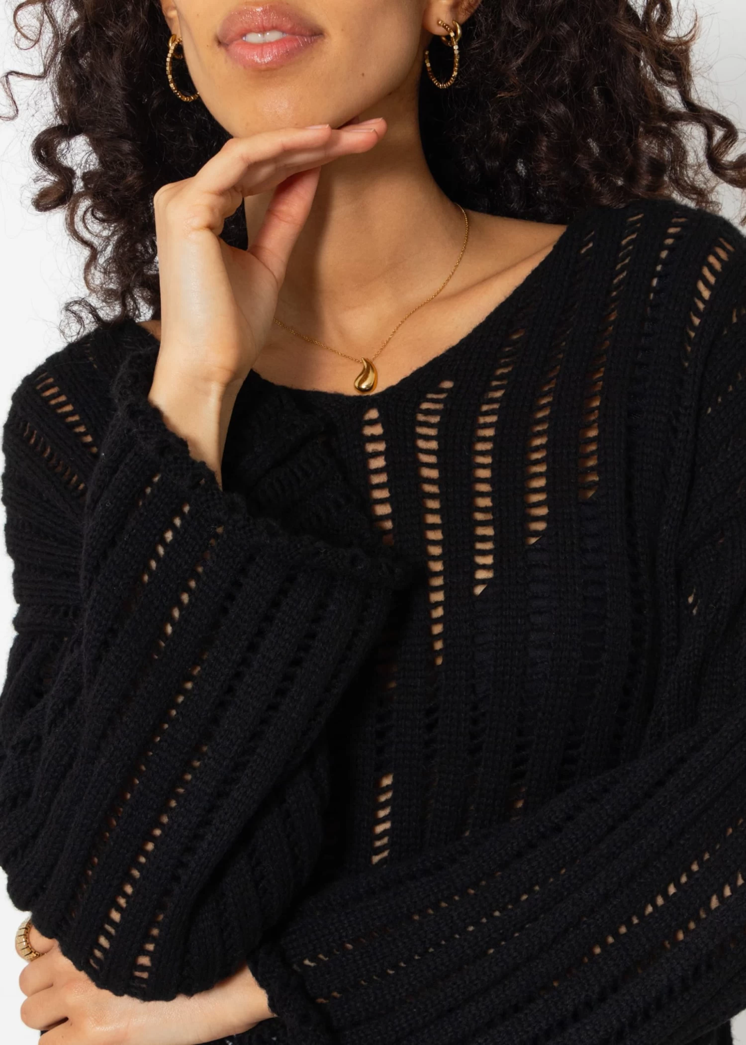 Dieser modische Pullover besticht durch sein auffälliges Leiterstich-Design, das für eine attraktive Transparenz sorgt und zugleich einen Hauch von Raffinesse vermittelt. Das Modell präsentiert einen V-Ausschnitt und eine Oversize Passform mit weiten Ärmeln, die dem Modell seinen lässigen Charakter verleihen und ausreichend Bewegungsfreiheit bieten. Die gestrickten Details im Leiterstich verlaufen über den gesamten Pullover und kreieren einen interessanten visuellen Effekt. Der Pullover in verkürzter Länge lässt sich sowohl zu eleganten Anlässen als auch im Alltag vielseitig kombinieren.