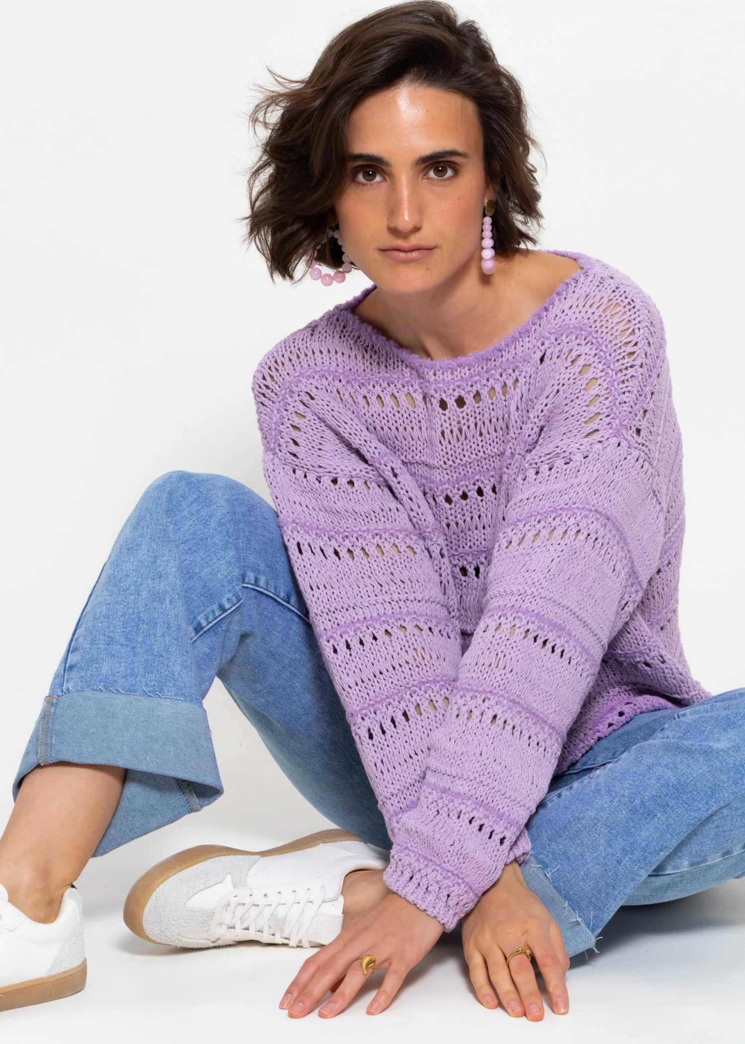 Verleihe deinem Outfit eine zarte und luftige Note mit diesem Ajour-Strickpullover. Das durchbrochene Strickmuster fügt dem Design eine subtile Transparenz hinzu, die stilvoll als auch elegant ist. Das Modell besitzt eine entspannte Silhouette, überschnittene Schultern und einen weiten Rundhalsausschnitt. Der Pullover ist nicht nur ein Blickfang, sondern auch ein Ausdruck von Raffinesse und modischem Bewusstsein.